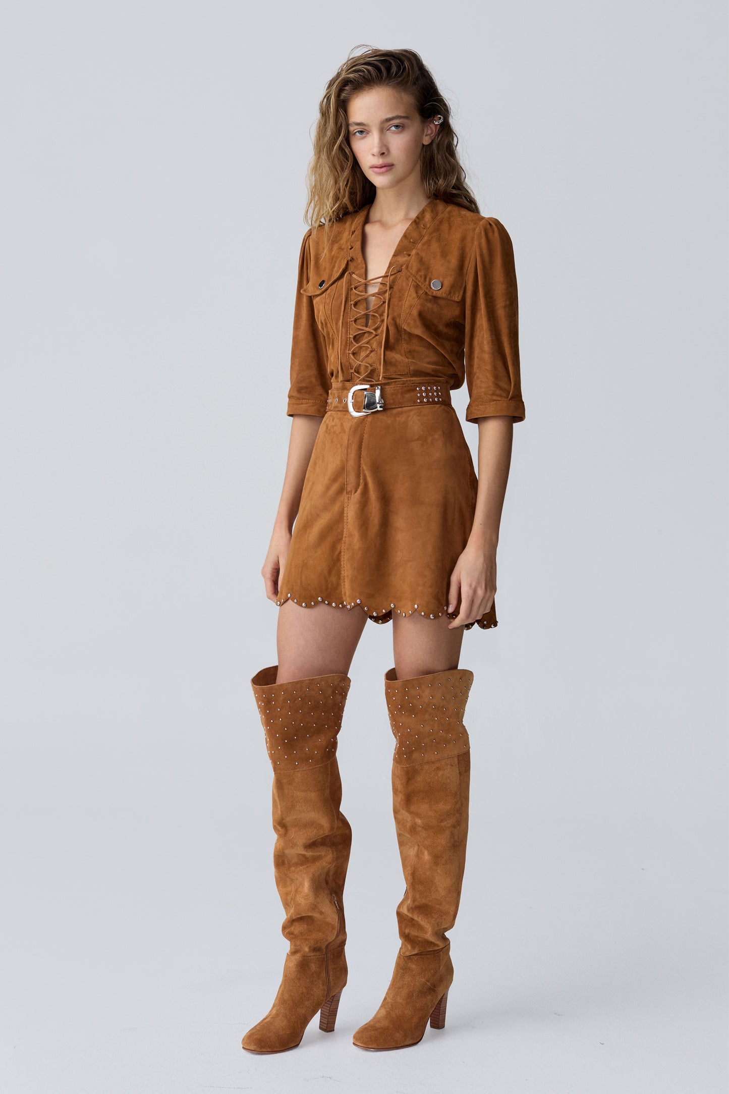 Falda en gamuza con lazo en cintura tipo cinto con remaches metálicos y hebilla con pasador y puntera metálicos. Ruedo con onditas y remaches metálicos siguiendo la forma en todo el contorno. Fit recto