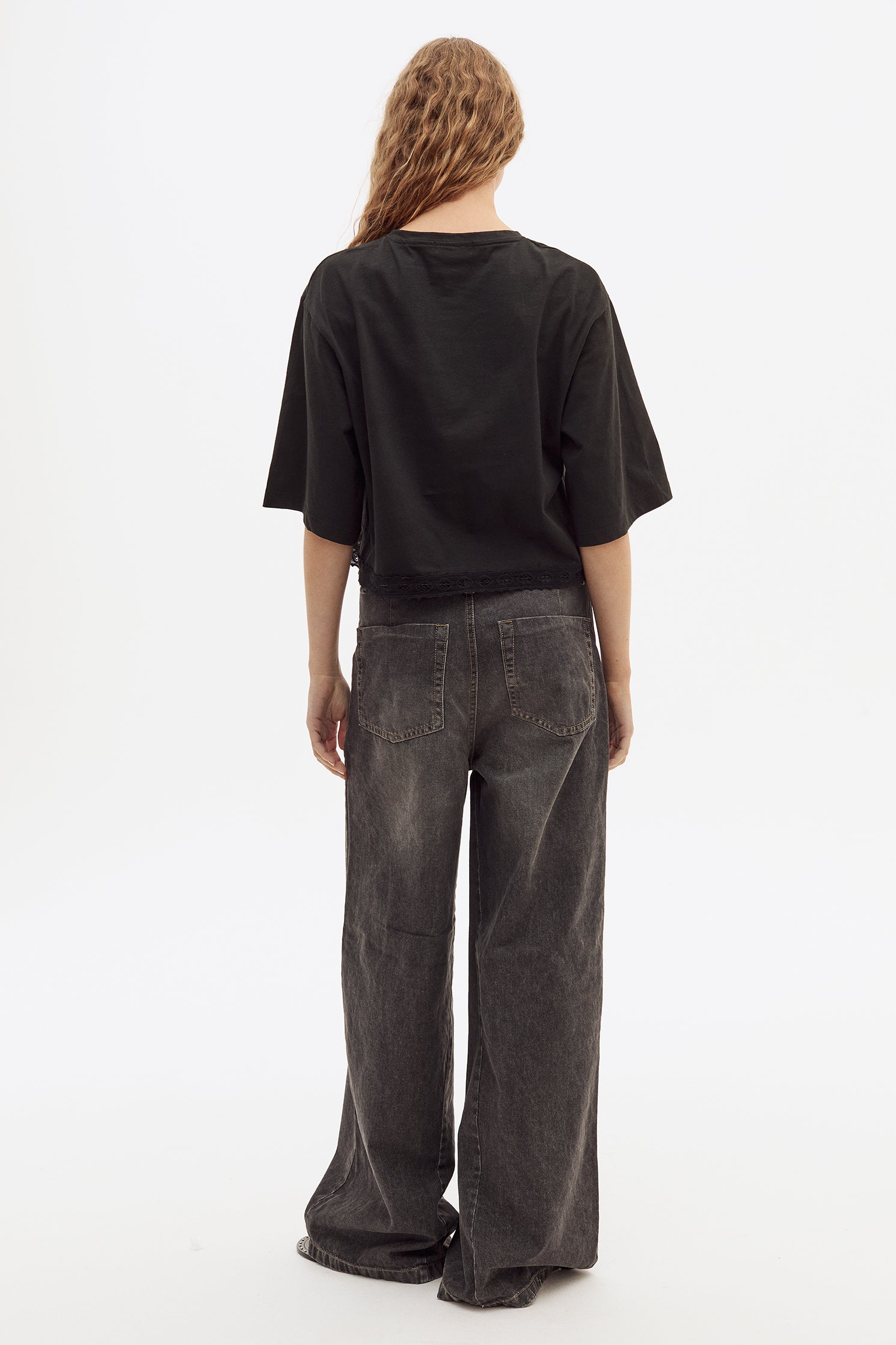 Remera cropped de jersey pima, manga amplia. Detalles de puntilla en pecho y