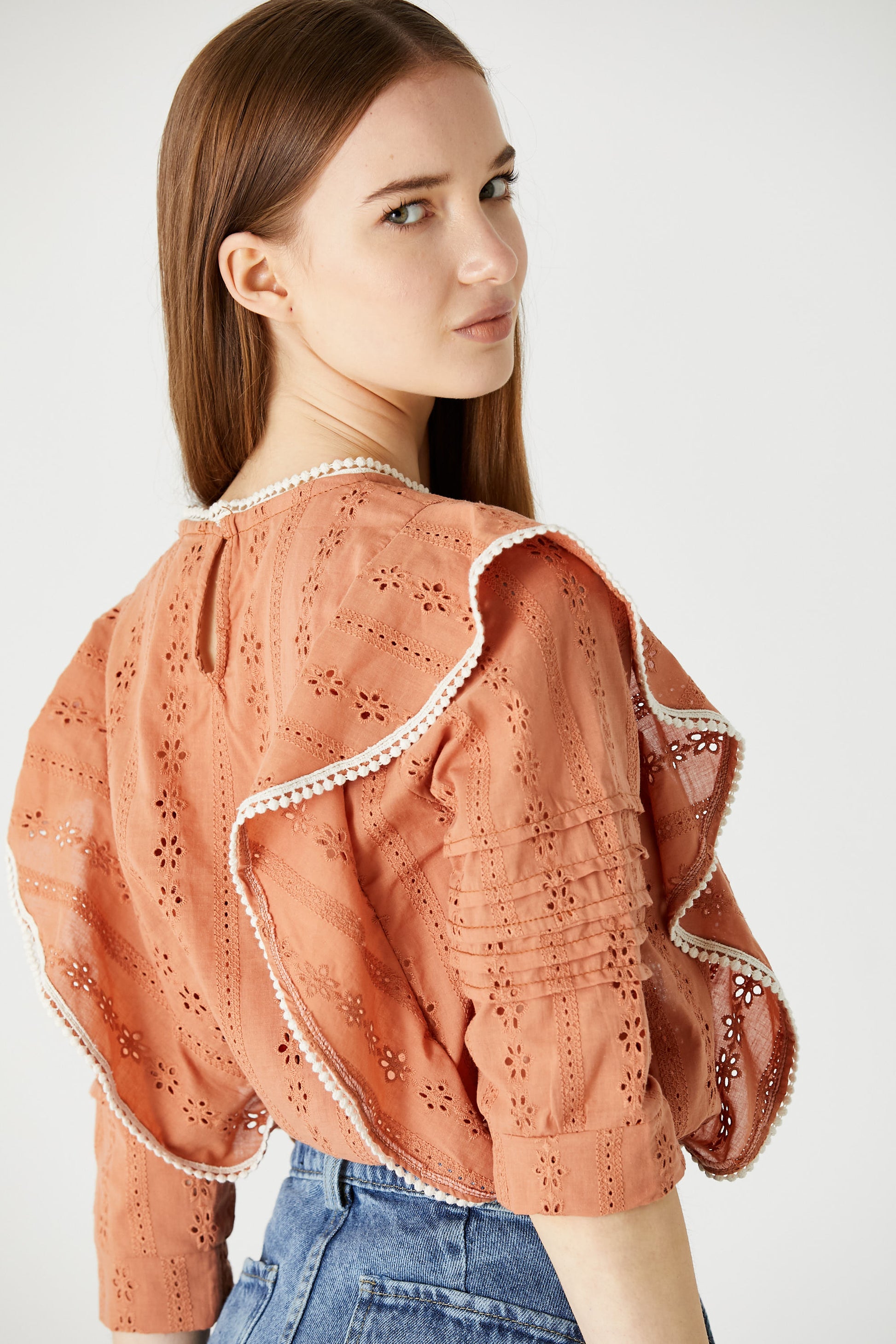 Blusa manga 3/4 con volados en broderie y puntilla.