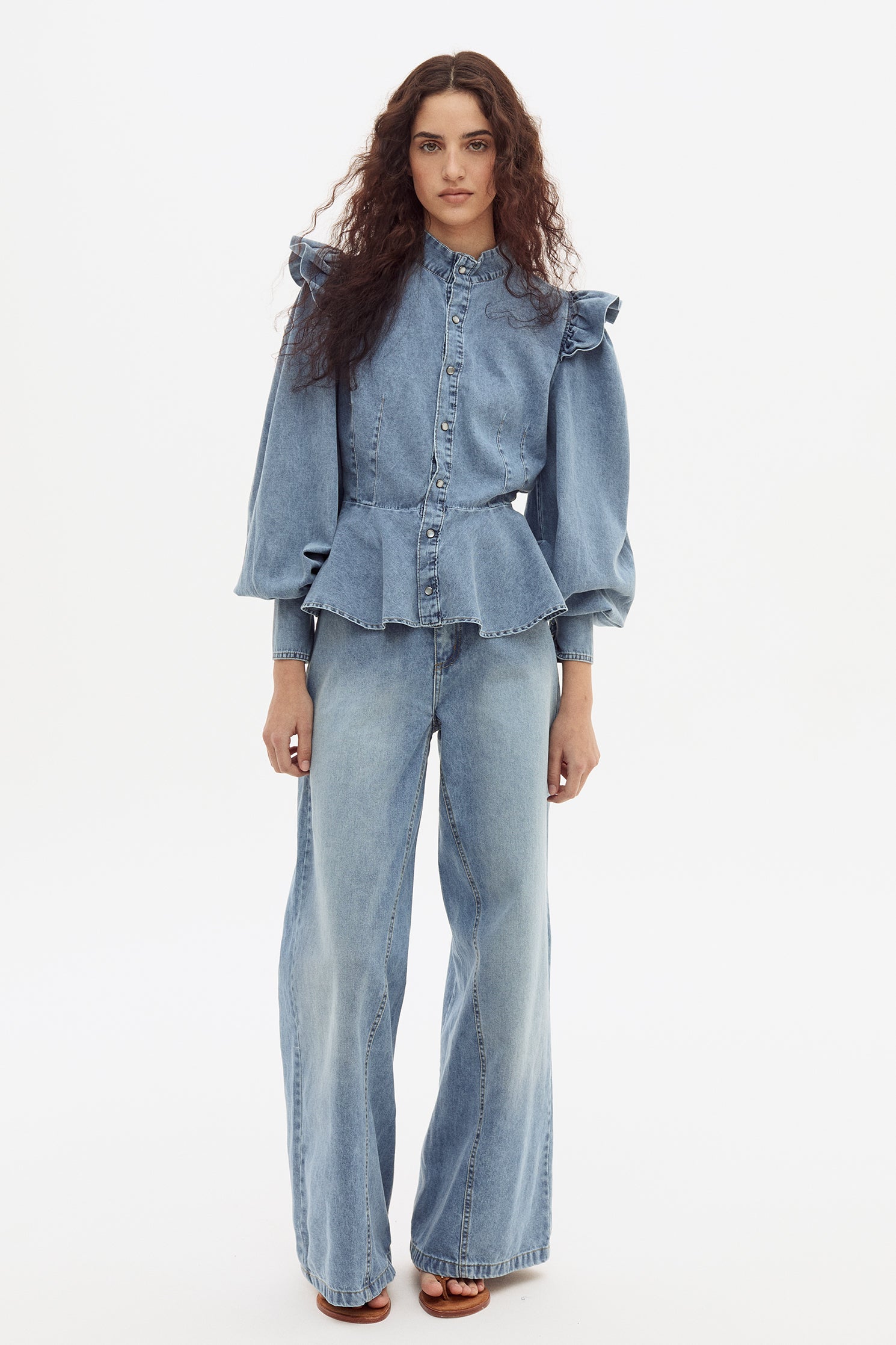 Blusa en denim camisero de algodón con cartera centralcon broches metálicos, mangas con volúmen y volados en sisa. Fit al cuerpo hasta recorte en cintura y hacia abajo tiene vuelo. Largo regular a la cadera.