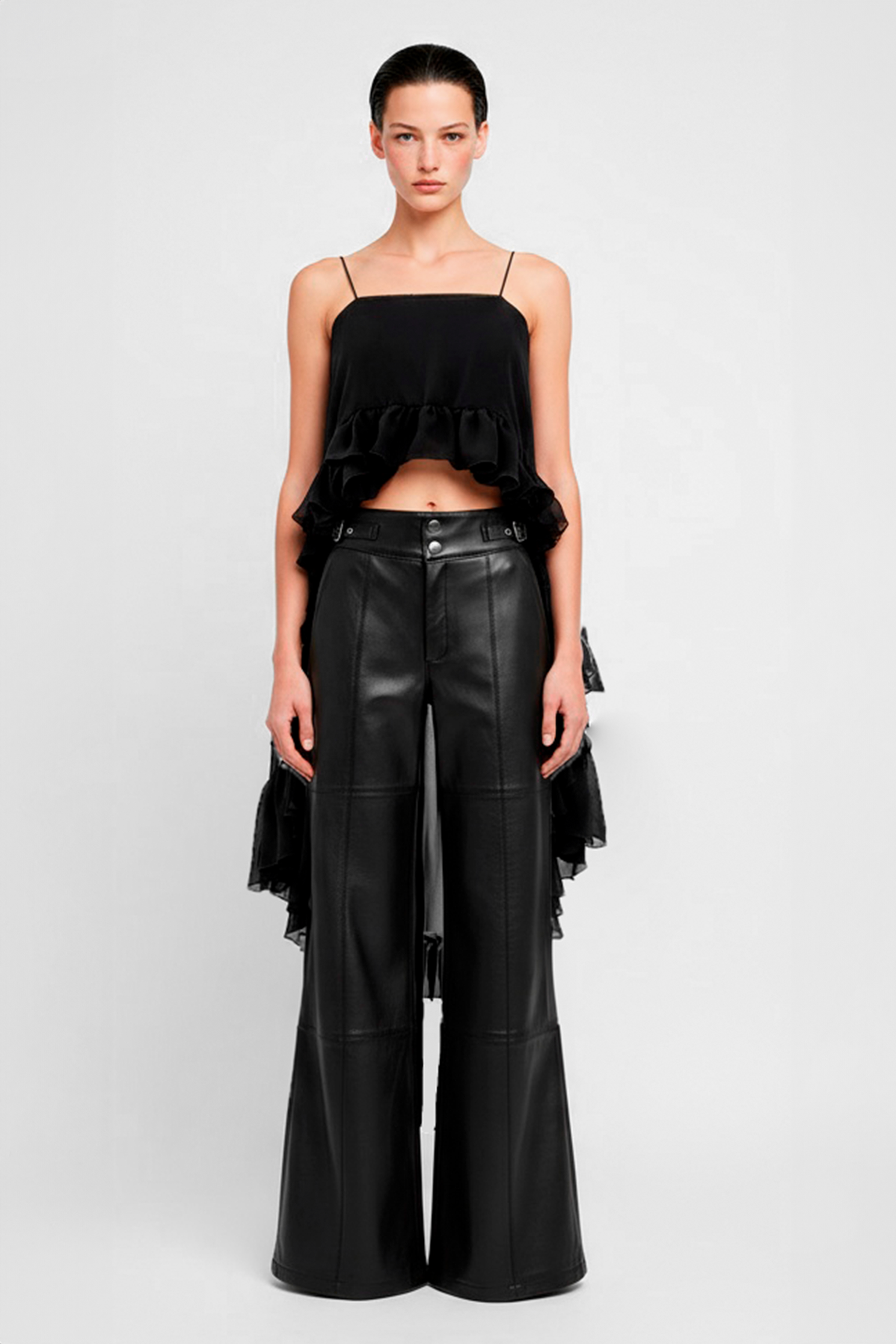Top de breteles finos tubulares en gasa, largo por debajo de cadera, recorrido de volados en escote y laterales, con tajo lateral justo debajo de la altura de la cintura.