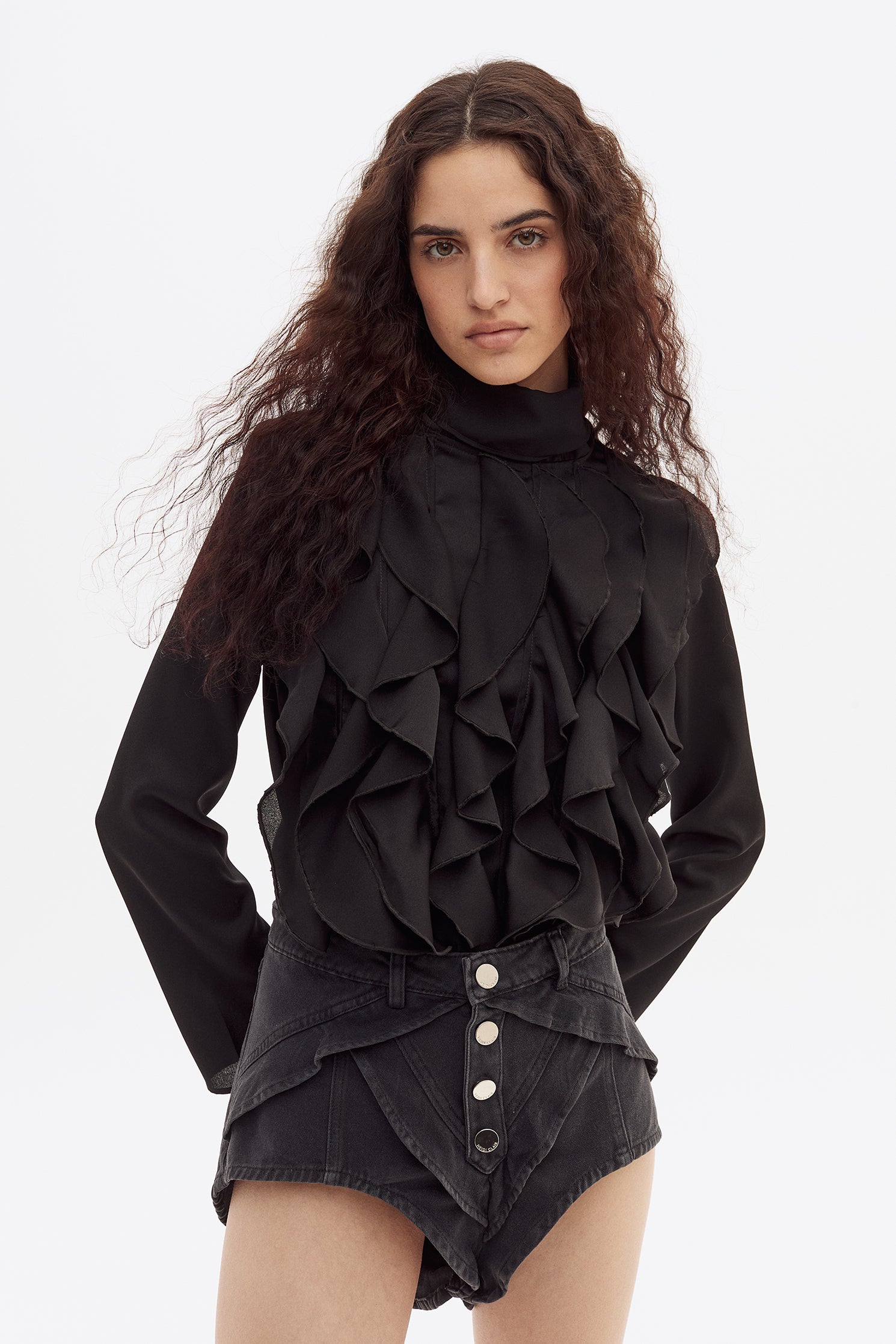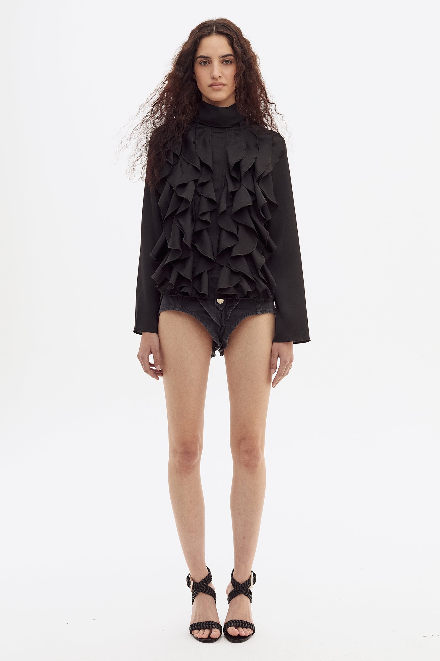 Blusa manga larga con lazo en cuello y volados verticales en el frente. Realizado en una gasa super suave y con caida.