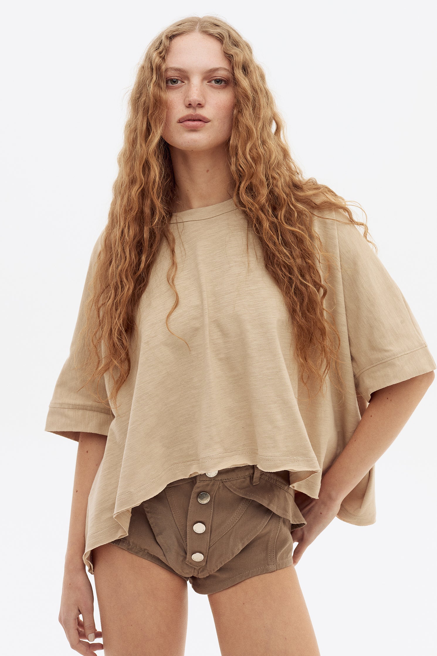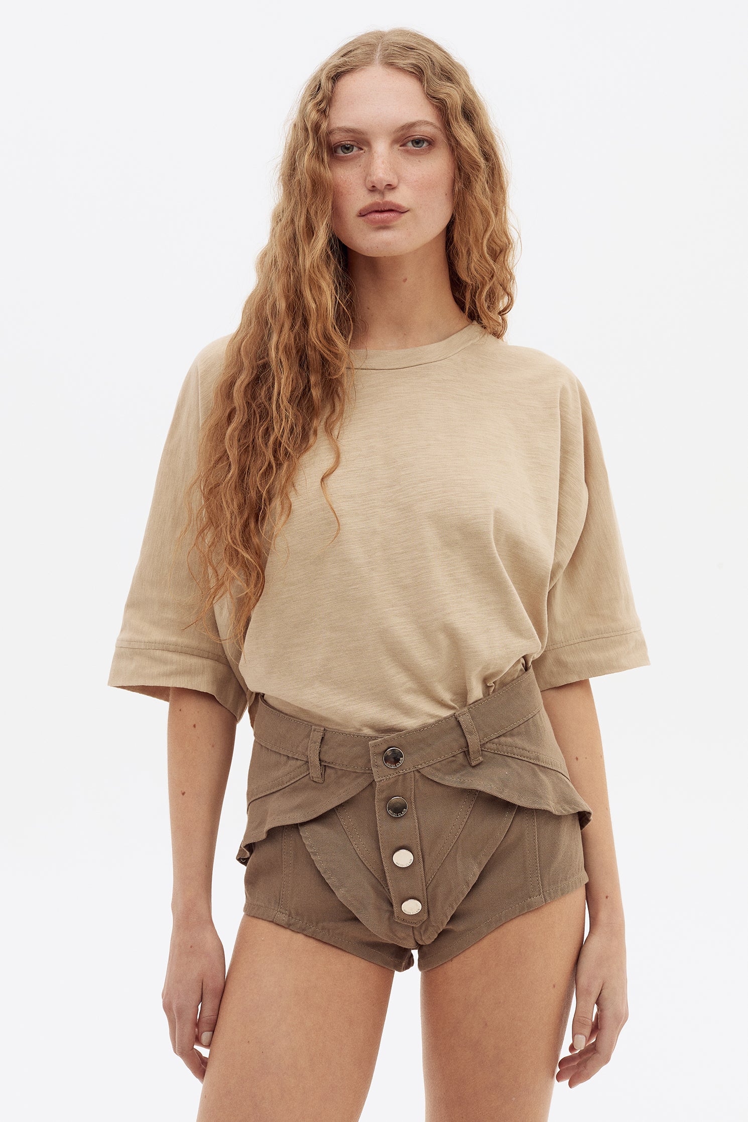 Short en gabardina de algodón. Detalle de volados diagonales en