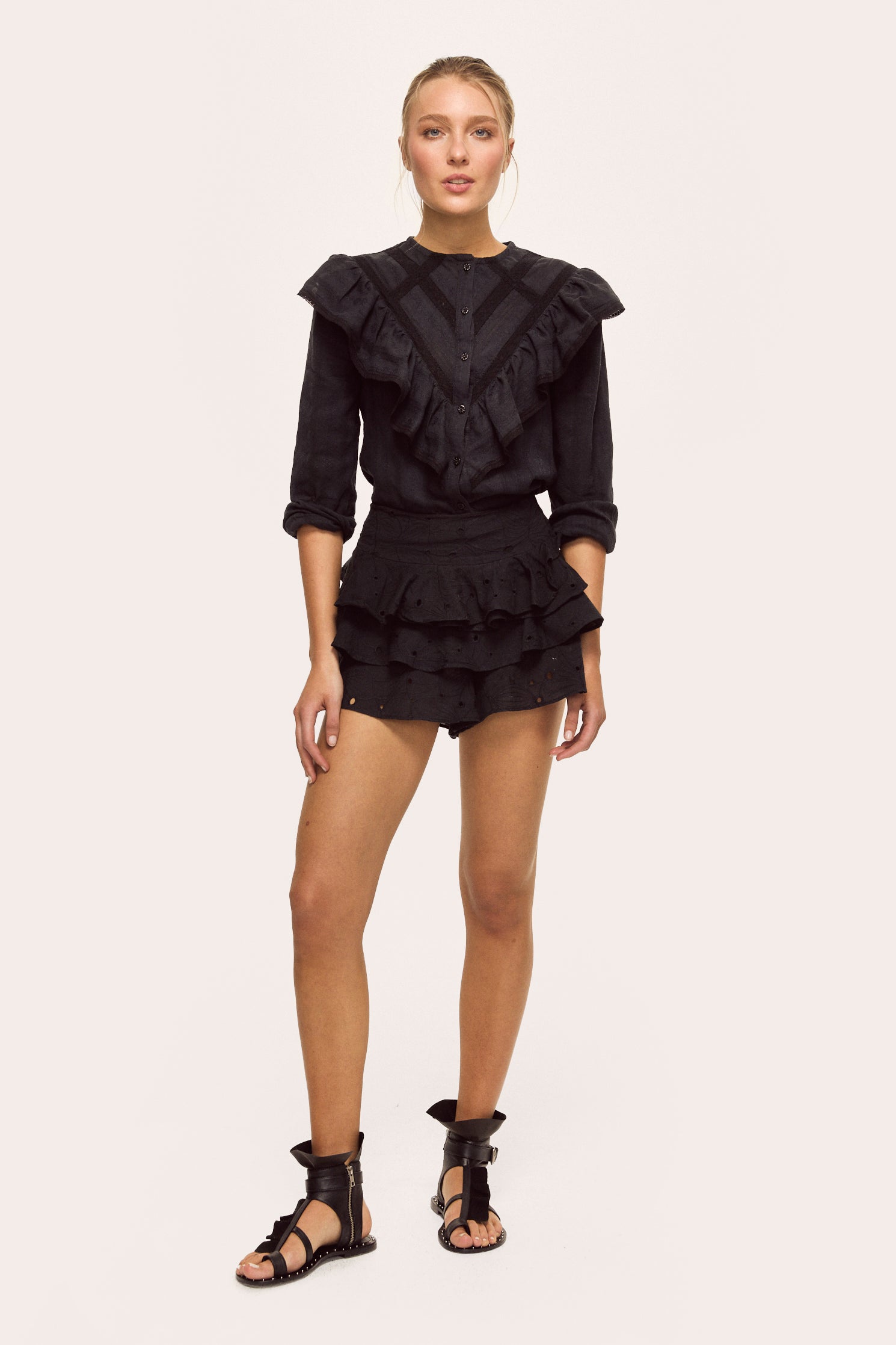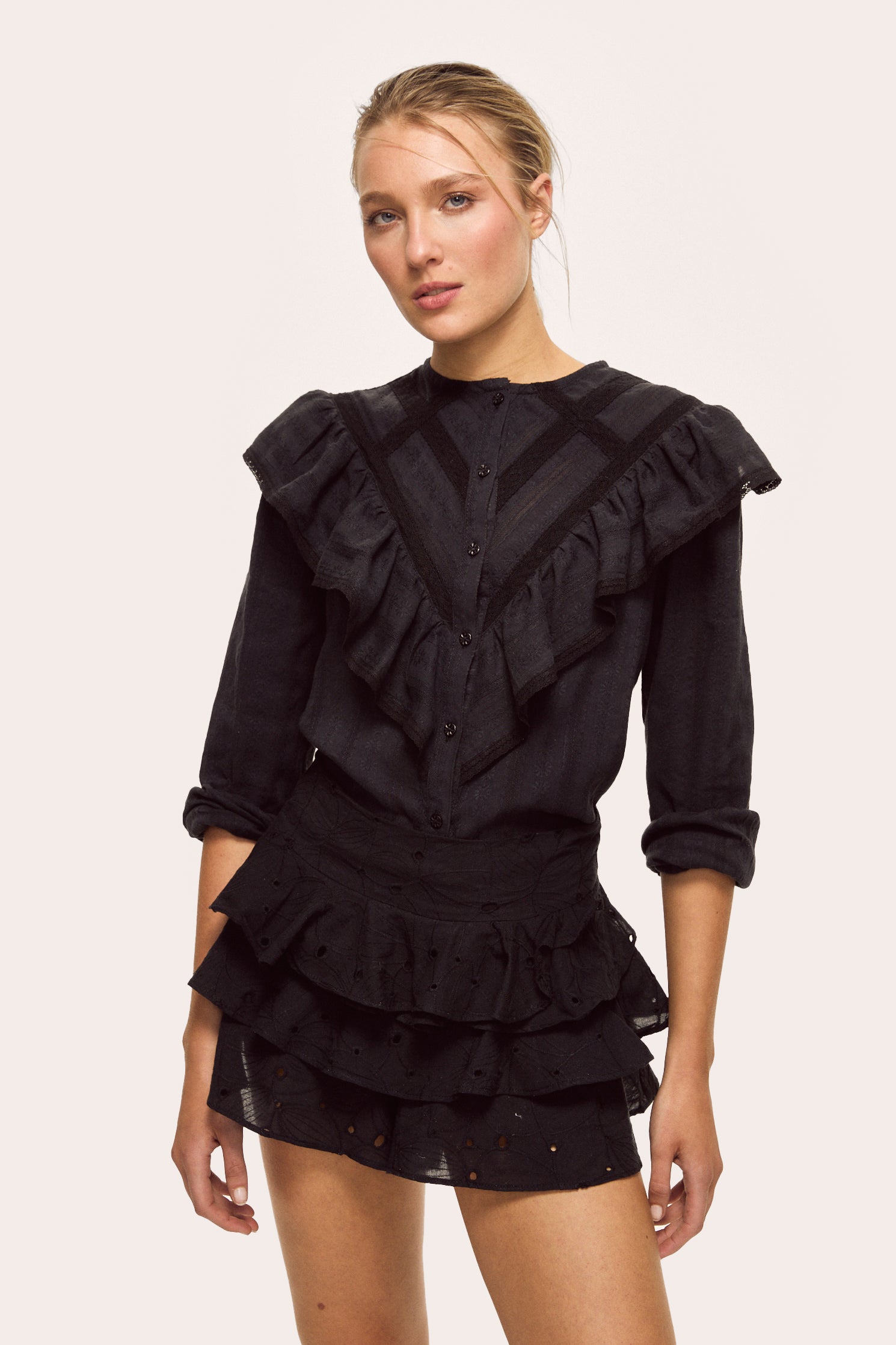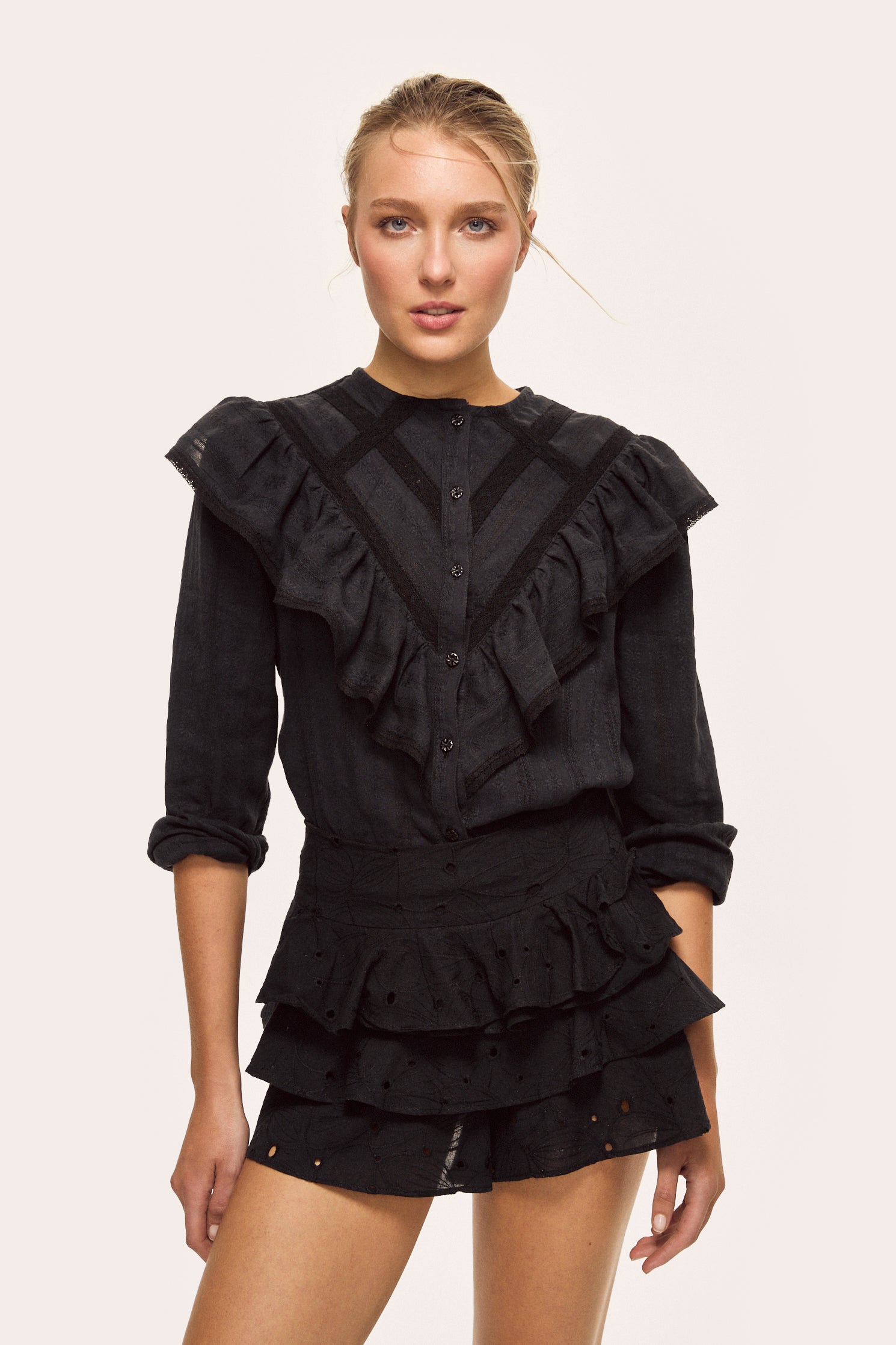 Blusa de rattier 100% algodón con canesú en V y volados en todo su contorno con puntilla de terminación. Sobre el canesú tiene recortes intercalados con galones. Tiene mangas largas y cartera central con botones. Fit recto y largo regular a la primer cadera