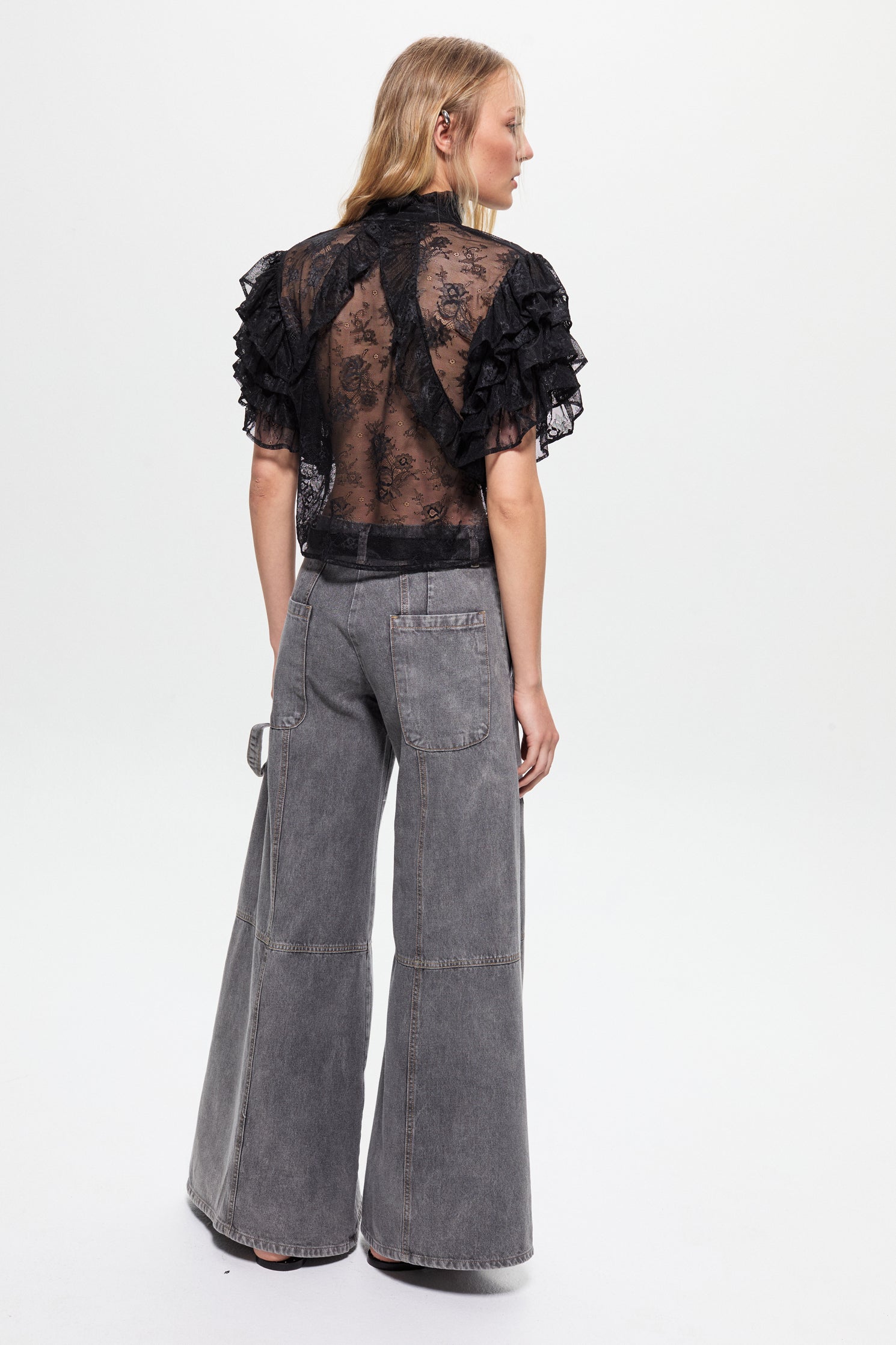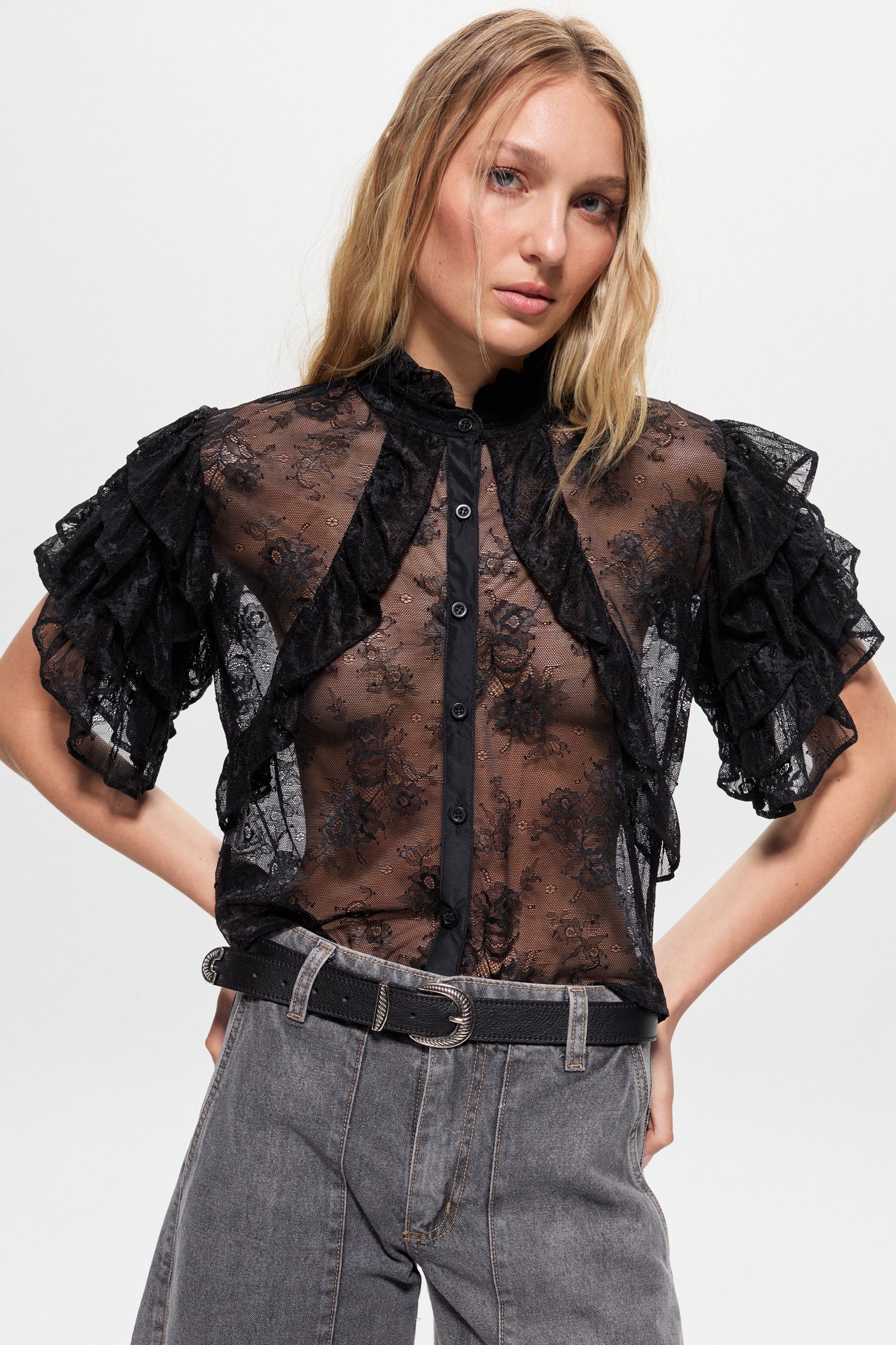 Blusa de encaje con capas de volados superpuestos en el contorno de sisa. Tiene botones en delantero como acceso, fit al cuerpo y largo regular a la cintura.