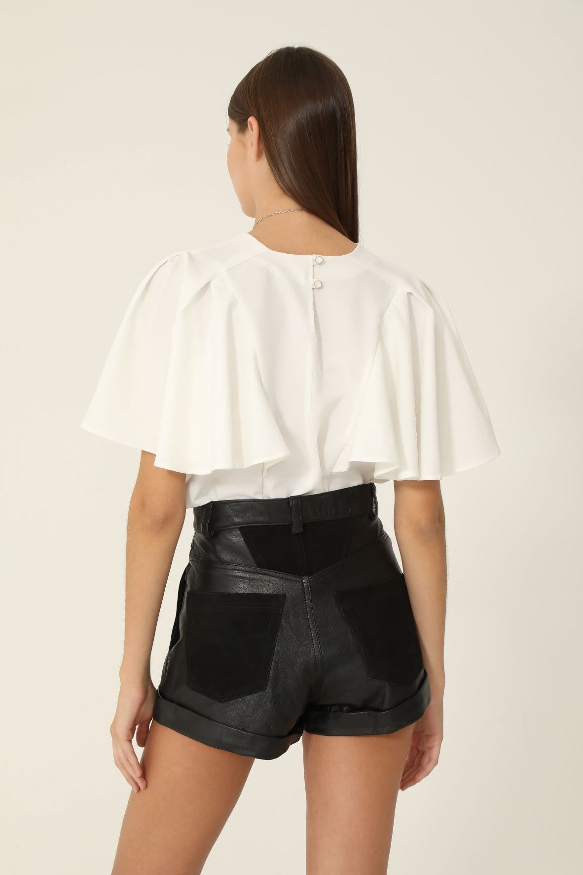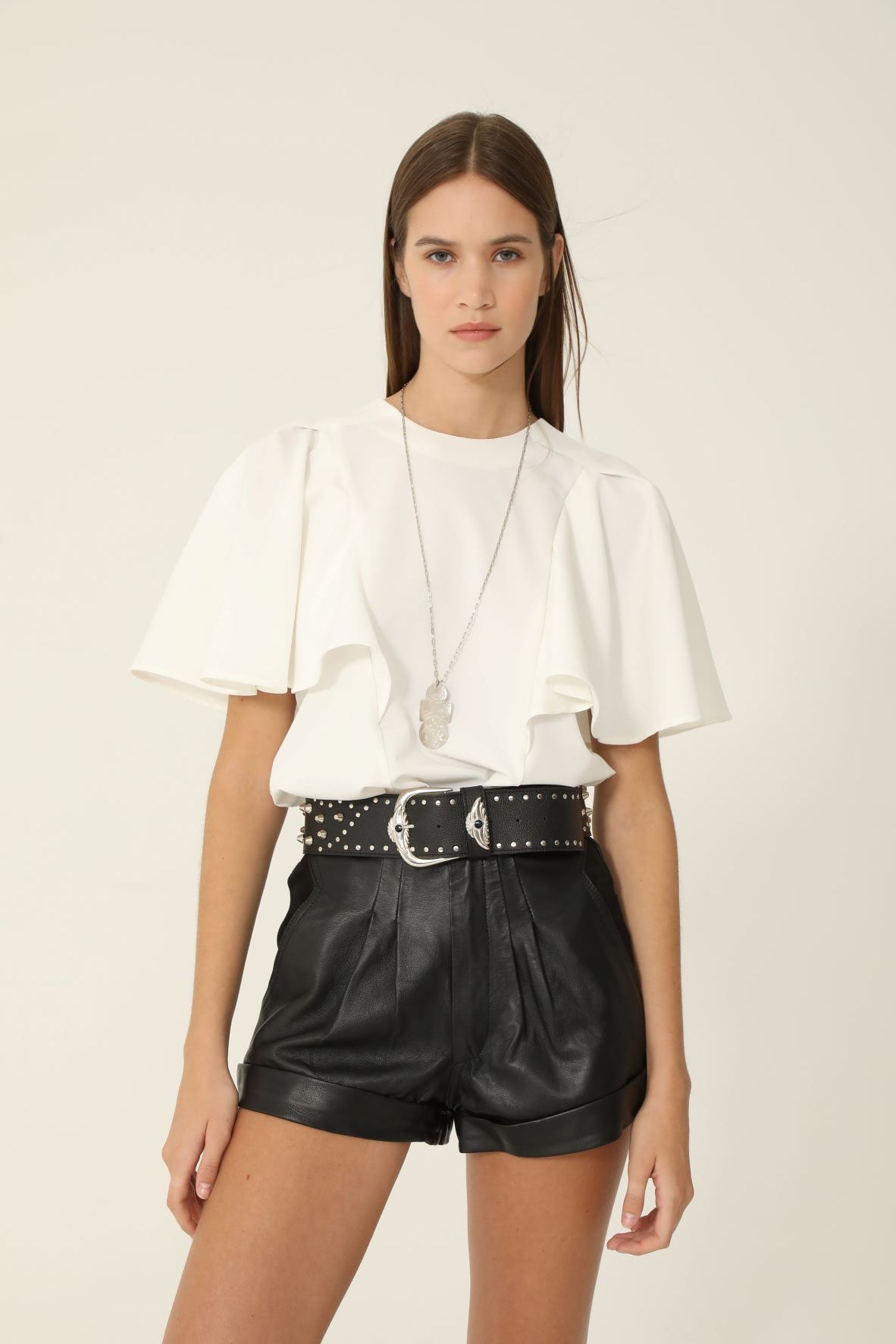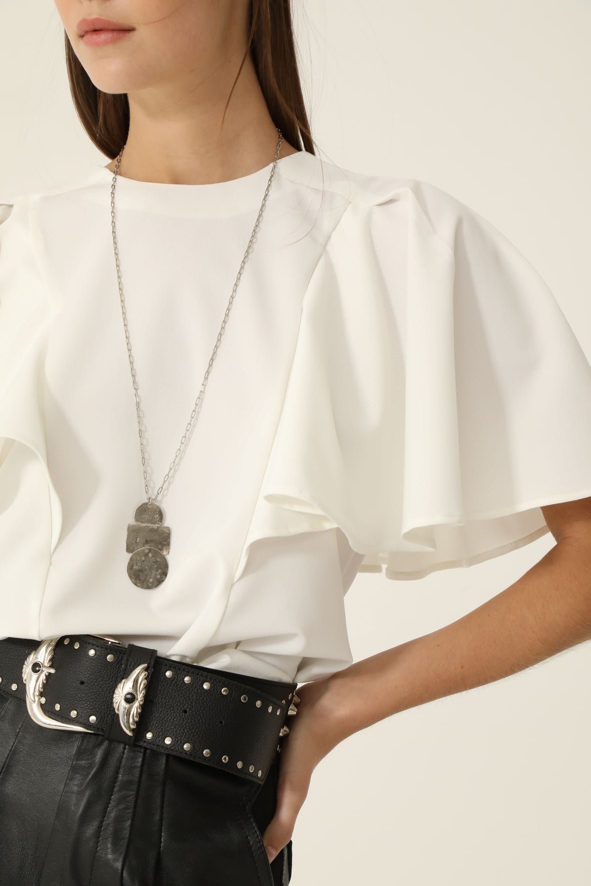 Blusa en creppe liviano con volados como manga que se continúan en delantero y espalda. Fit recto y largo regular a la primer cadera.
