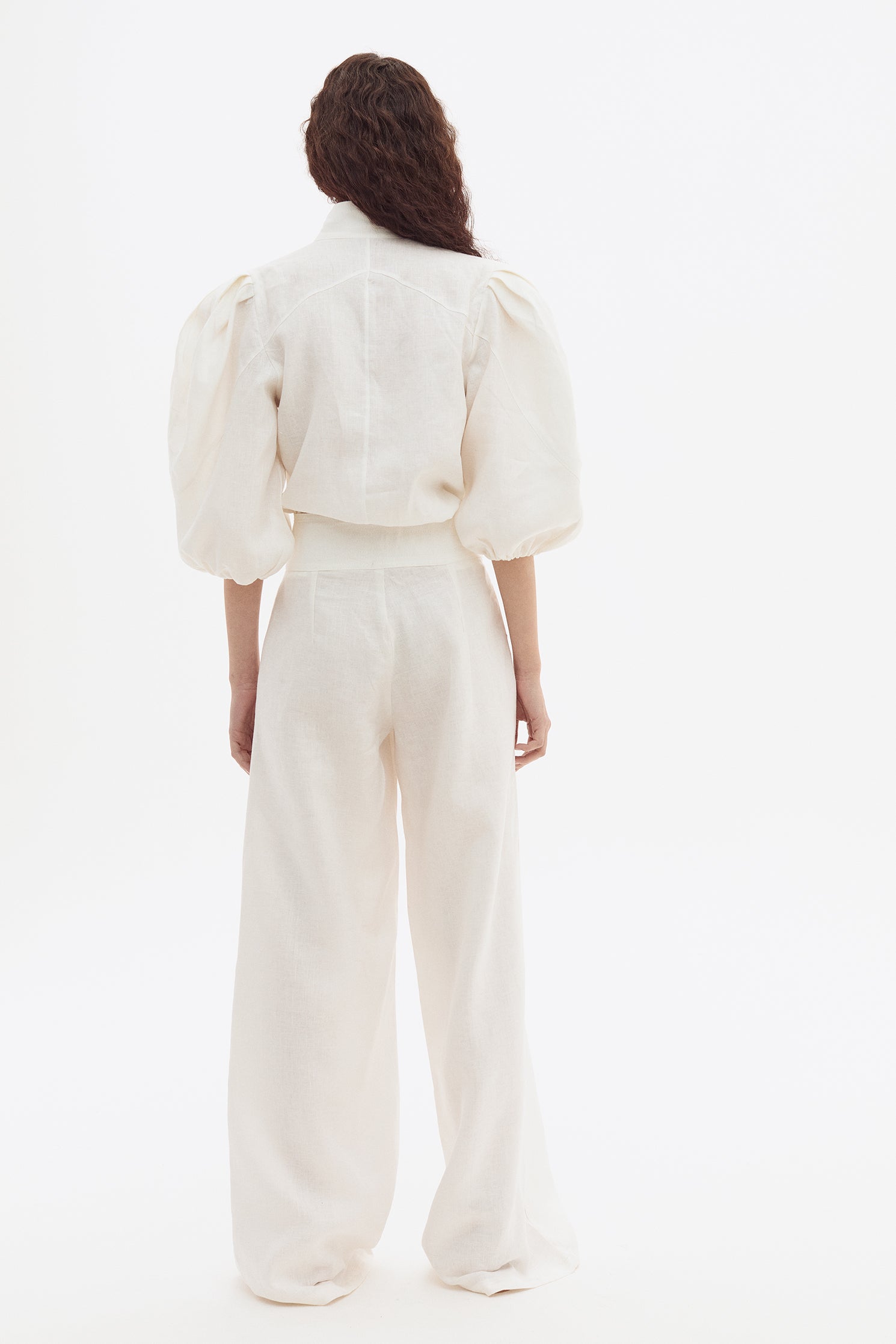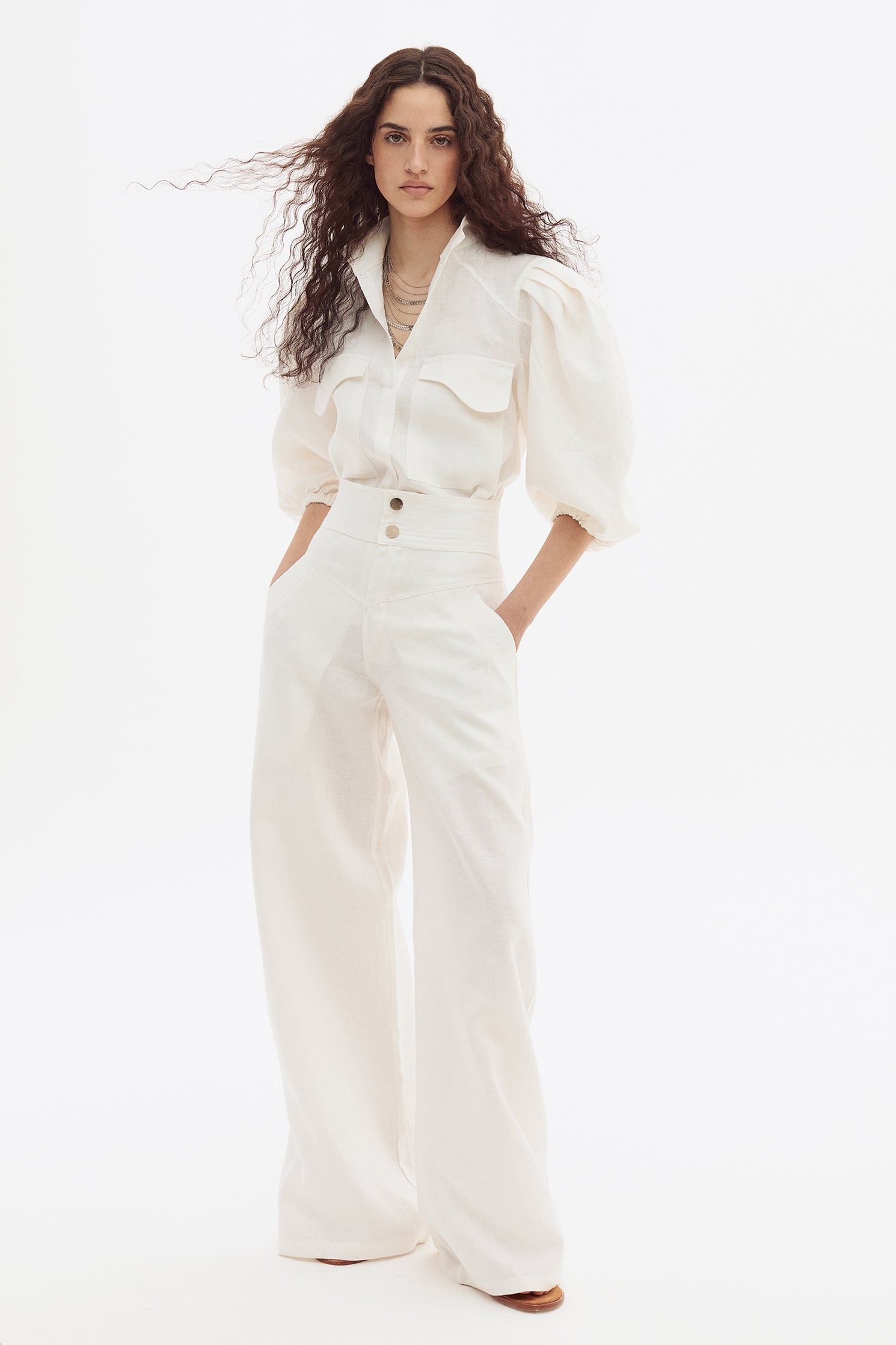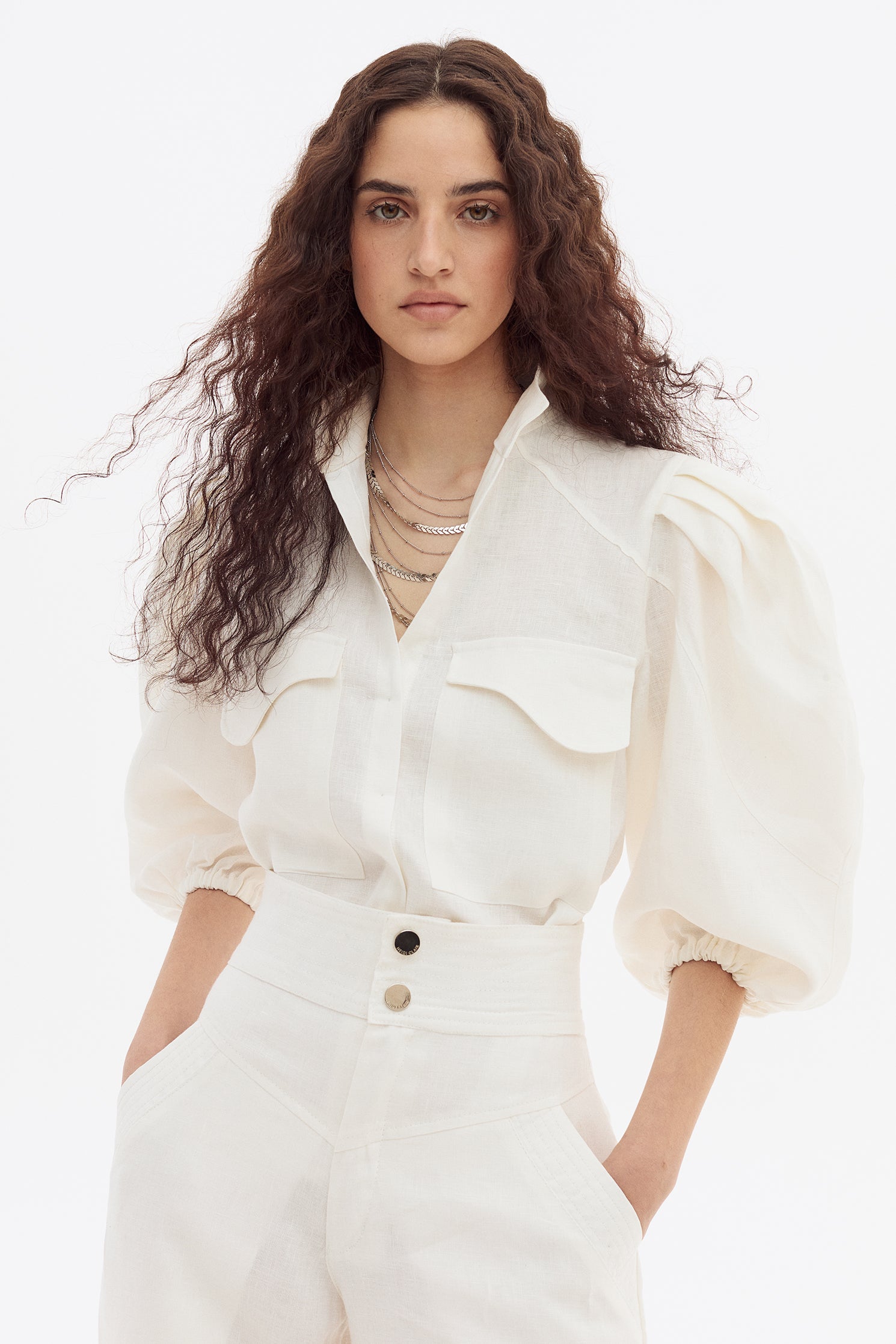 Blusa 100% LINO con BOTONES en delantero y tapas, bolsillos. Mangas 3/4 con volúmen TIPO BALLOON y recorte diagonal.