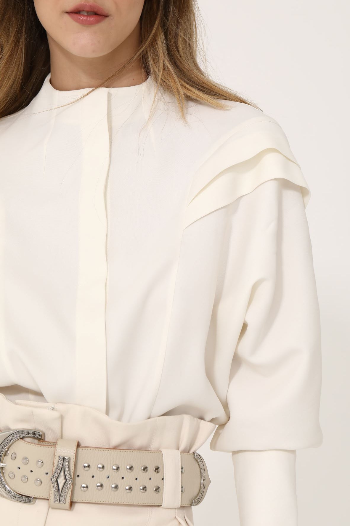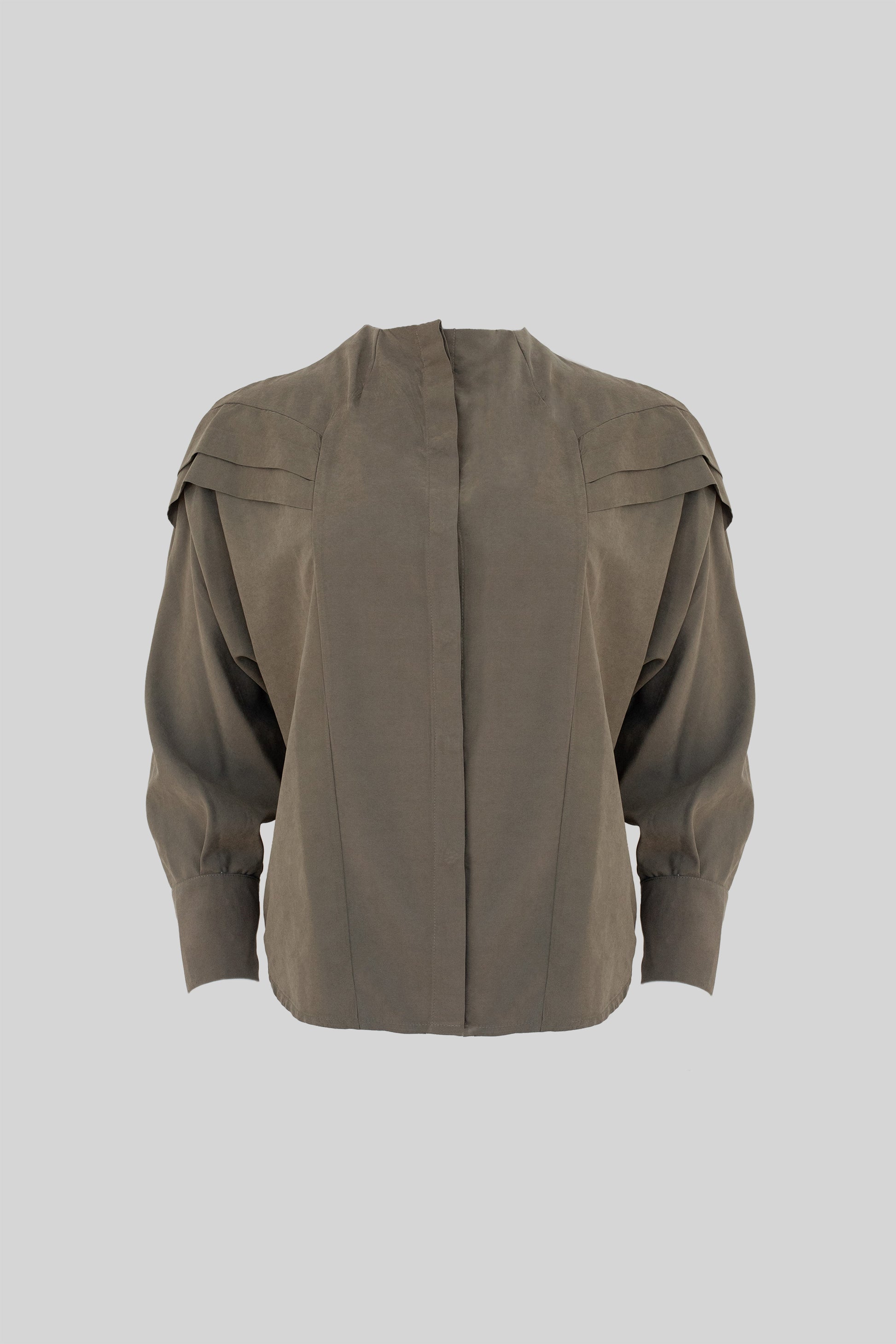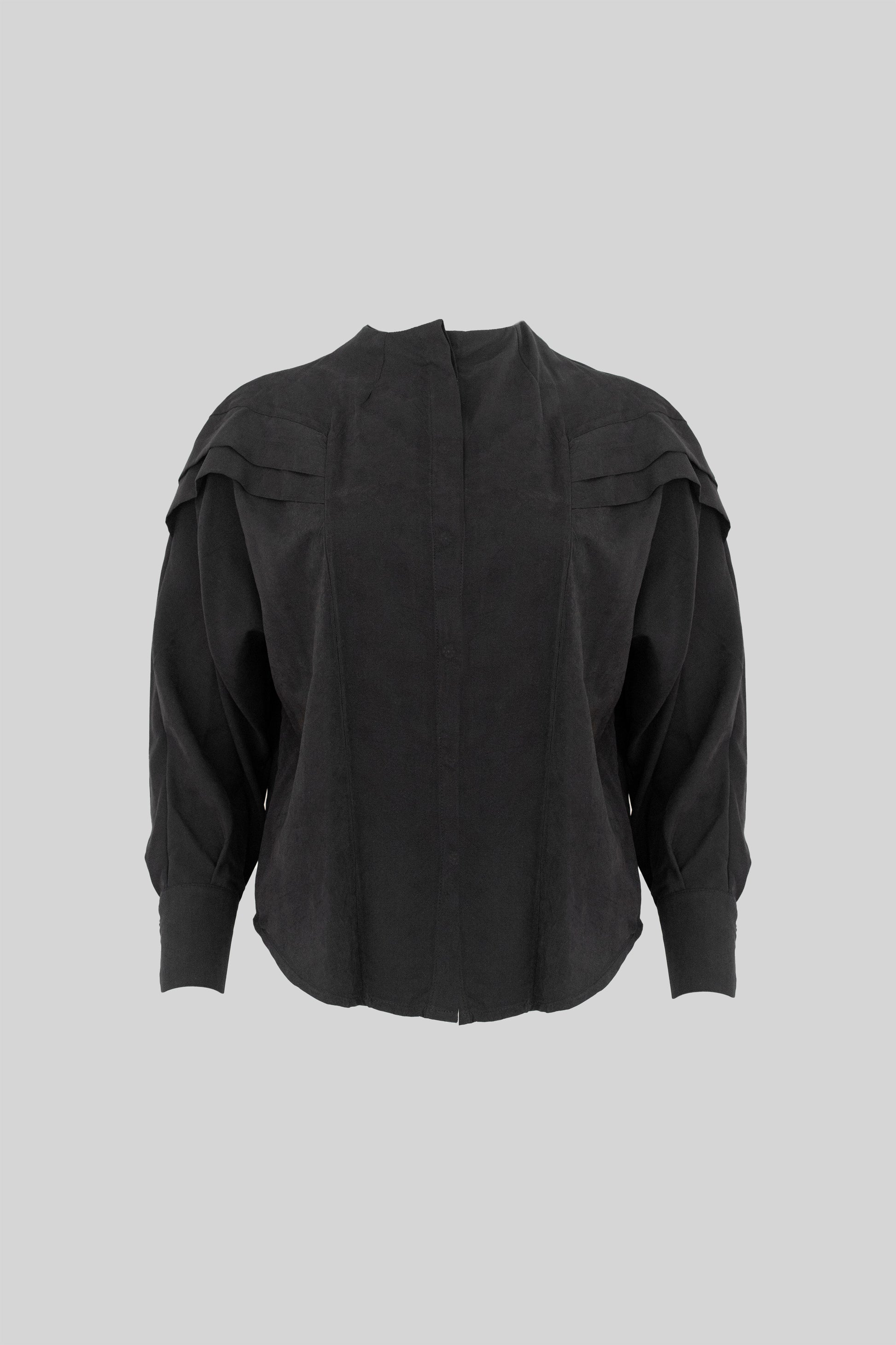 Camisa escote a la base, con cartera escondido y tablas en manga que se continúan al delantero, no tiene sisa tradicional.