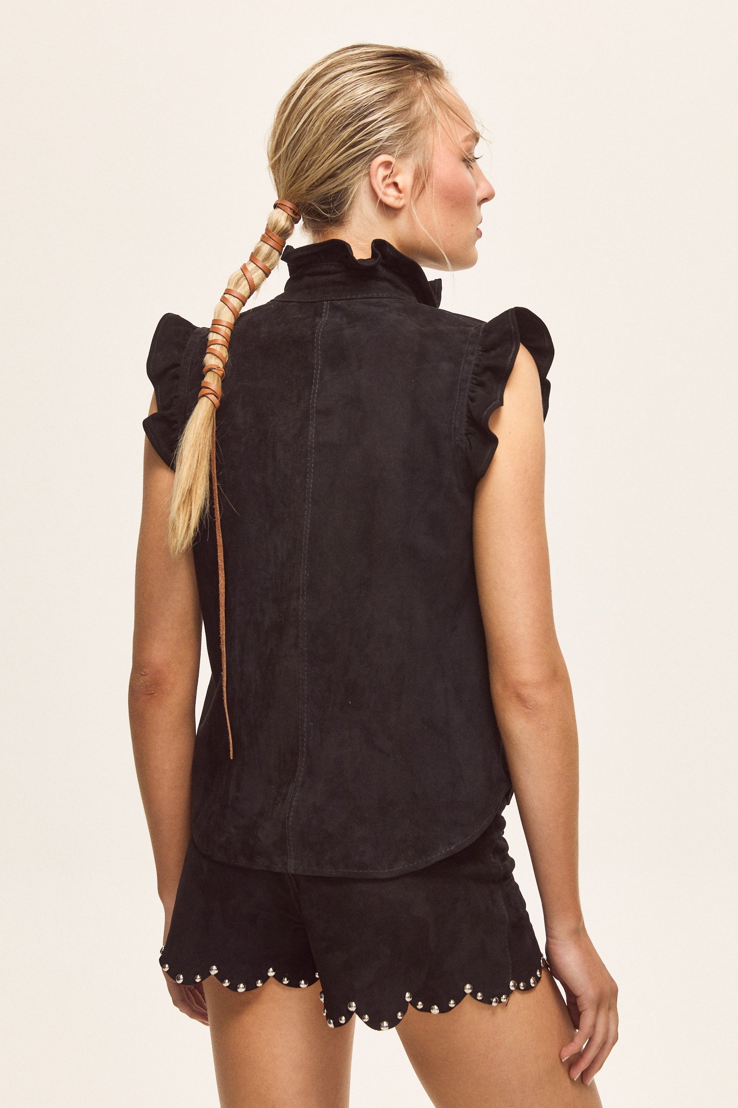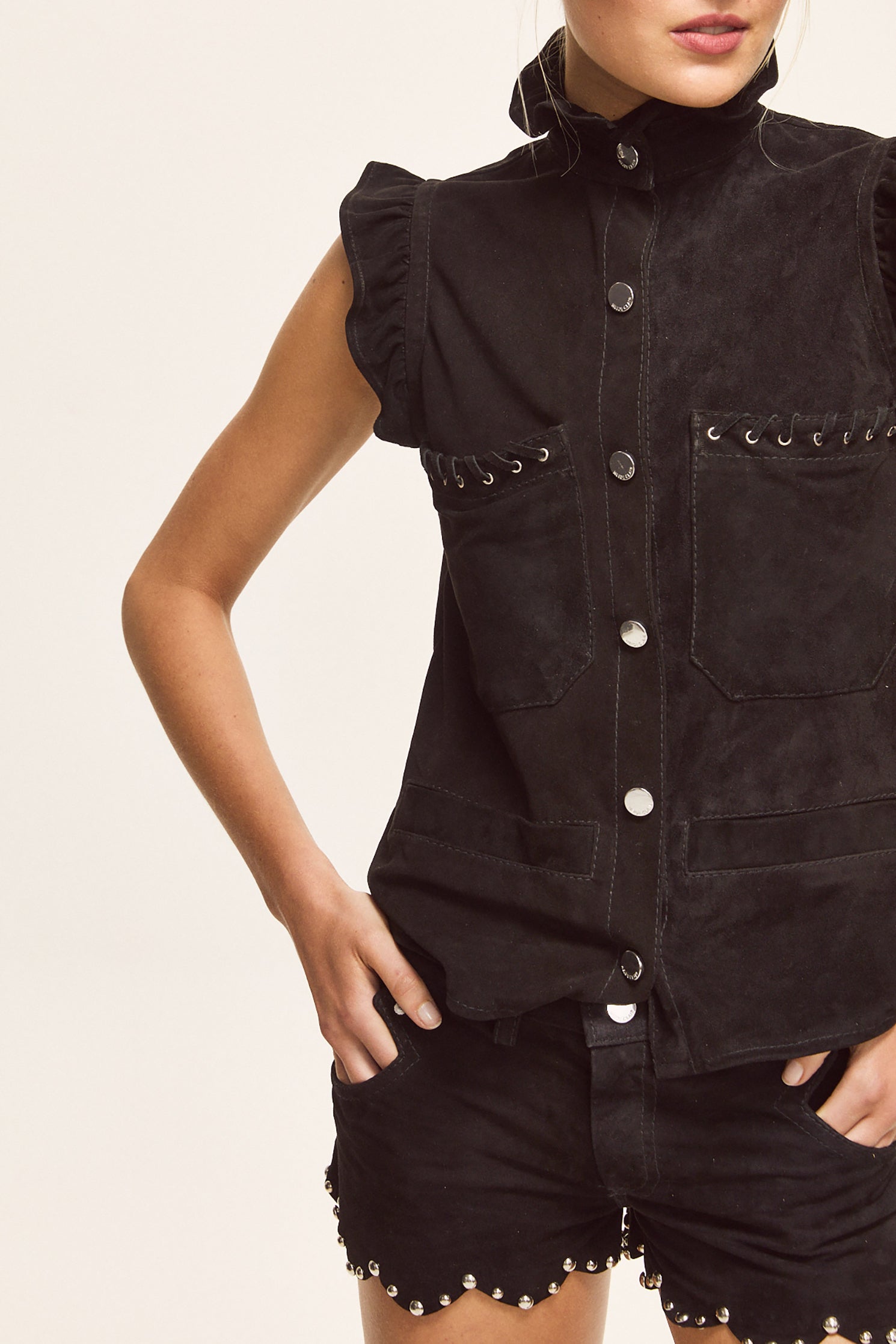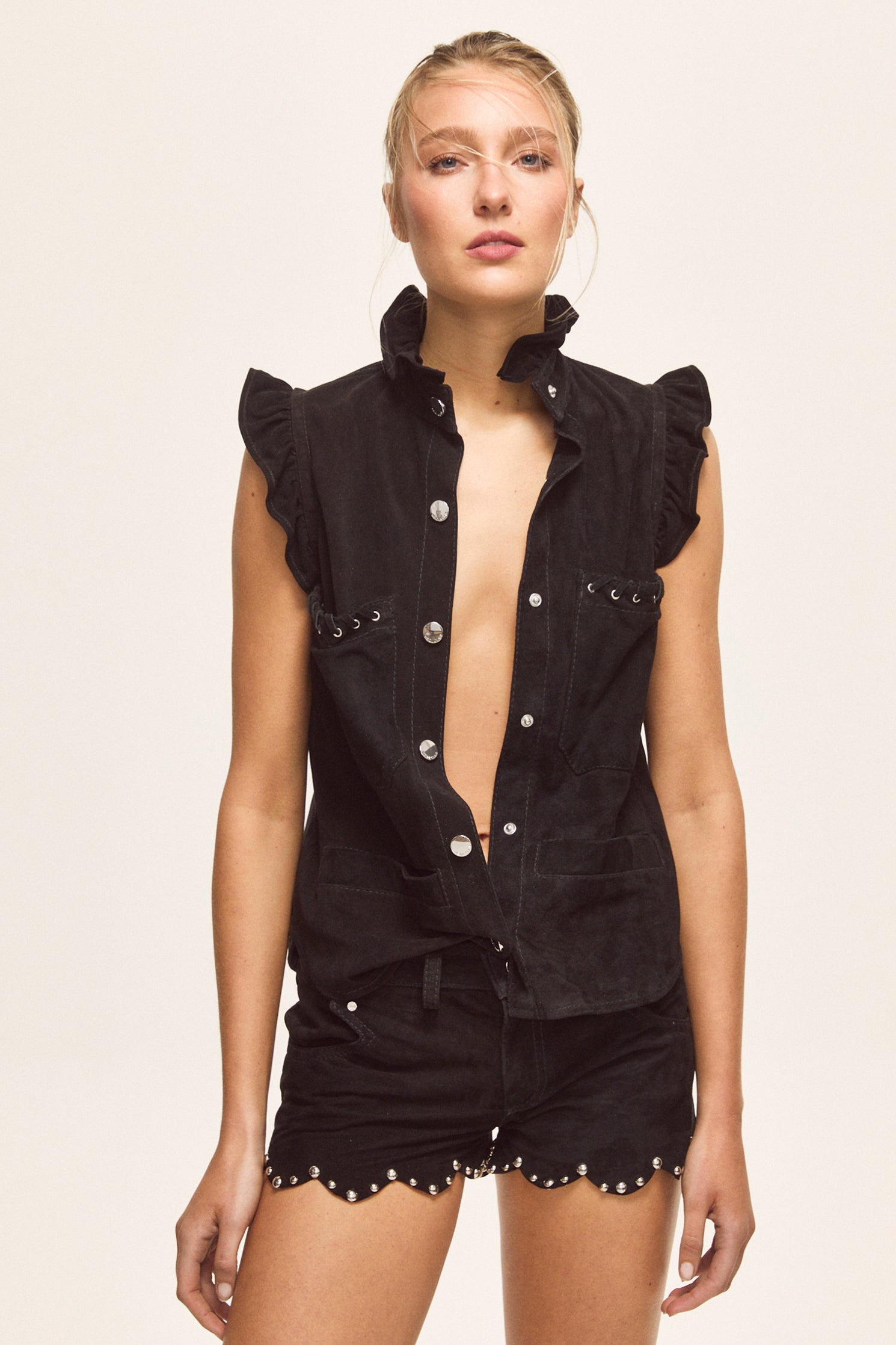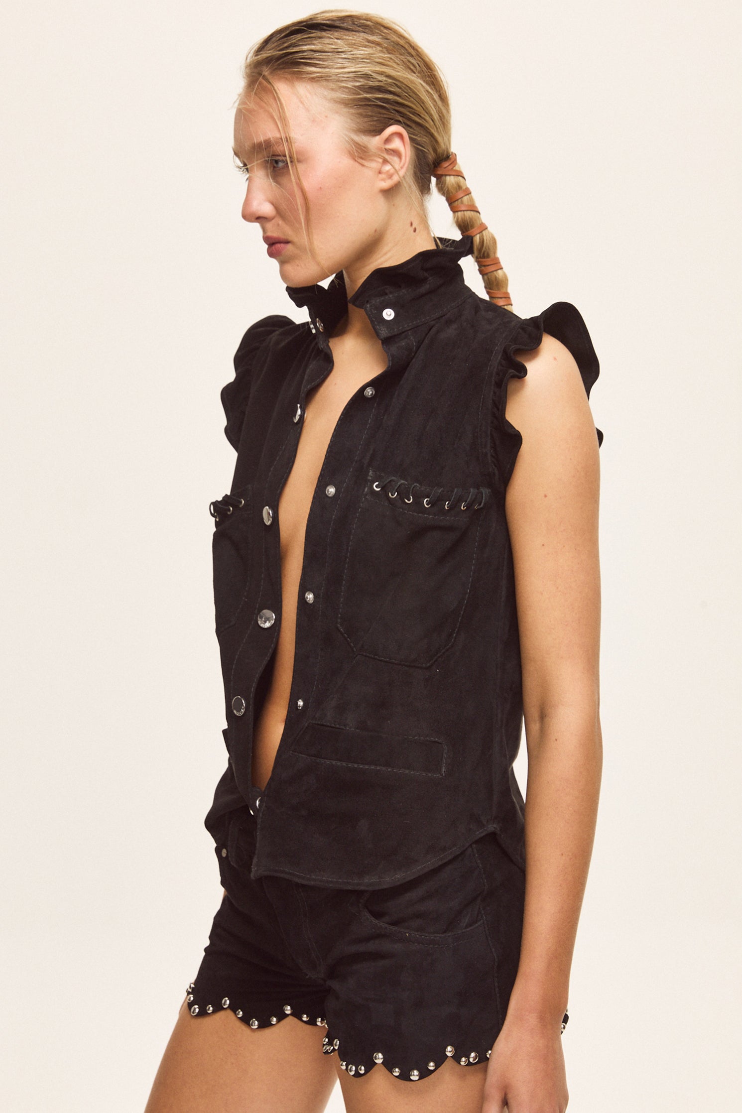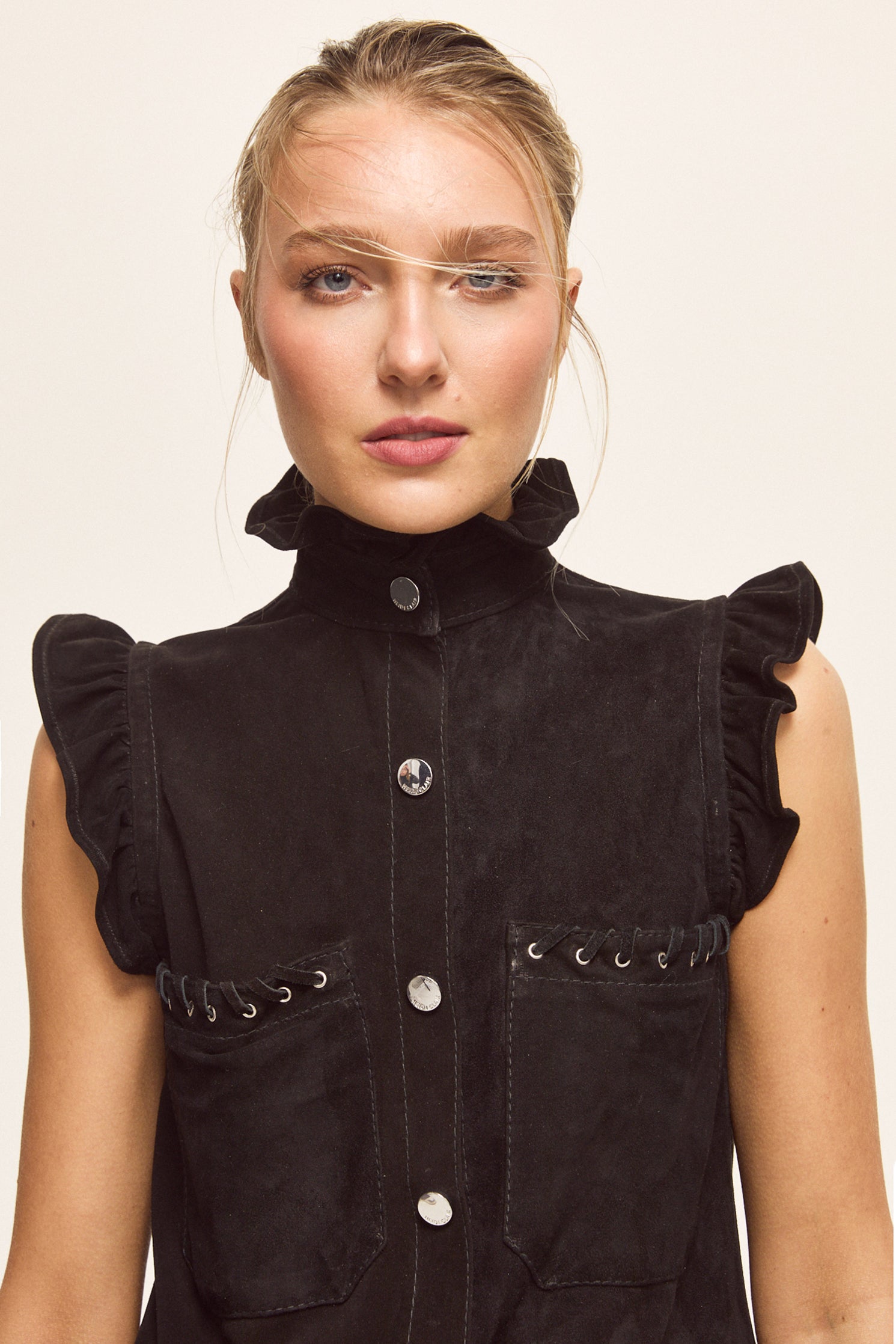 Chaleco en cuero con volados en mangas y cuello. Tiene bolsillos delanteros con detalle de trenzado con ojalillos. Broches metálicos en el centro, fit al cuerpo y largo regular a la primer cadera.