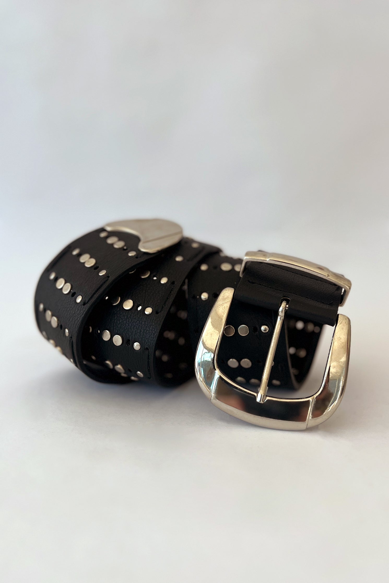 Cinturon en cuero vacuno 100%, pase 60 mm con hebilla, pasador y puntera metálicos en baño niquel y forreria en cuero vacuno. En todo el largo de la lonja posee remaches en baño niquel, perforado y trenzado de tiento al tono.