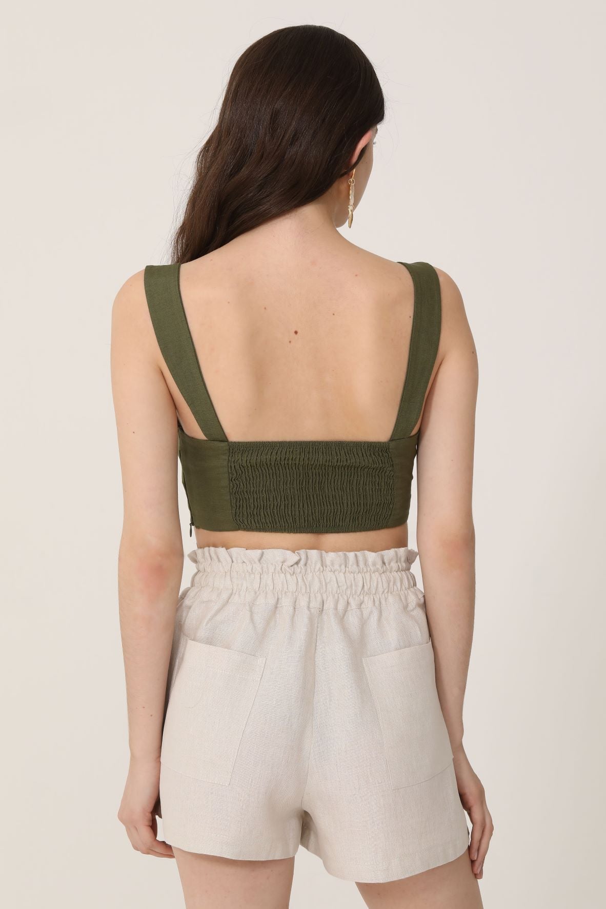 Short de lino 100% tiro alto de fit amplio, con vuelo, elástico en cintura y amplios bolsillos en delanteros.