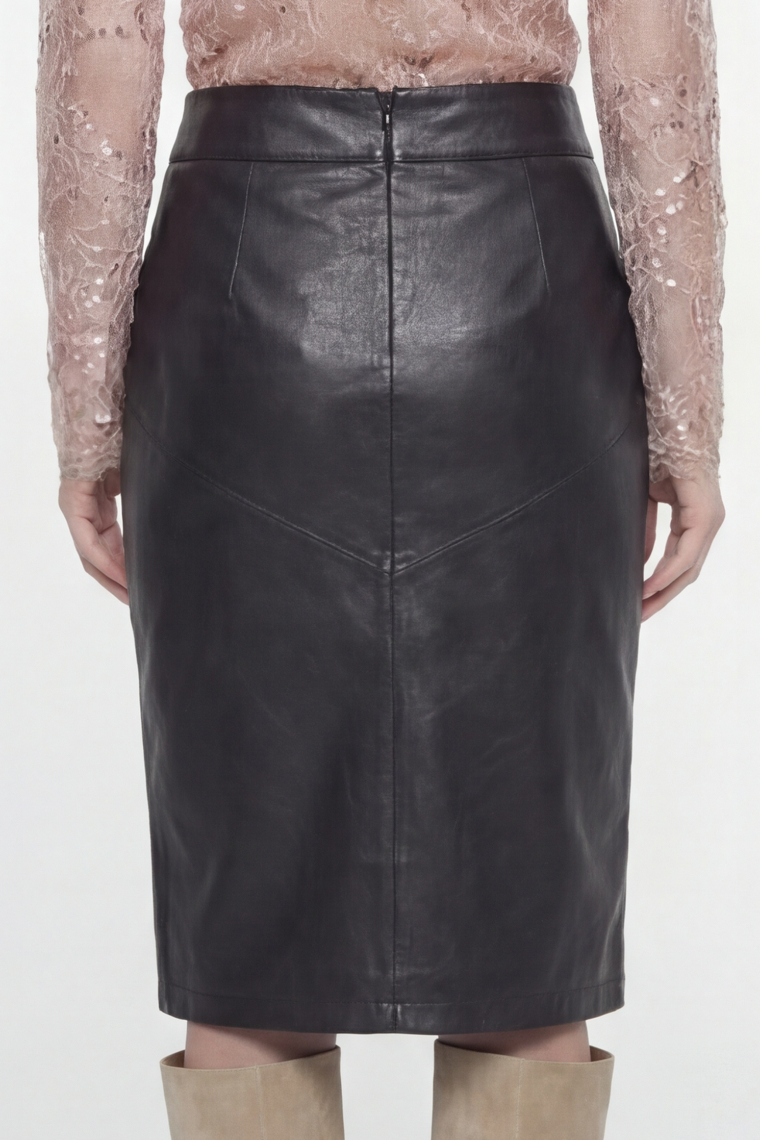Falda tiro alto confeccionada en cuero y forrada en tafeta. Posee cierre invisible como acceso a la prenda. En espalda tiene un tajo que permite movimiento.