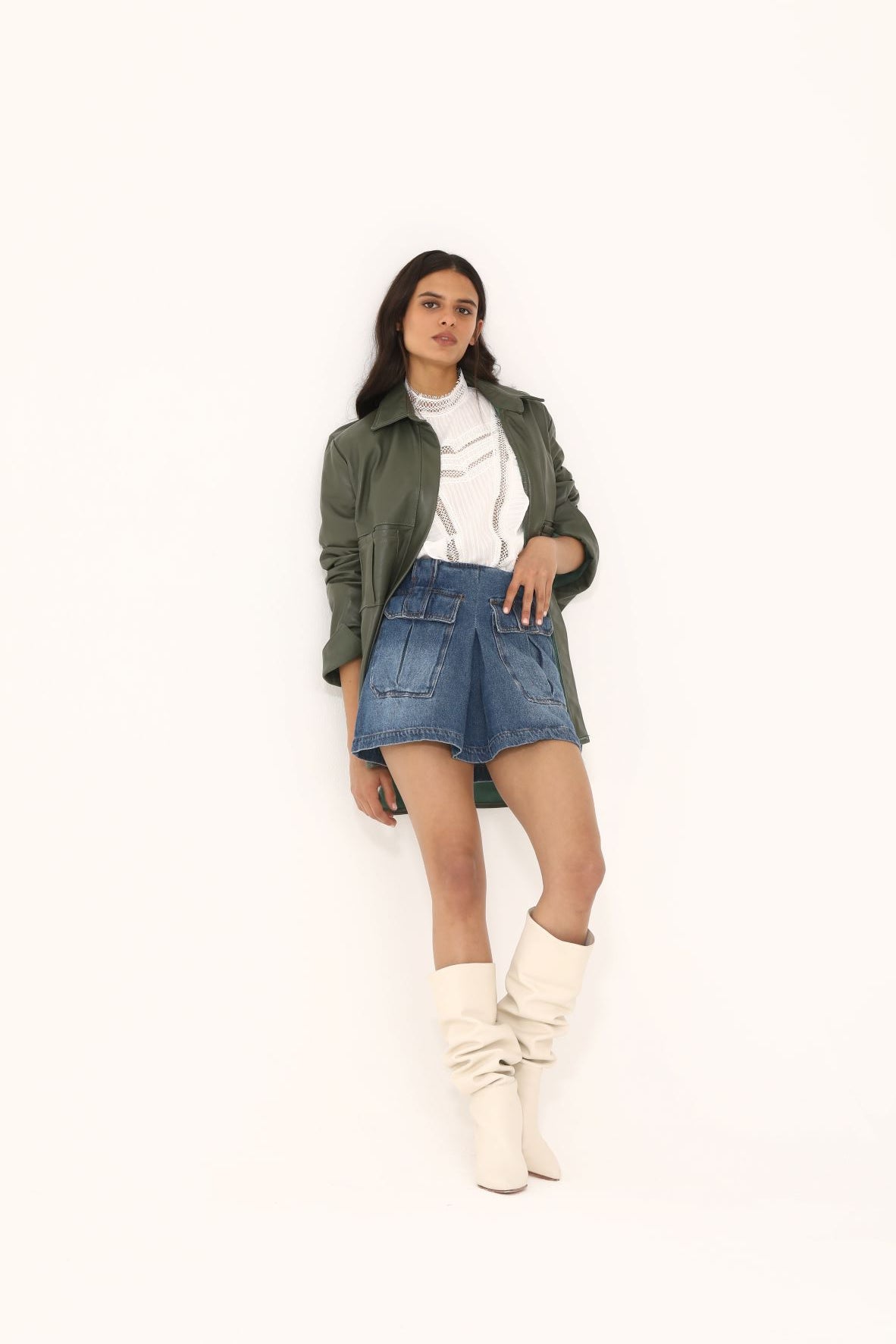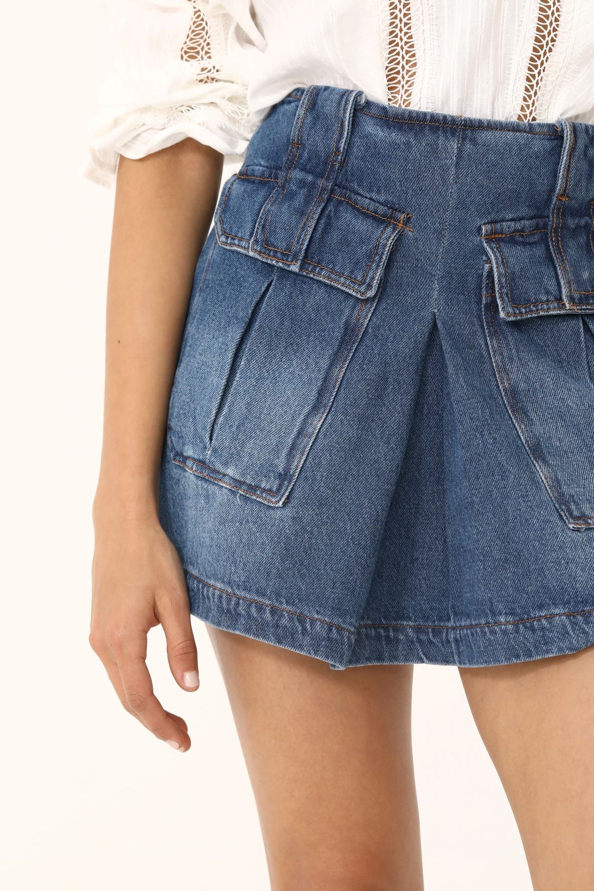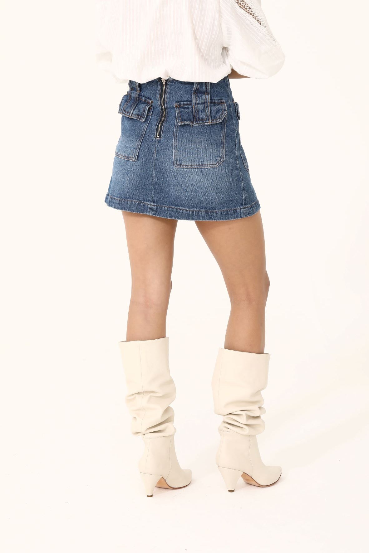 Falda mini recta en denim azul con lavado ecowash 100% algodón, bolsillos plaqué en delantero y lazo en cintura.