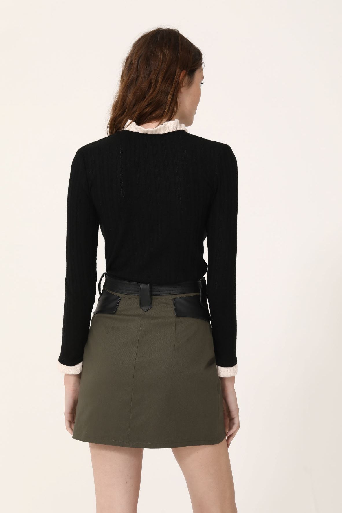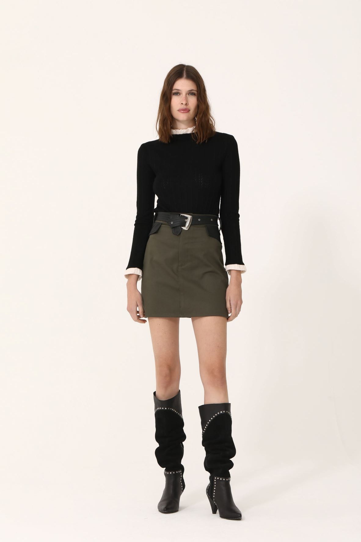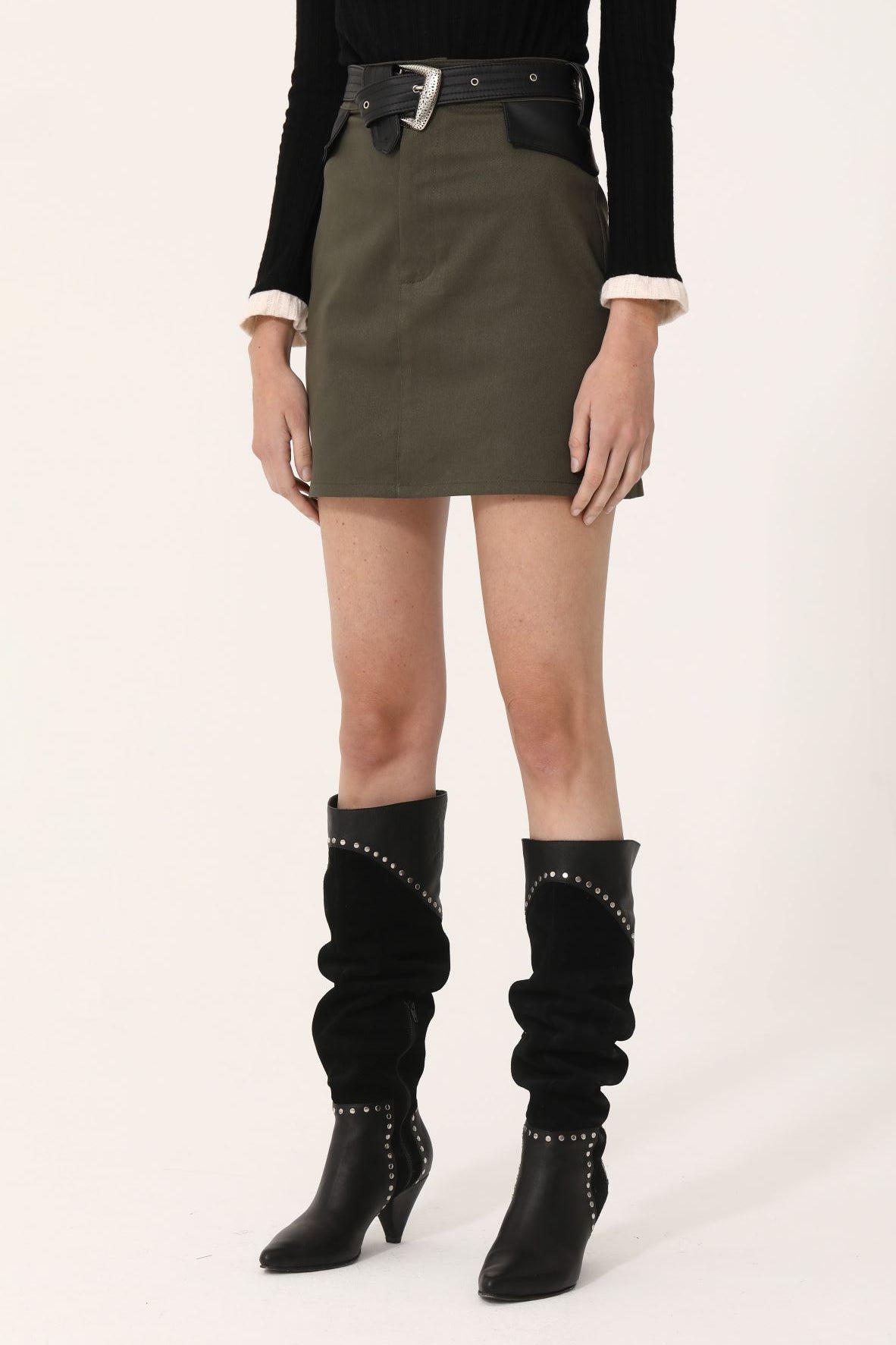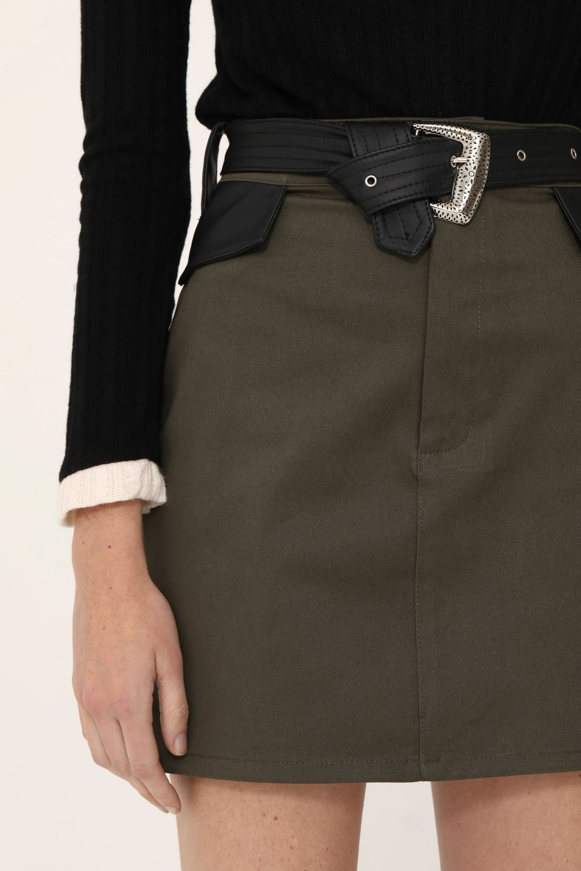 Falda tiro alto 100% algodón de gabardina, con corte recto y es ajustable con cinturón negro de eco cuero con hebilla metálica calada.