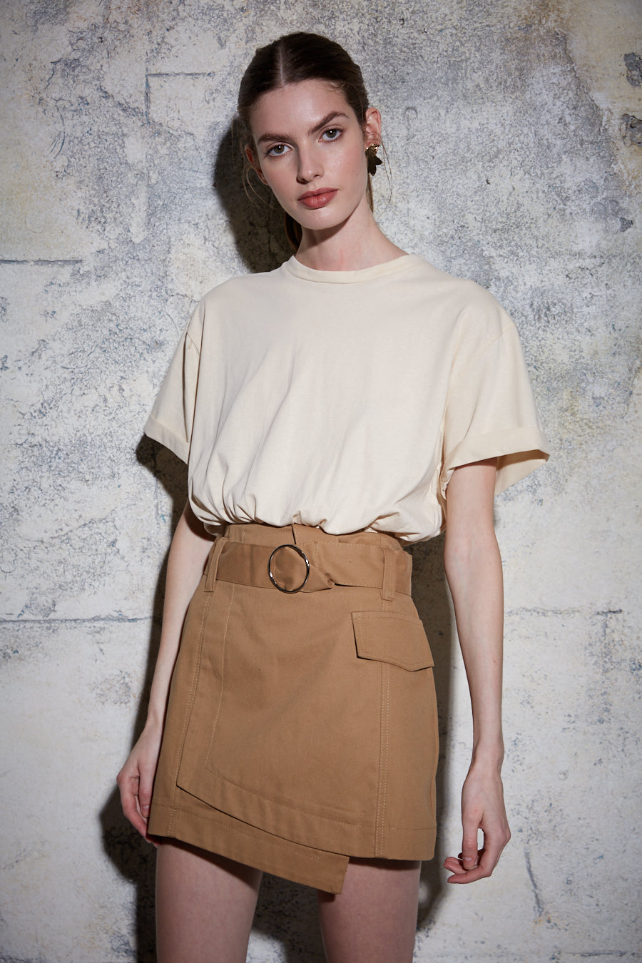 Falda irregular con lazo y hebilla en gabardina liviana .