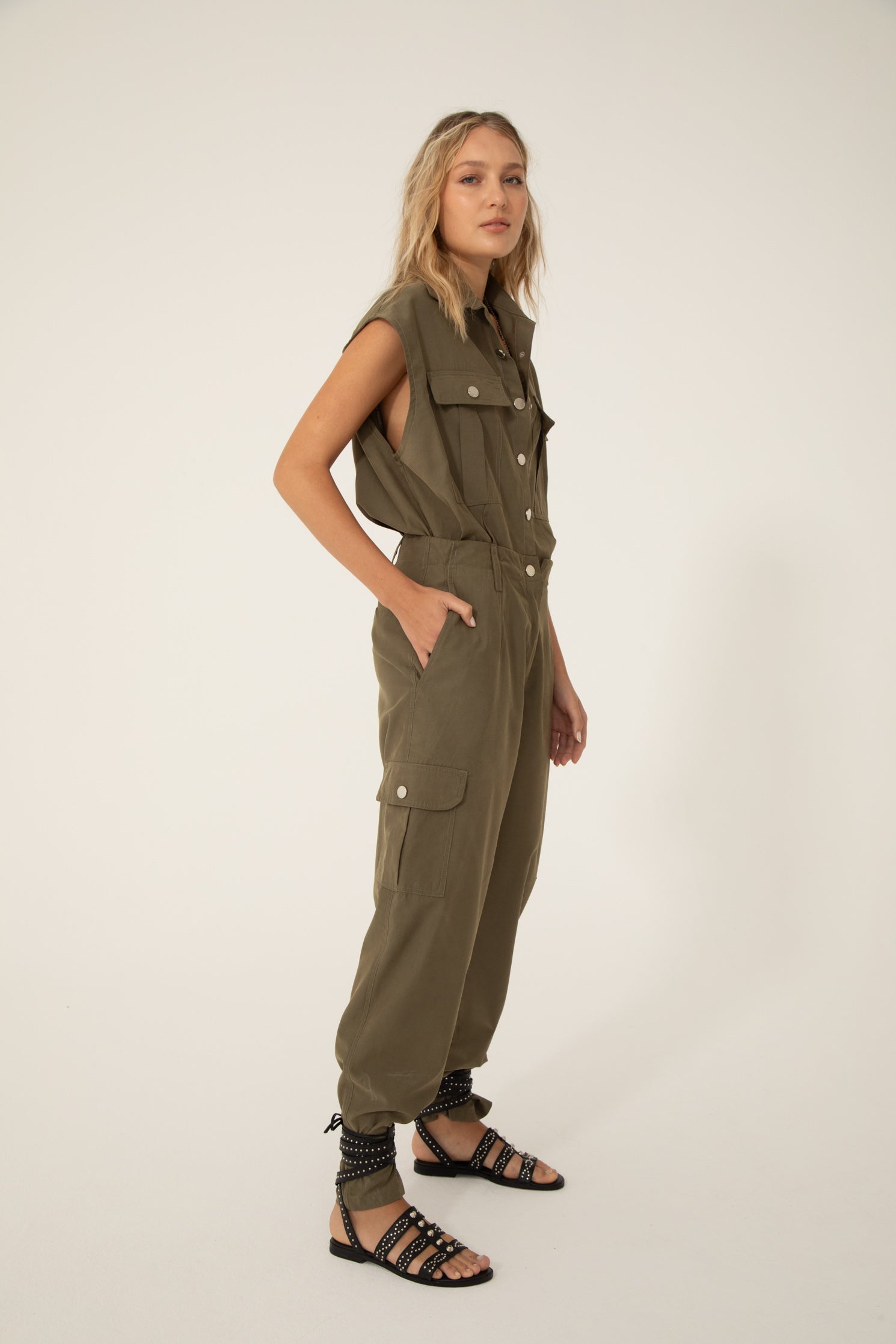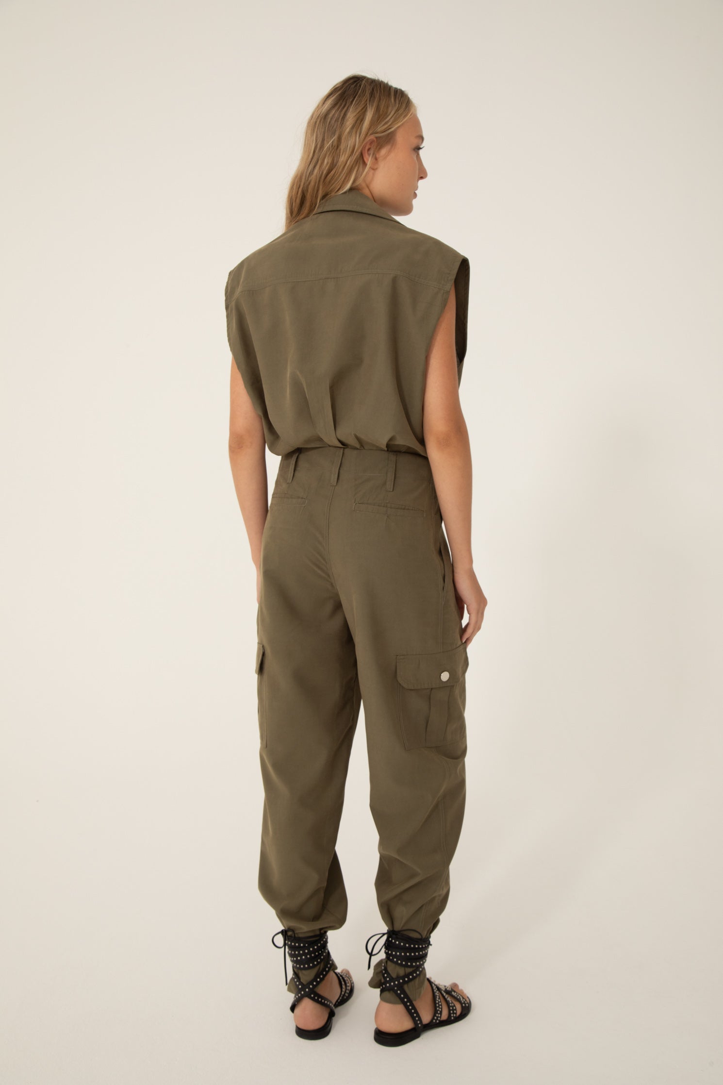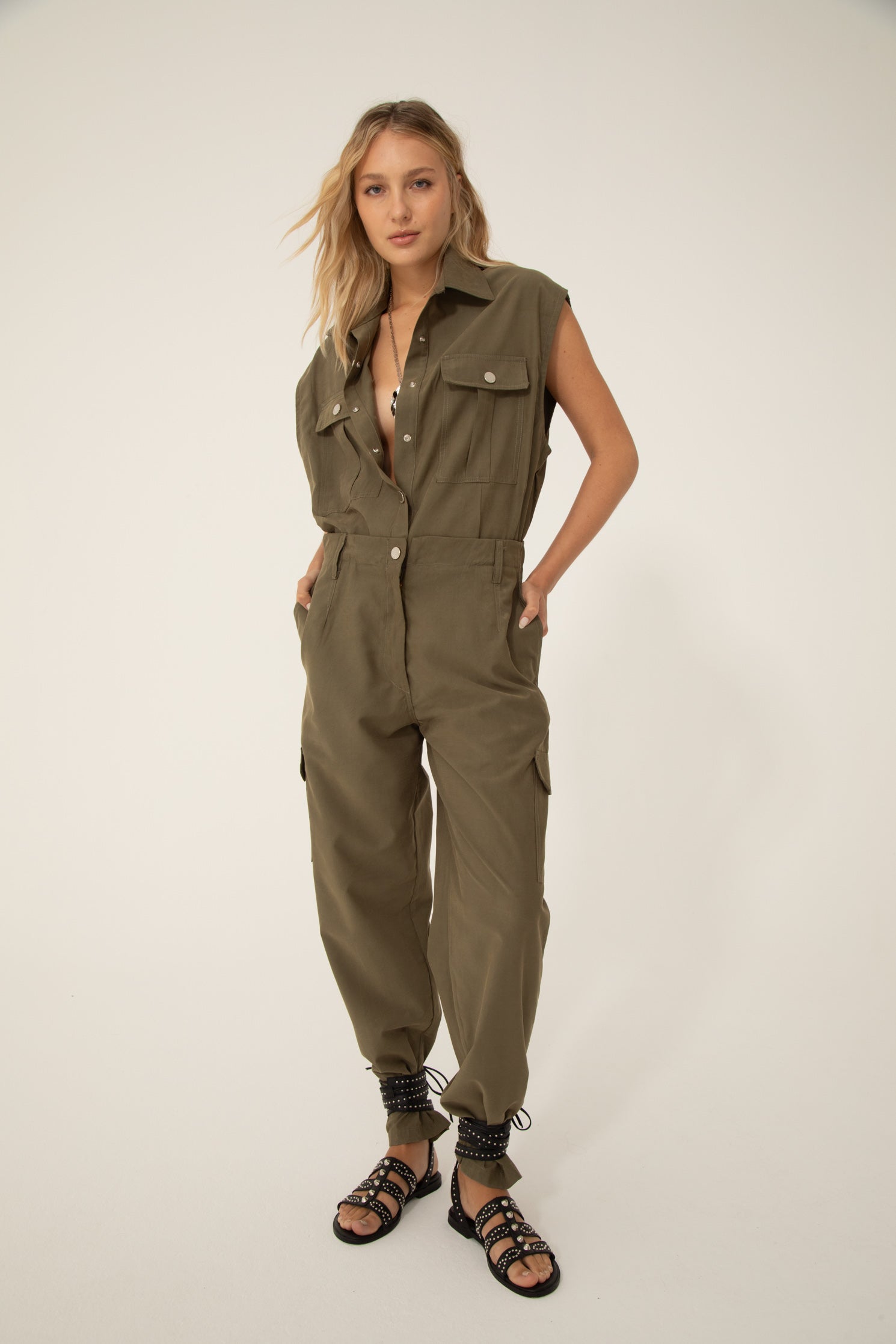 Mono largo, sin mangas, fit holgado. Tiene bolsillos en laterales de cada pierna tipo cargo. Cintura de pantalón por encima de camisa que simula tener dos prendas y broches metálicos con logo de marca.