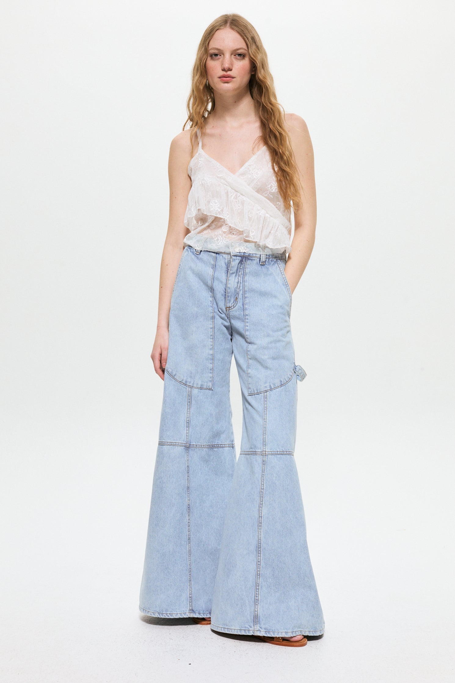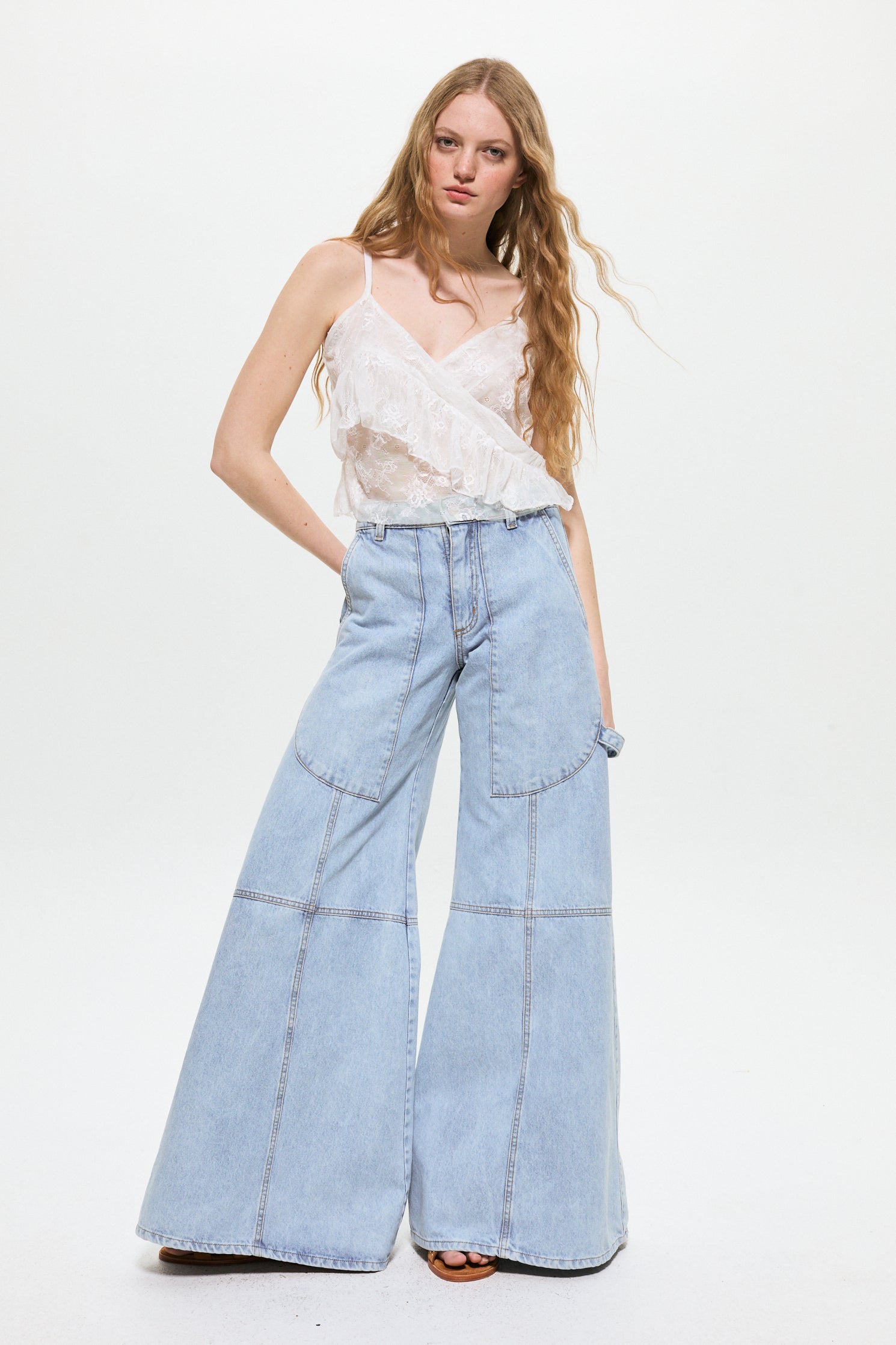 Pantalón de denim 100% algodón fit wide leg tiro bajo, con bolsillo amplio en delantero, recortes en piernas y presilla.