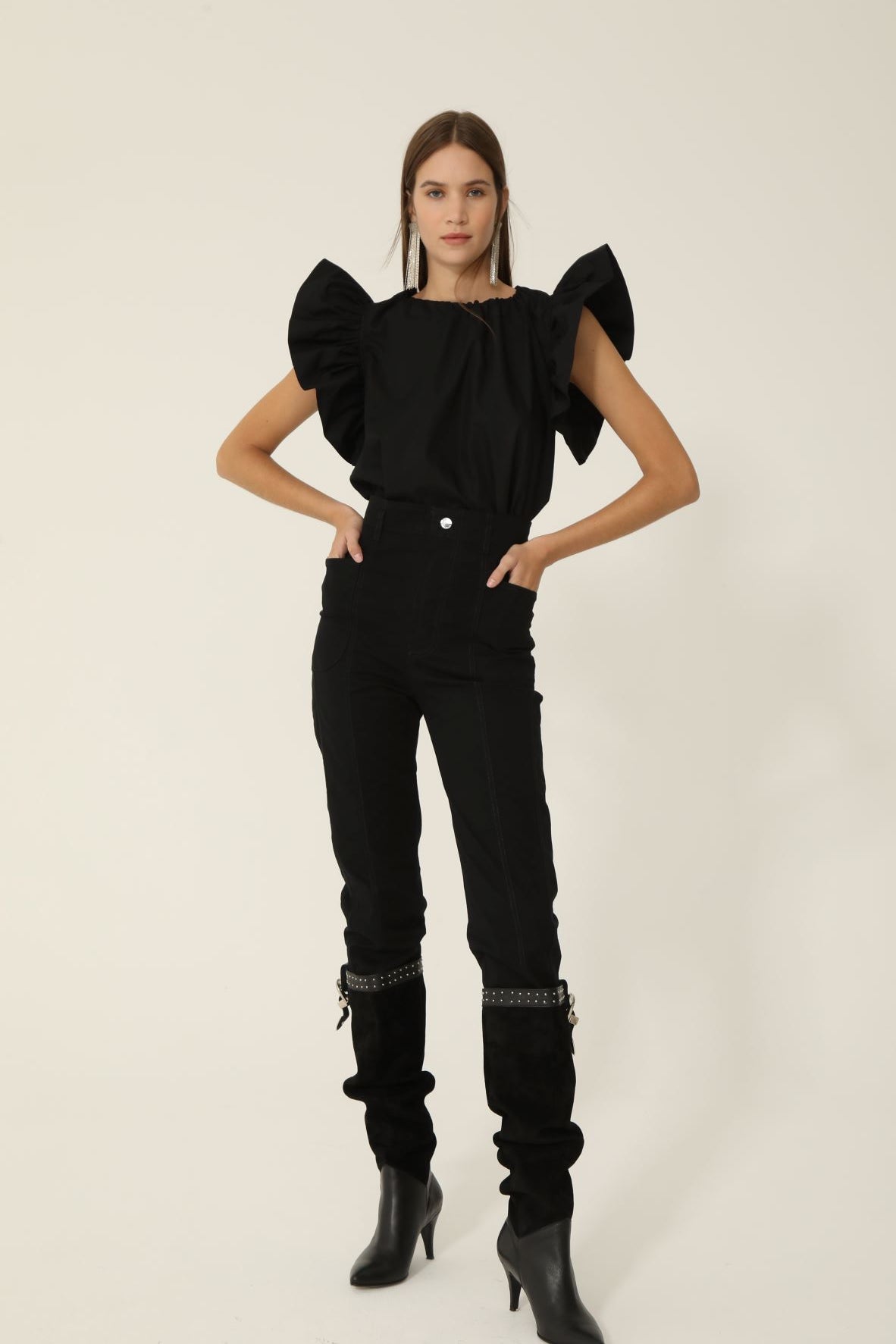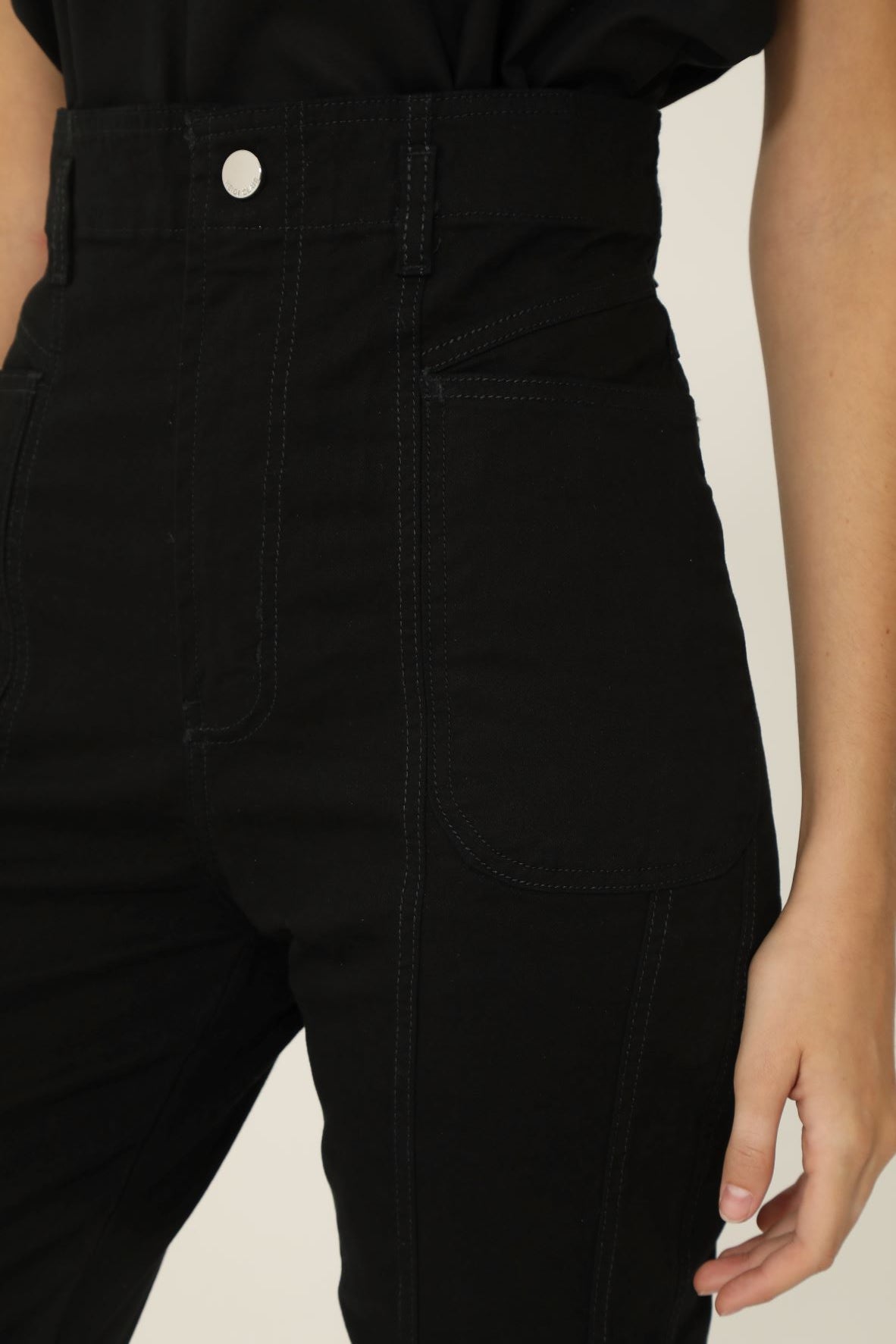 Pantalón skinny en denim elastizado, con recortes verticales y bolsillos amplios aplicados sobre delantero.