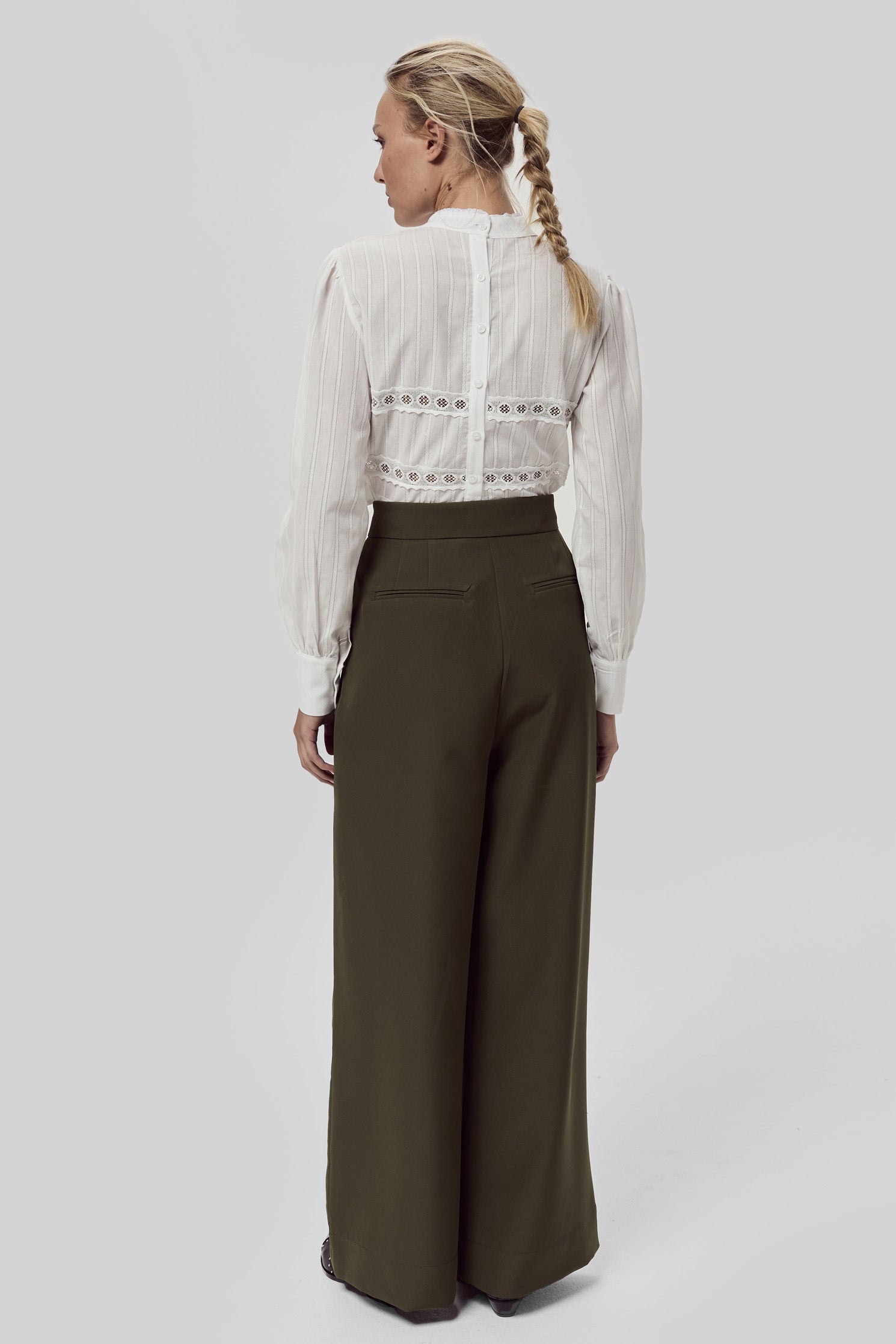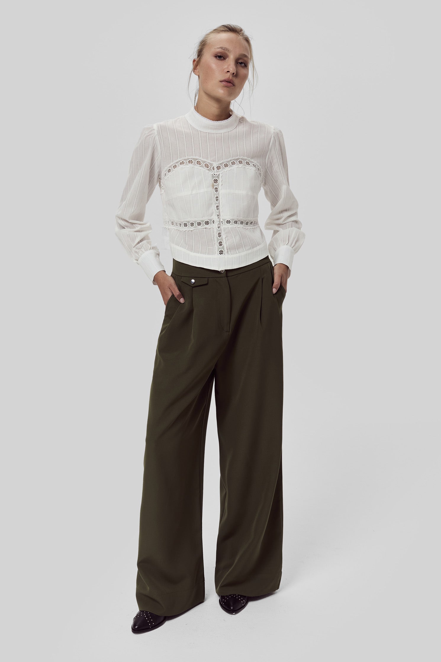 Pantalón wide leg fit amplio en creppe con pinzas en cintura y tapita con cubre botón con logo de marca. Cintura con botón exclusivo de Heidi Clair.