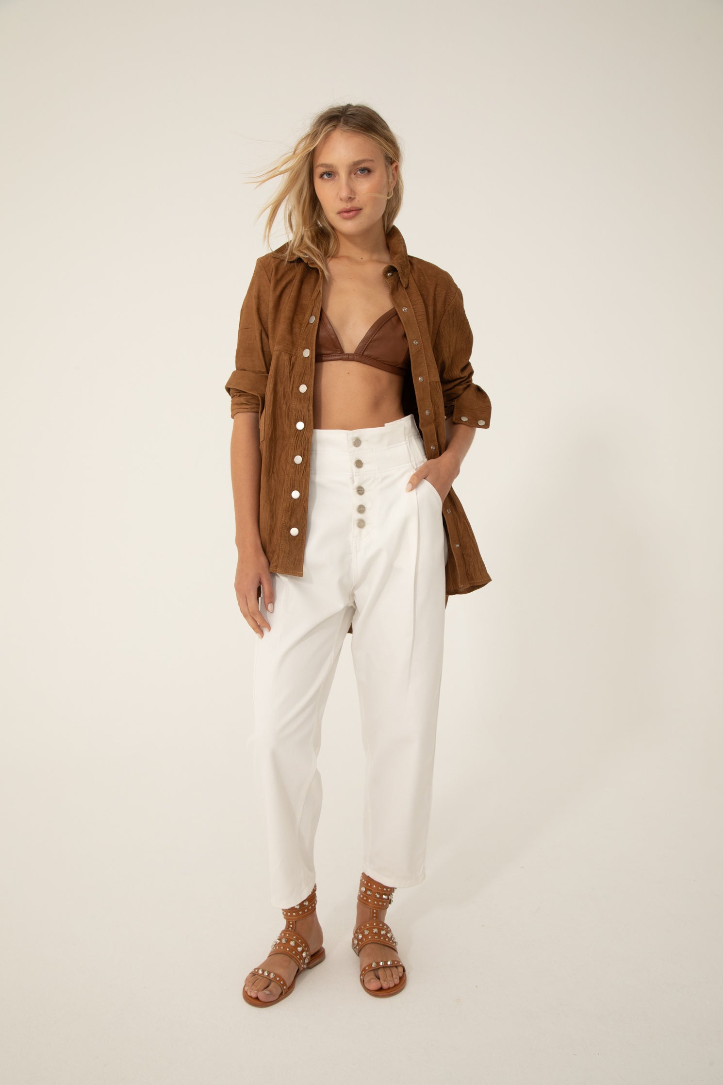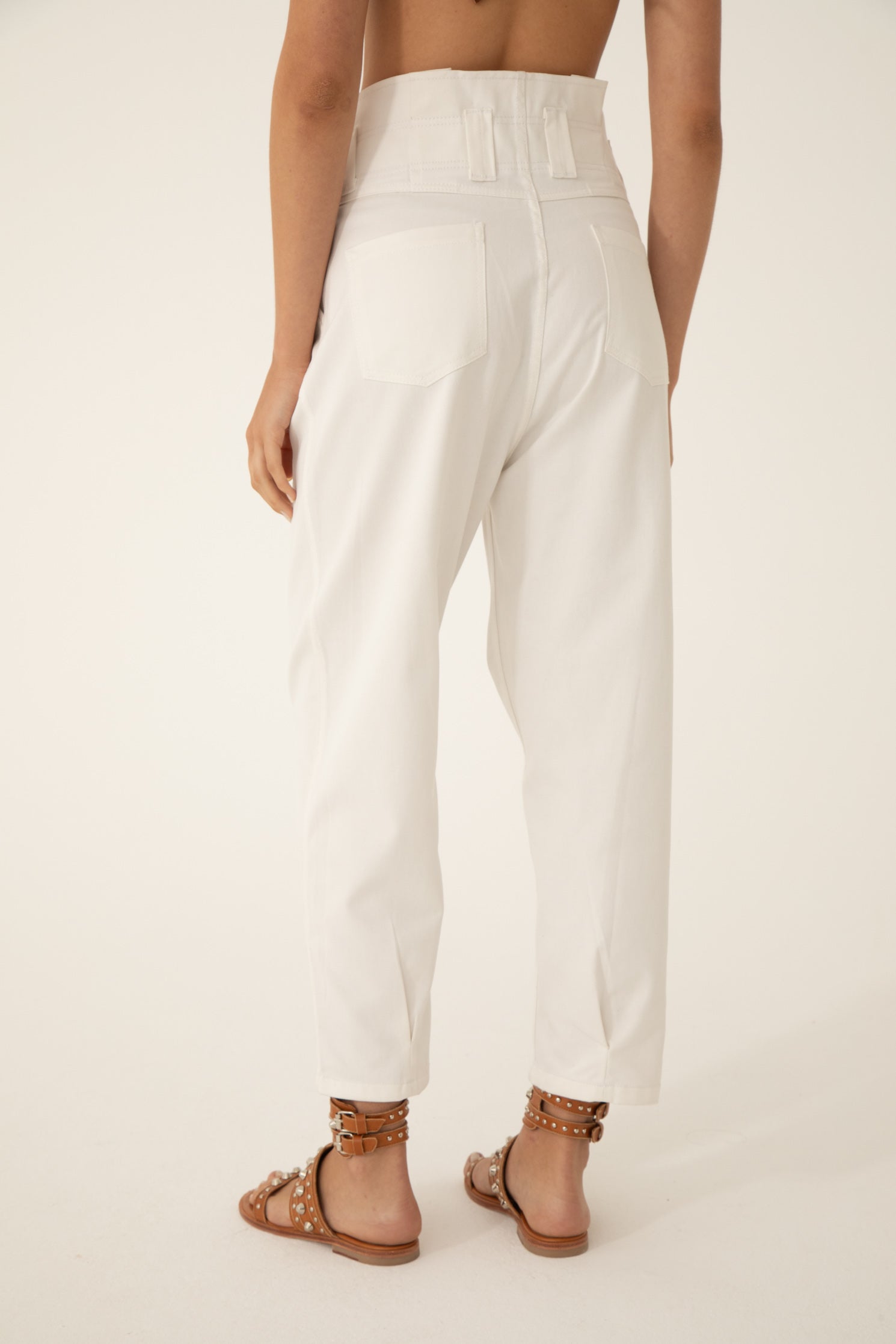 Pantalón fit slouchy tiro alto en denim 100% algodón. Bragueta con botones a la vista, bolsillos delanteros y en espalda. Posee un bolsillo sobre el lateral de la pierna derecha.