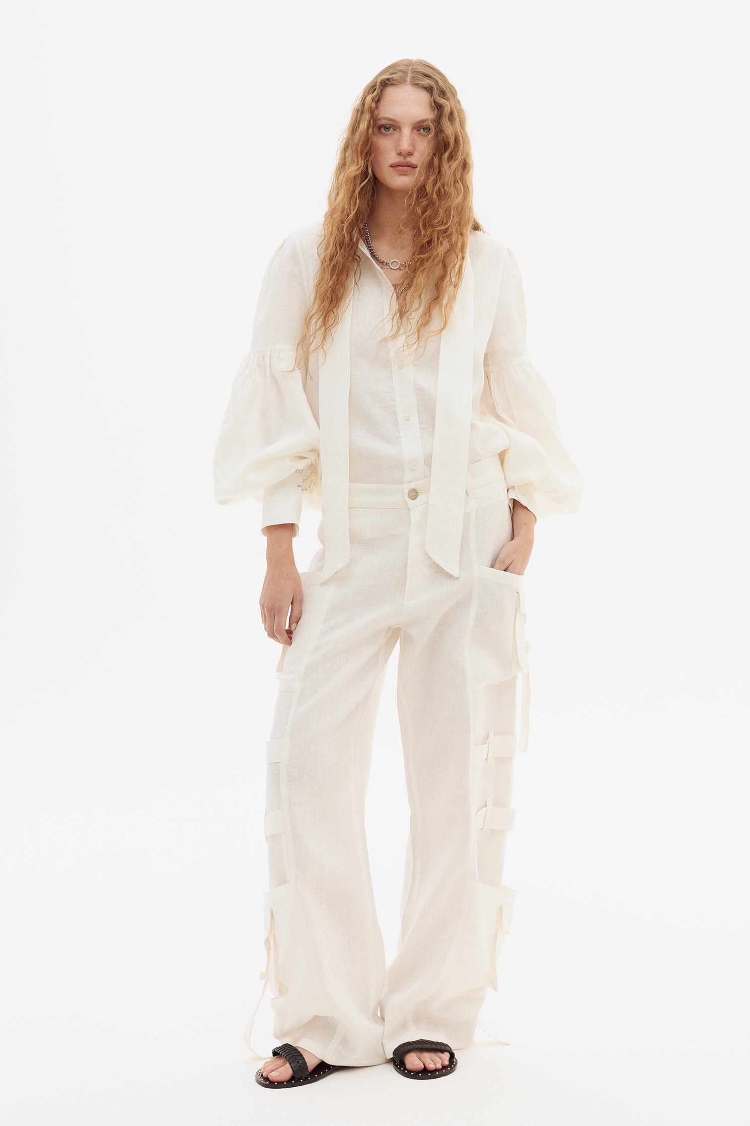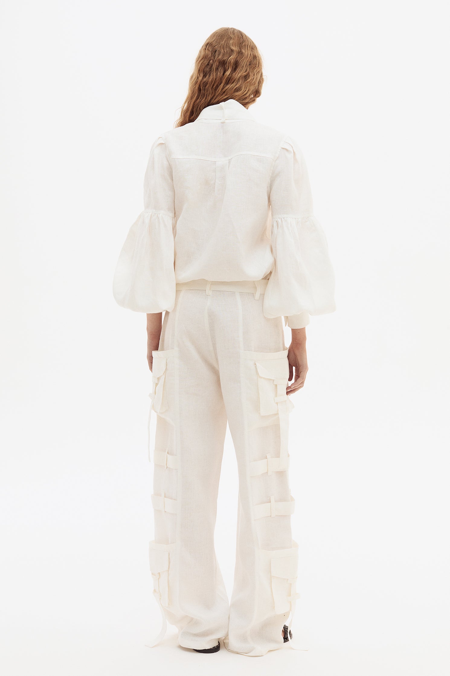 Pantalón en lino , detalles de bolsillos cargo laterales en pierna, tiras del mismo material que justan en distintos niveles de la pierna. calce holgado, pierna amplia y