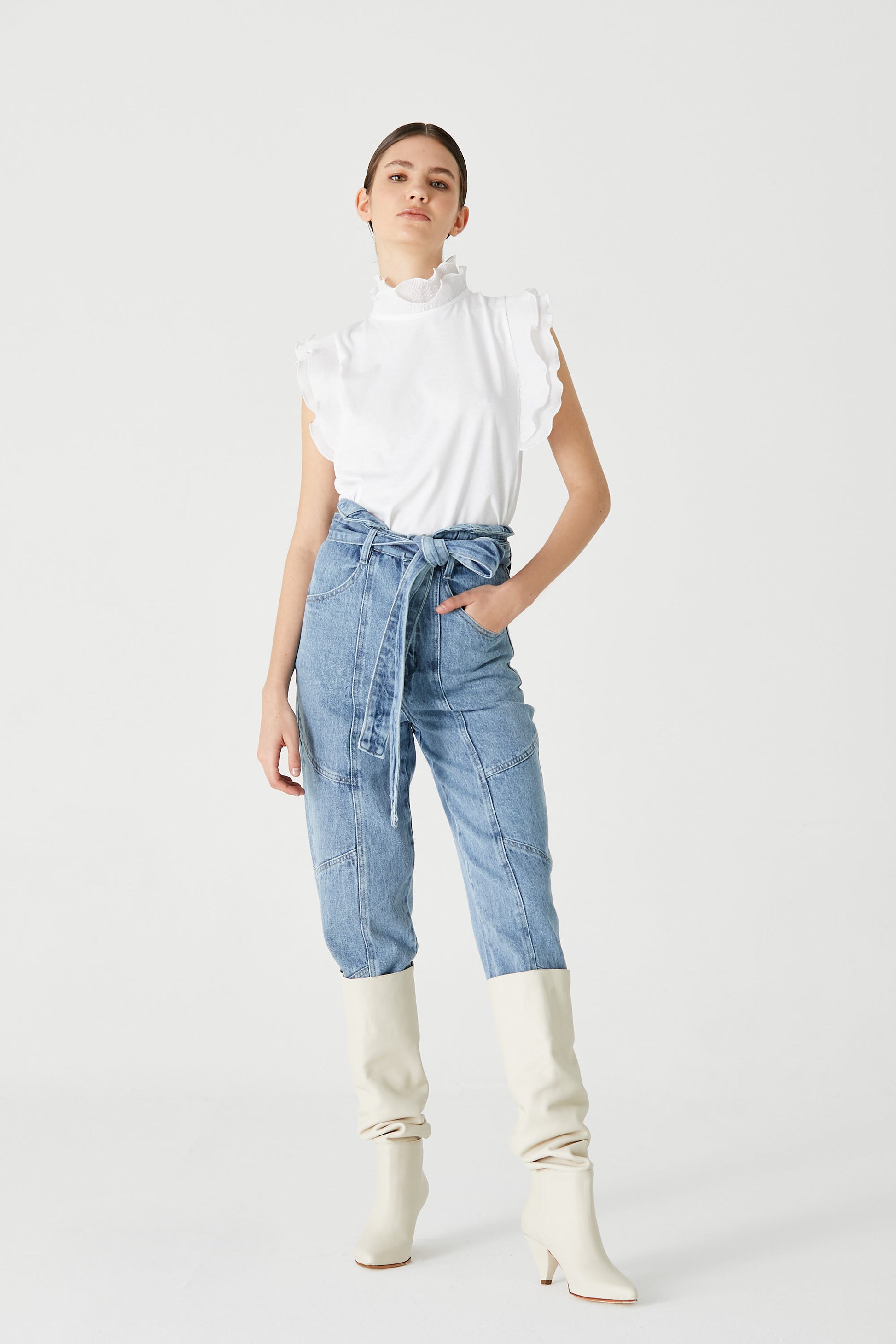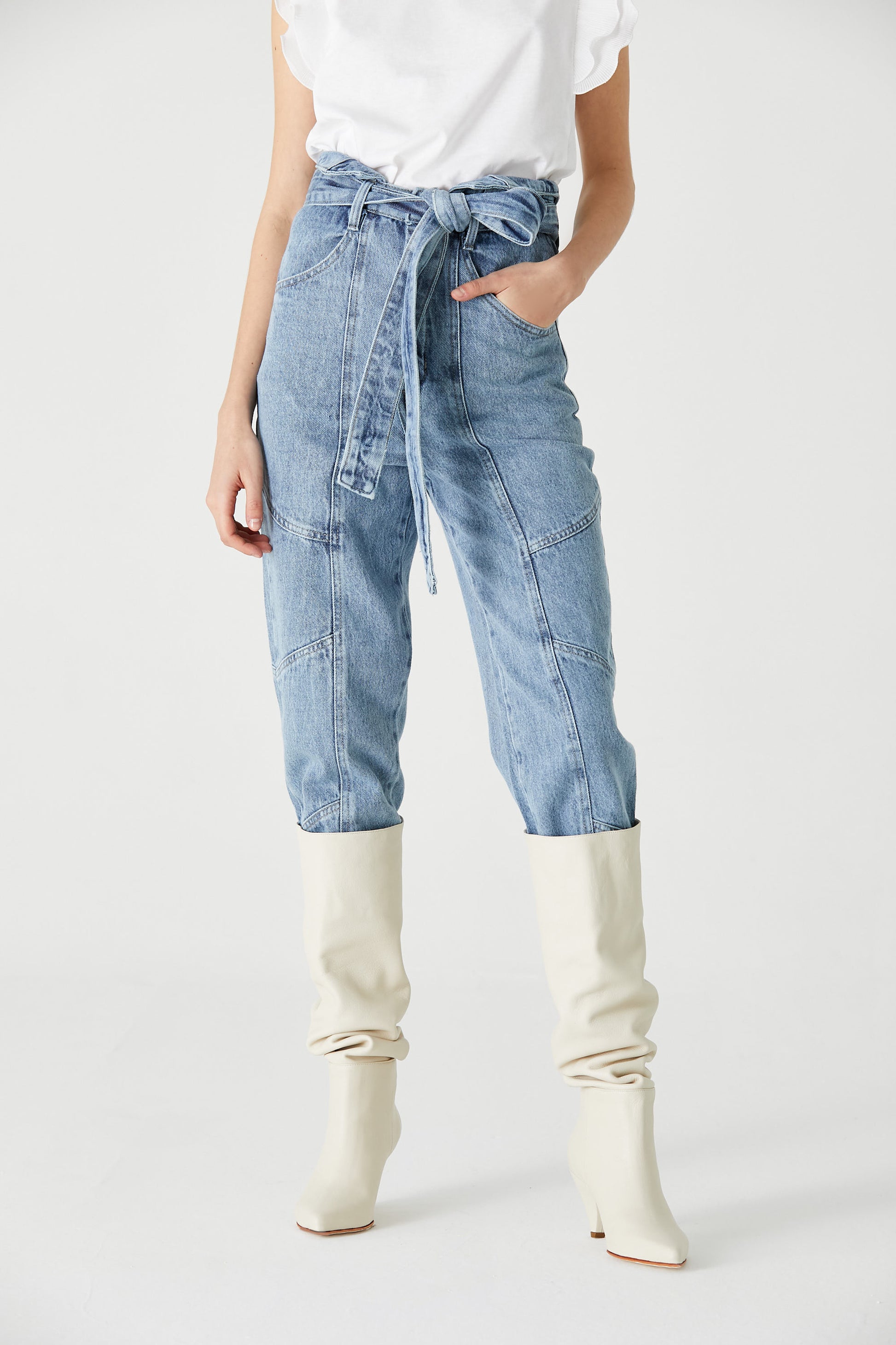 Pantalón en denim 100% algodón, tiro alto y silueta slouchy, con recortes verticales y horizontales en piernas, lazo en cintura y bolsillos ojal en espalda.