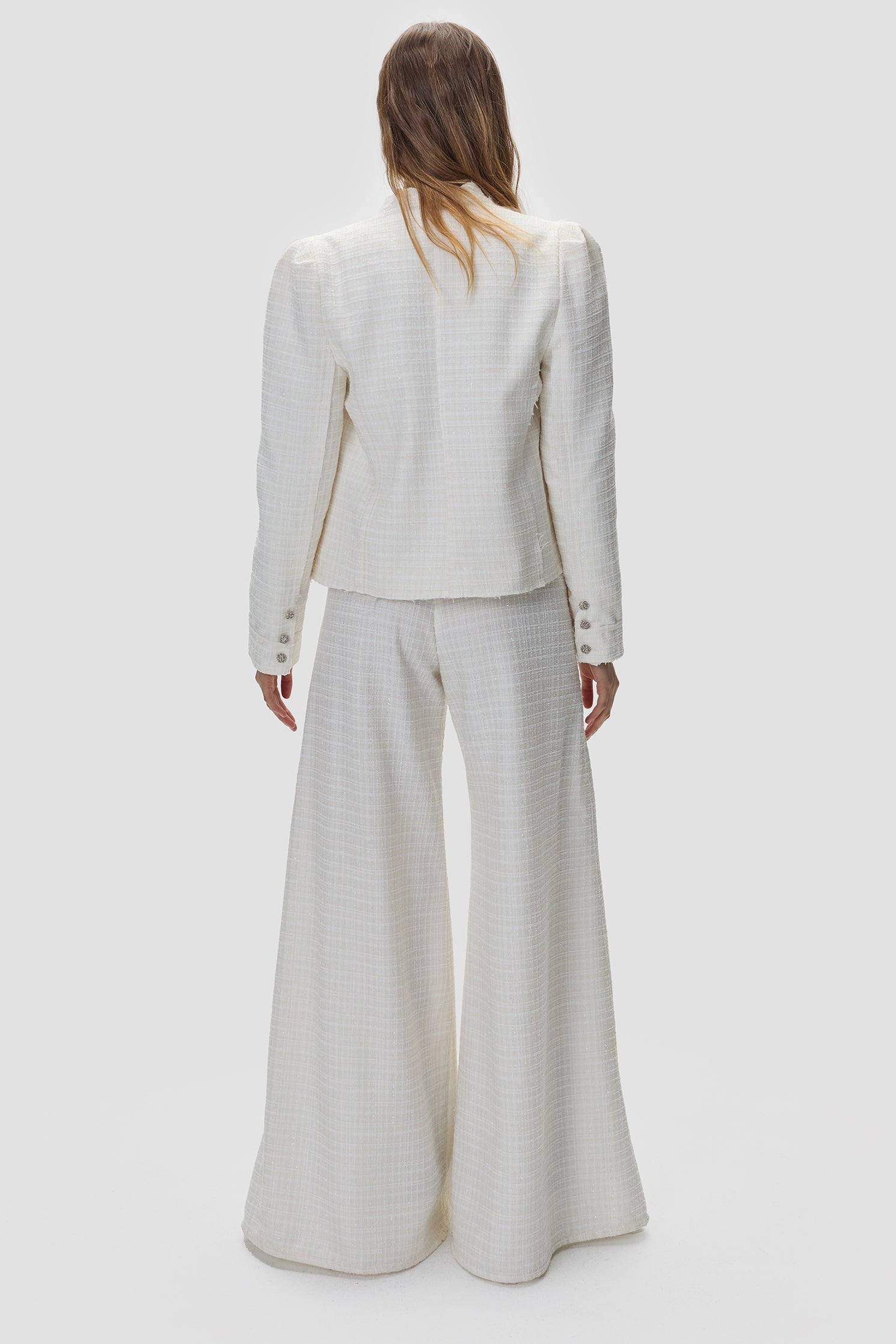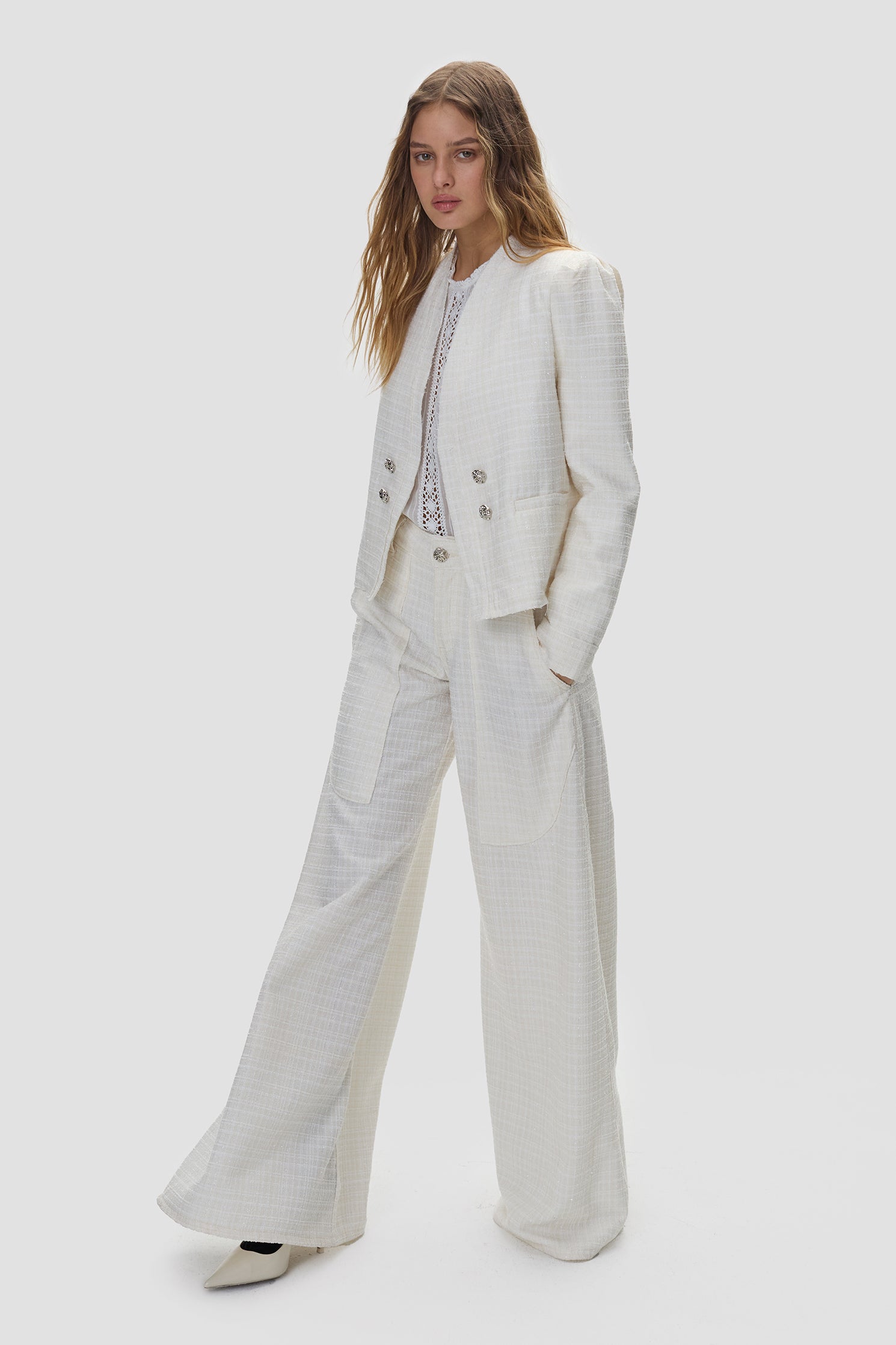Pantalón tiro medio en paño tipo chanel con recortes en pierna, bolsillos amplios en delantero y presilla lateral.