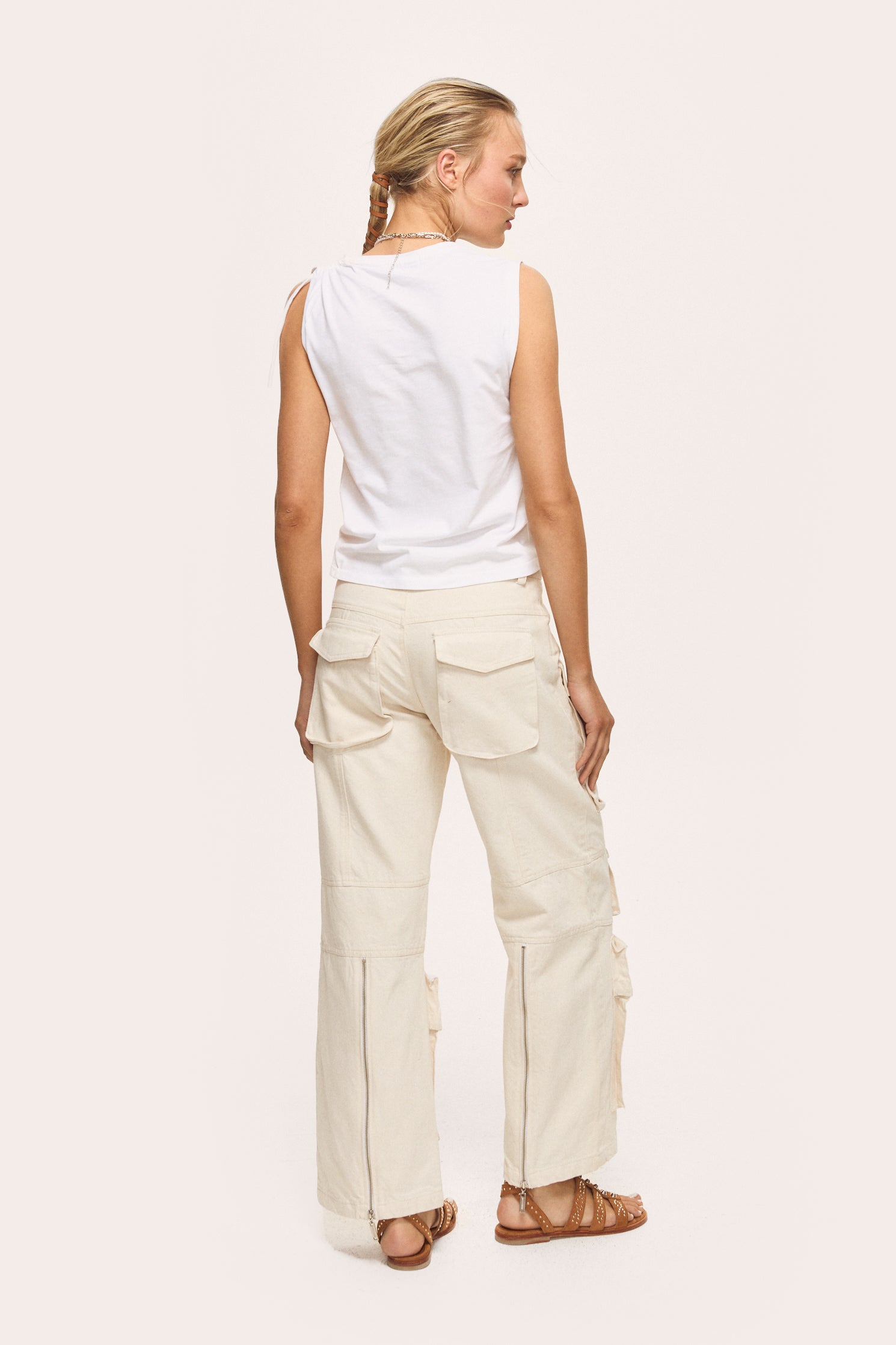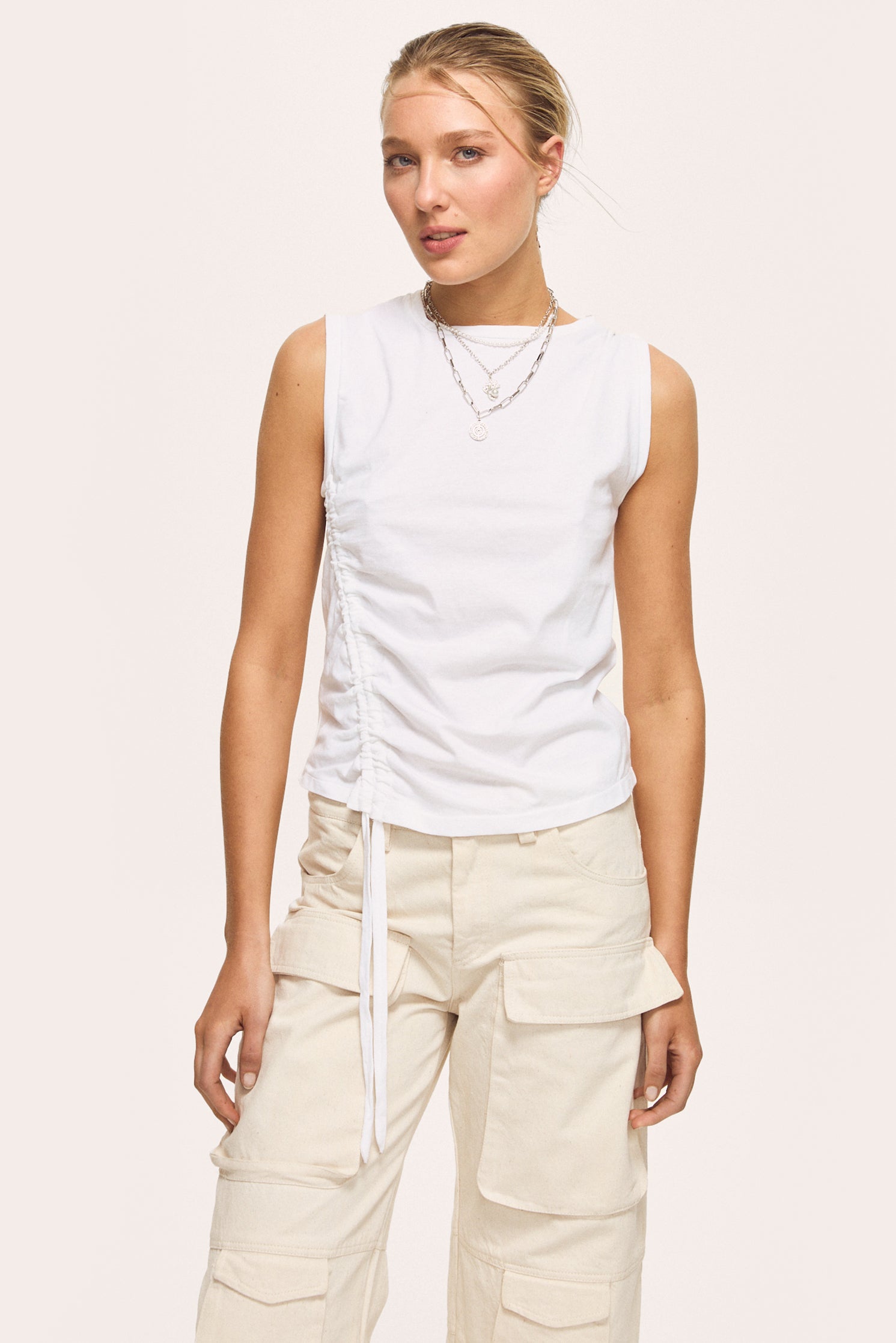 Remera en algodón pima 100% con lazo en hombro y en delantero para regular su ajuste, pudiendo modificar su largo regular. Fit al cuerpo.