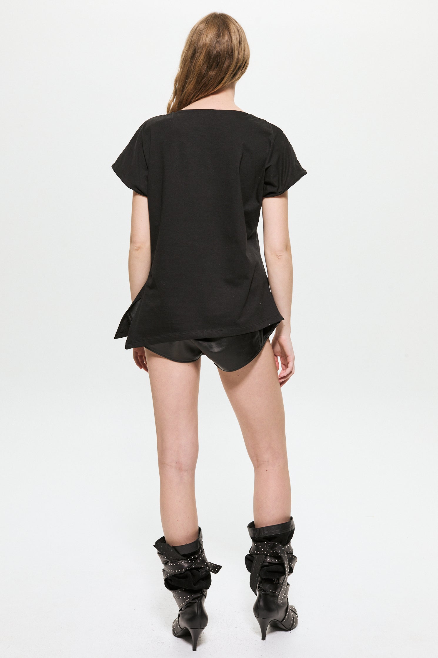 Remera en algodón pima 100% con ruedo irregular, escote redondo y sisa extendida simulando apenas manga. Fit recto.