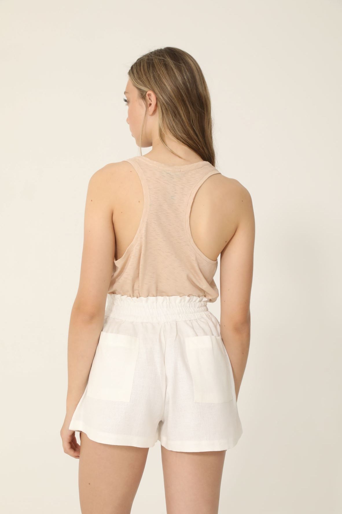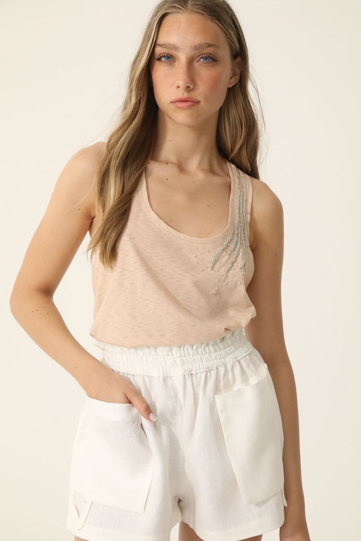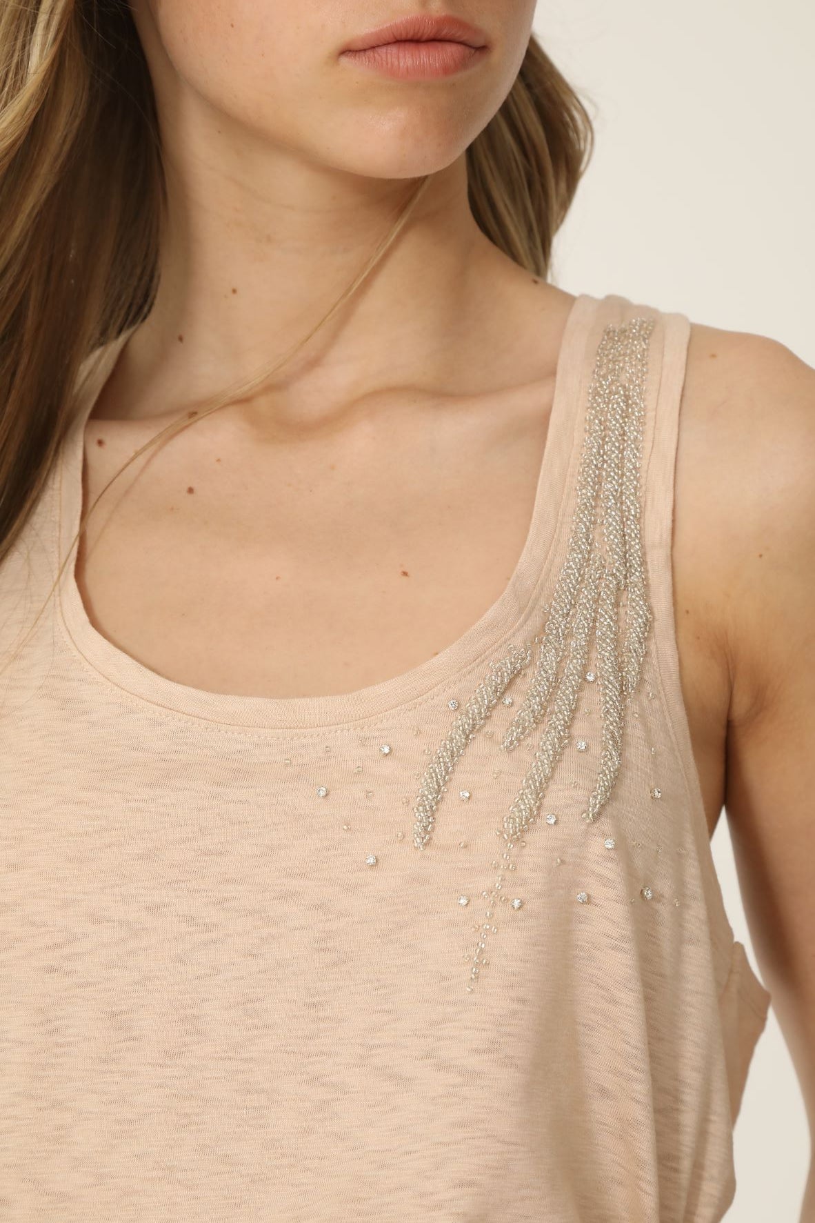 Musculosa en algodón pima 100%, silueta recta con corte deportivo en espalda y bordado en canutillos y cristales sobre el hombro izquierdo.