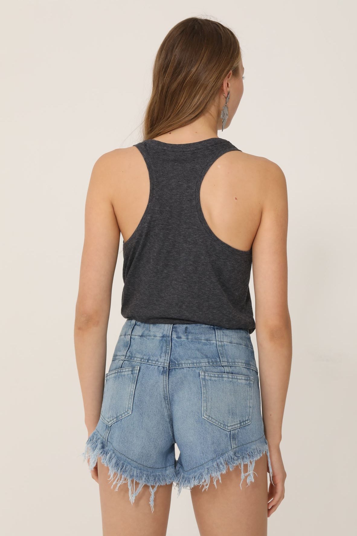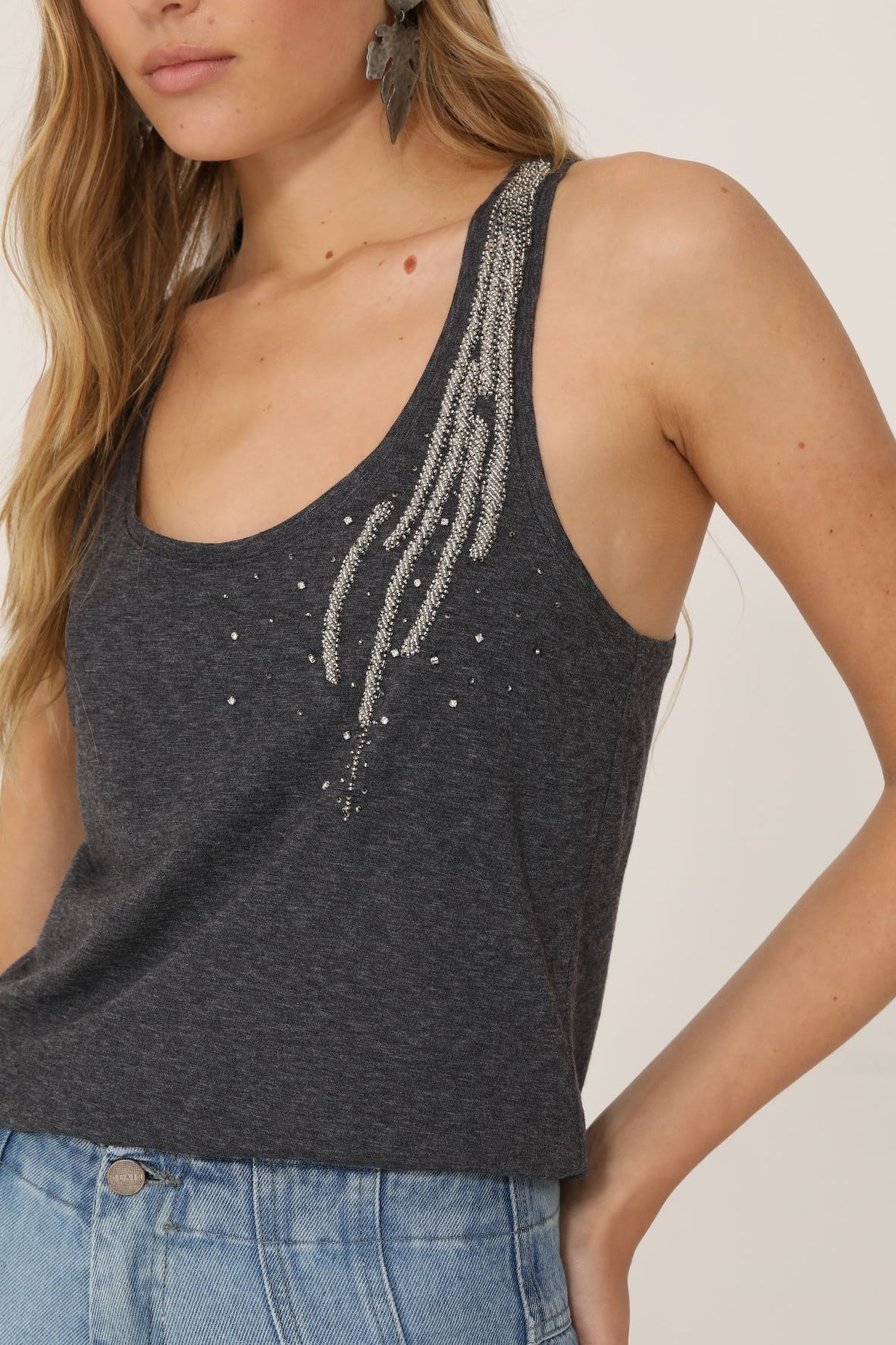 Musculosa en algodón pima 100%, silueta recta con corte deportivo en espalda y bordado en canutillos y cristales sobre el hombro izquierdo.