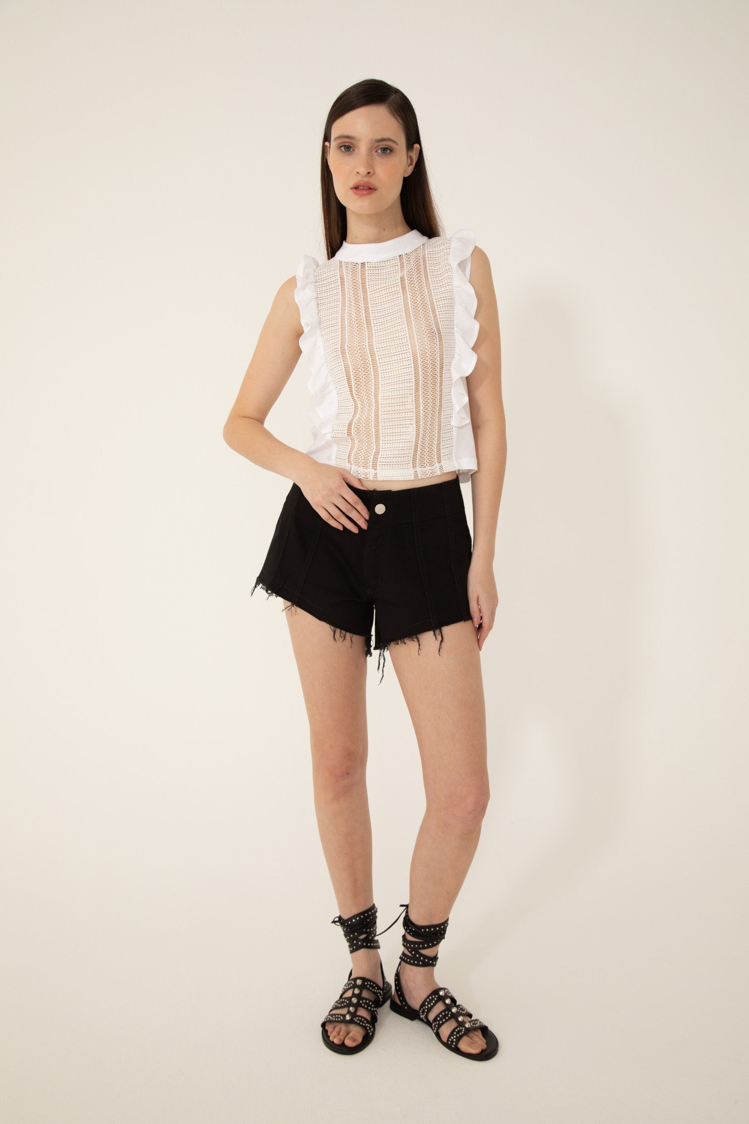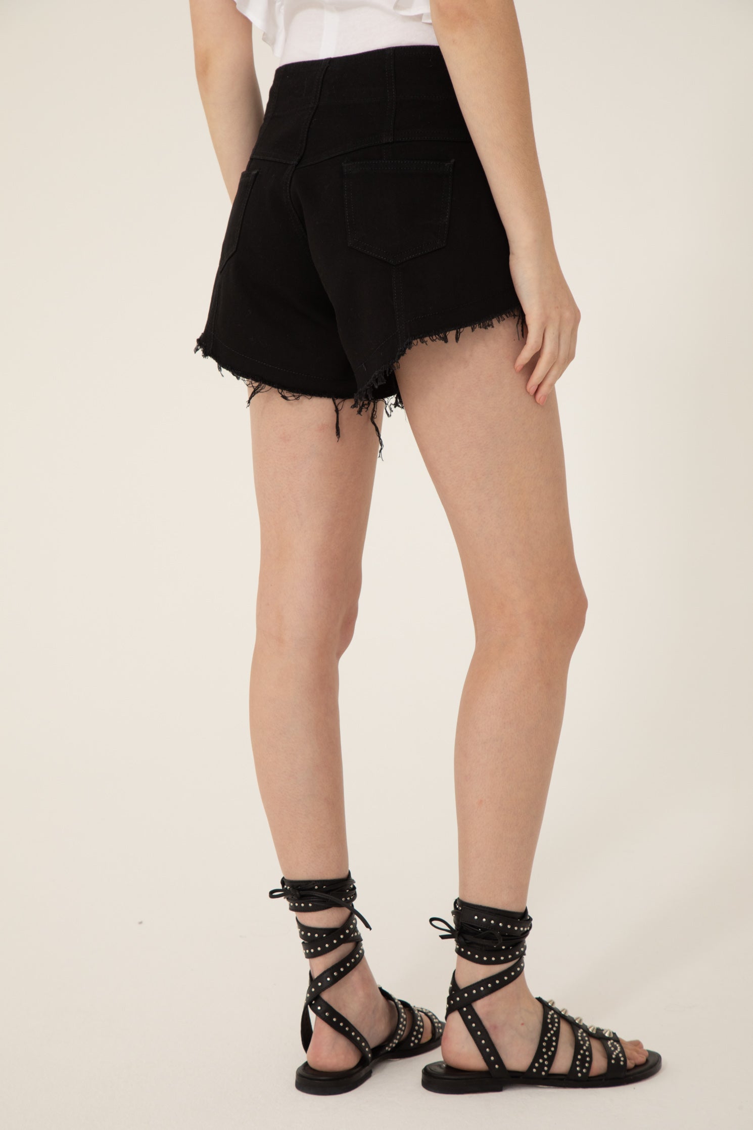Short tiro medio en denim 100% algodón con recortes verticales y flecos largos en ruedo.