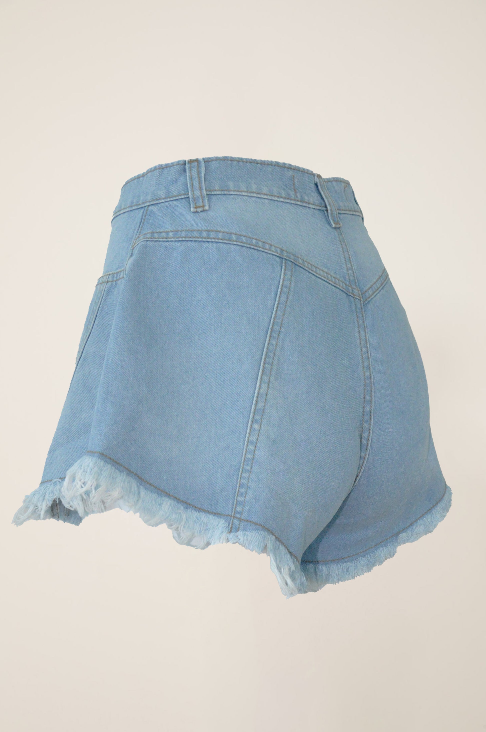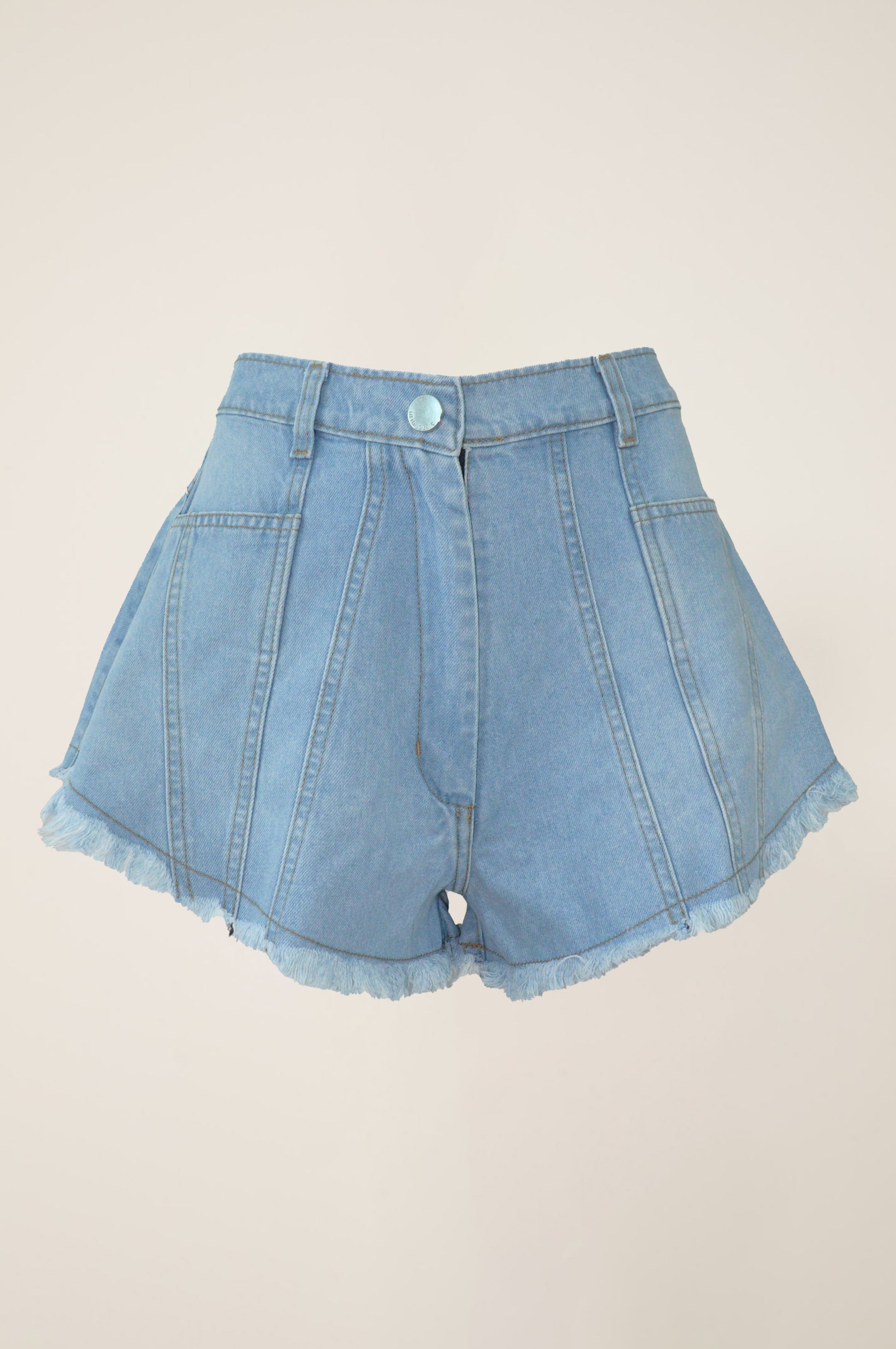 Short tiro alto en denim 100% algodón, con recortes verticales y calce acampanado.