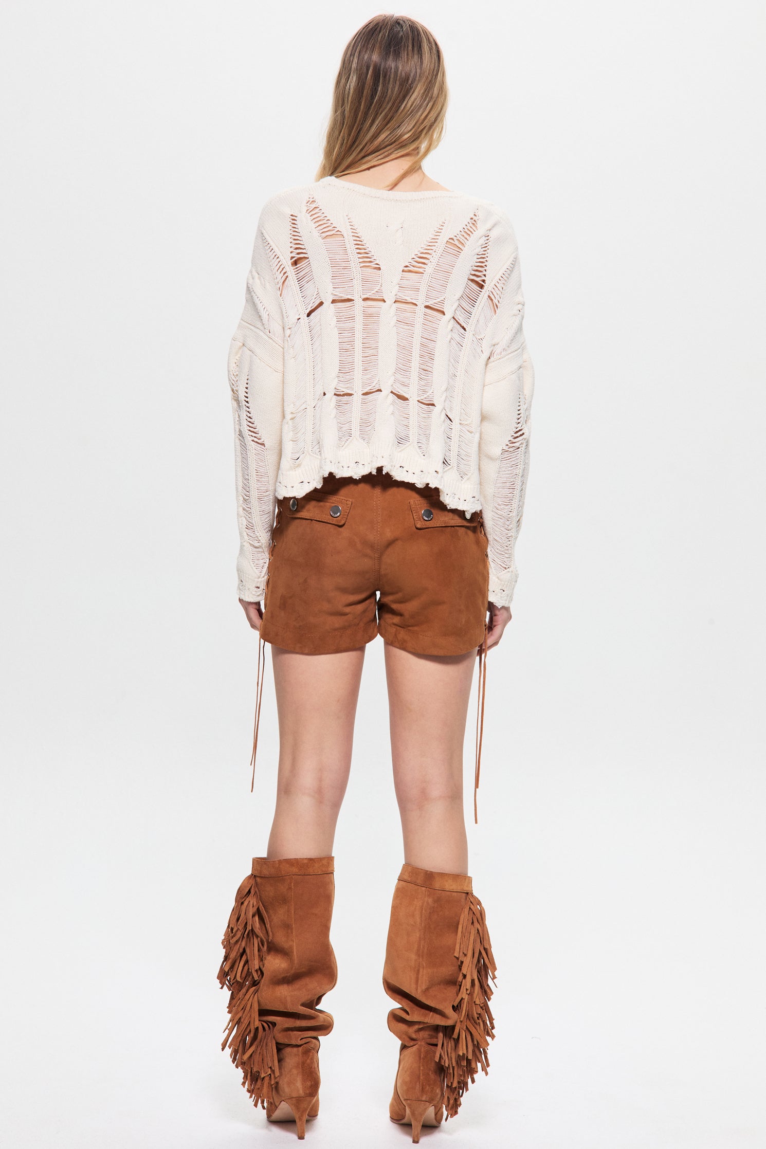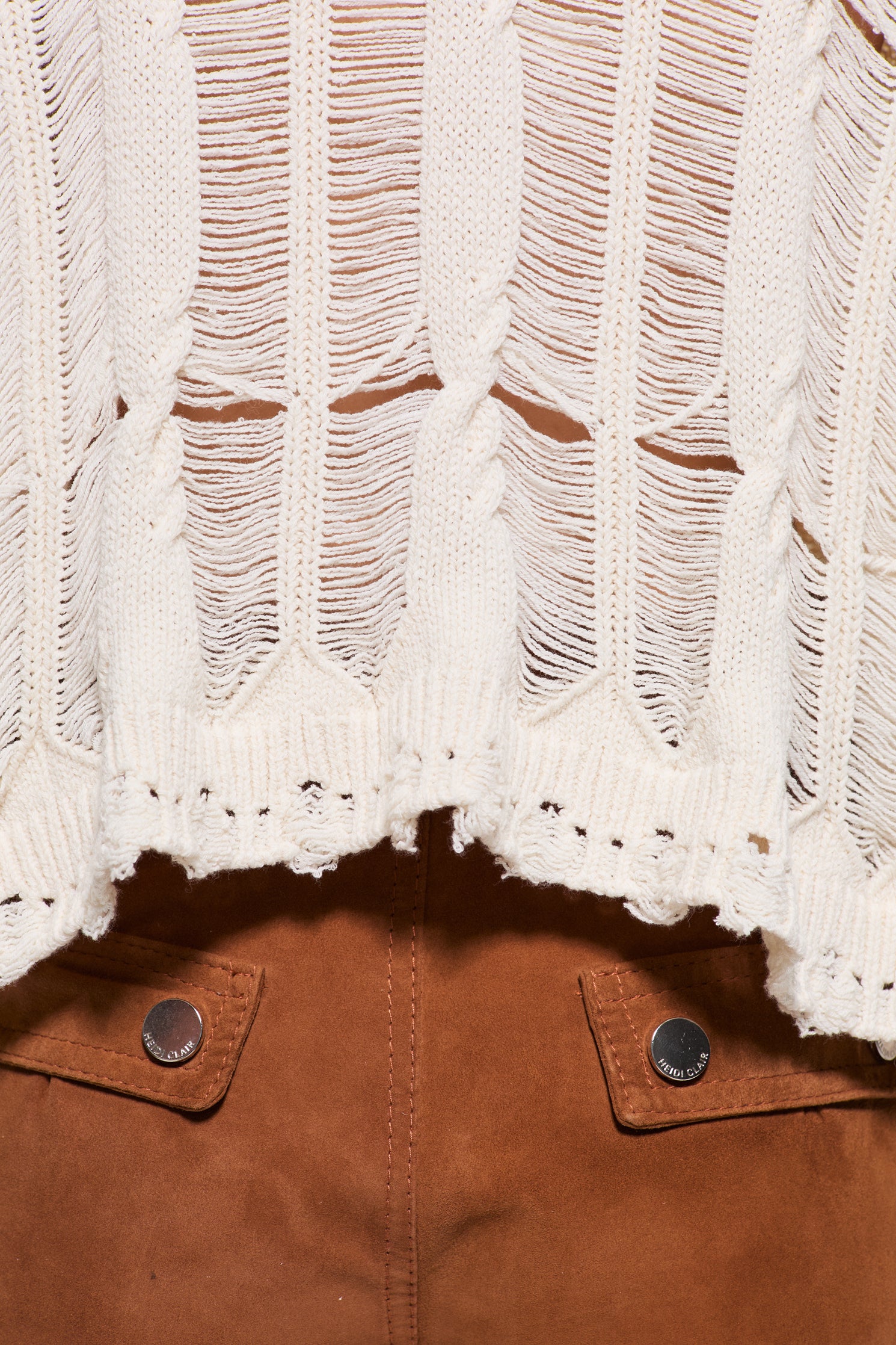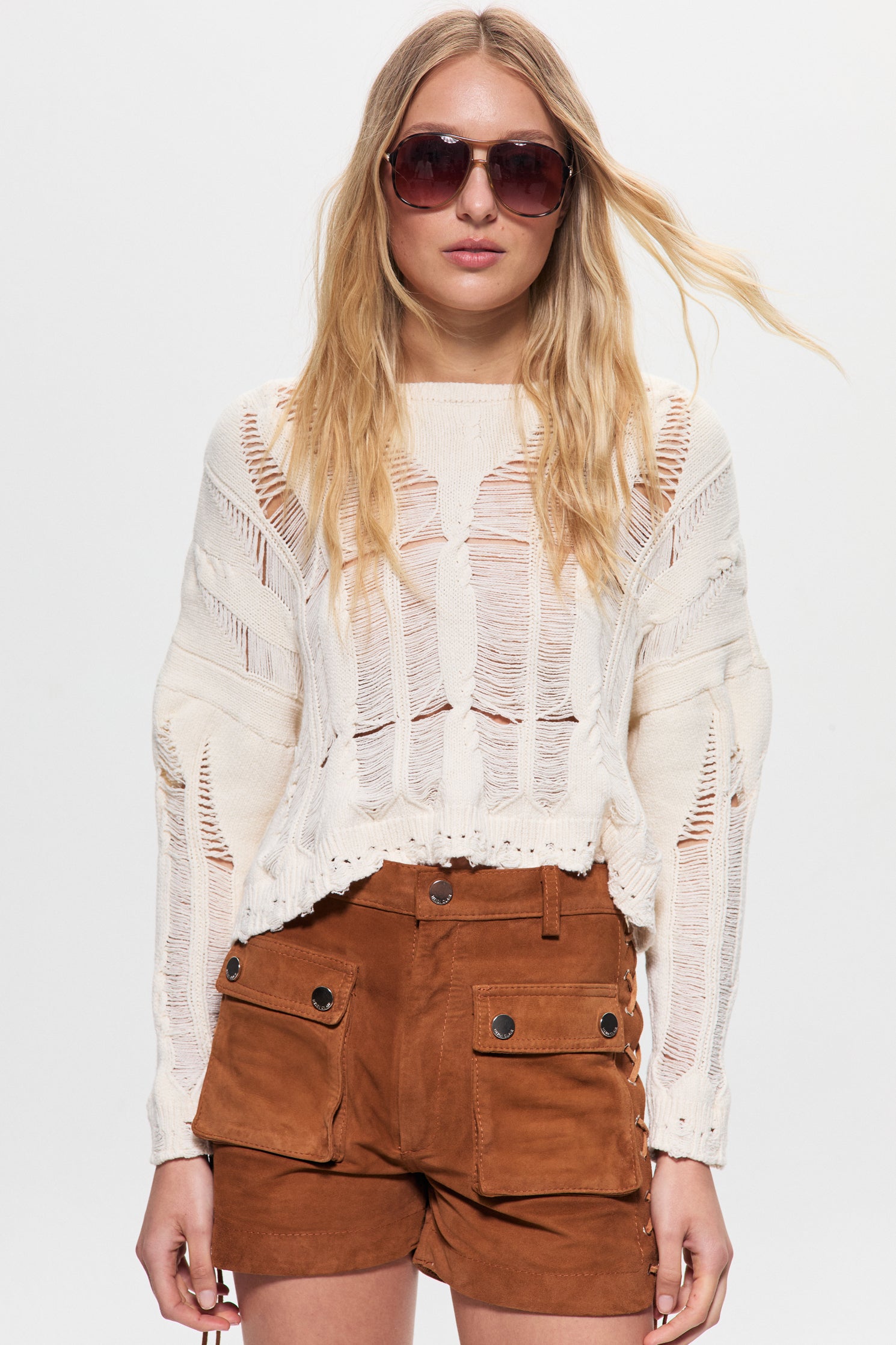 Sweater tejido en algodón 100% escote redondo con ochos en vertical y desagujados para generar espacios abiertos. Tiene terminación en cuerpo y mangas con desagujado simulando roturas.
