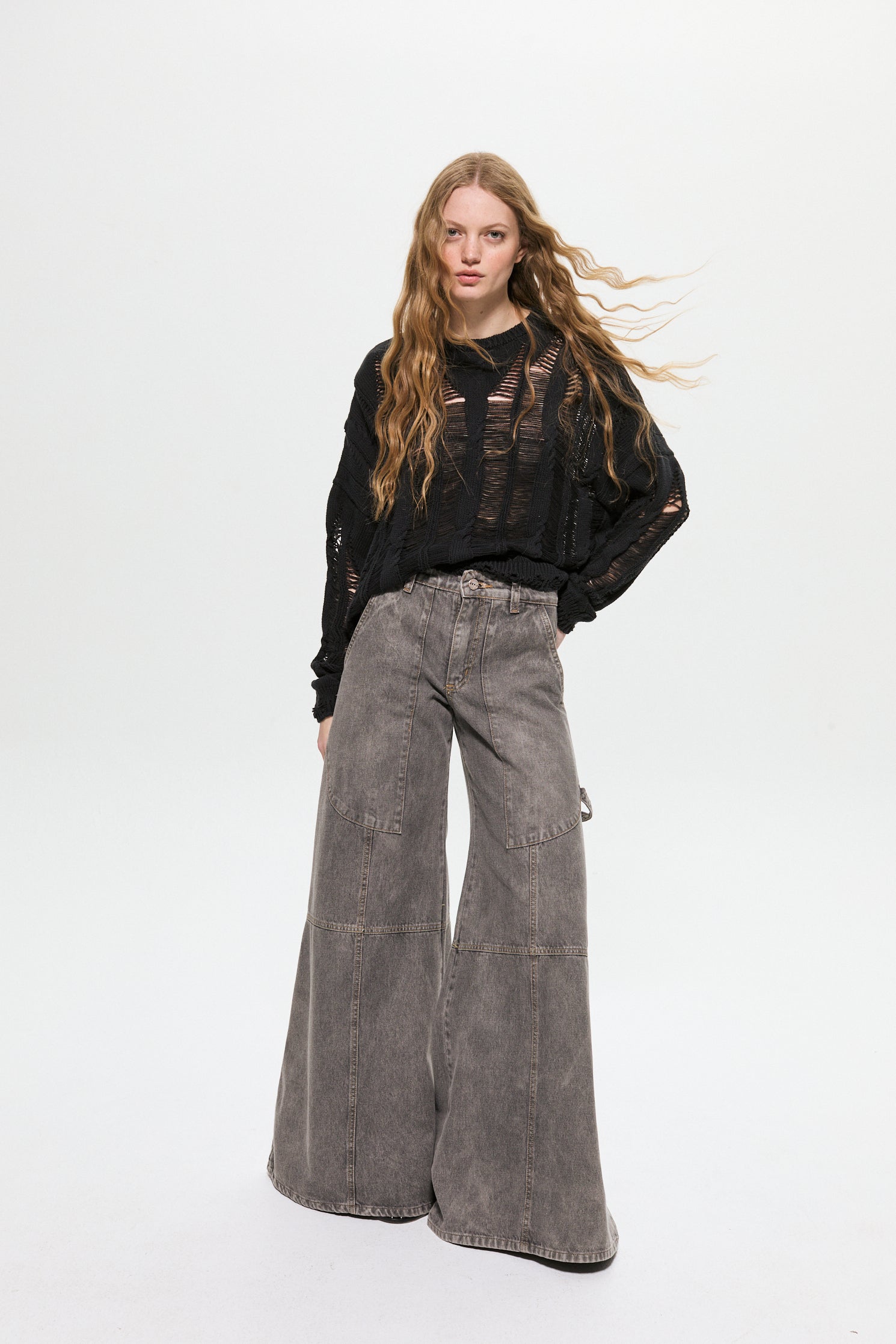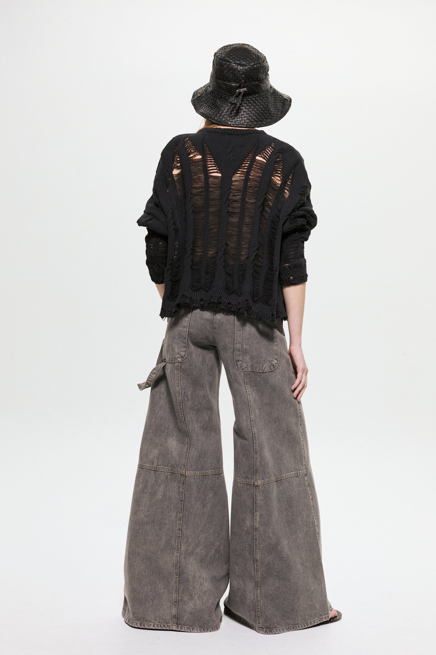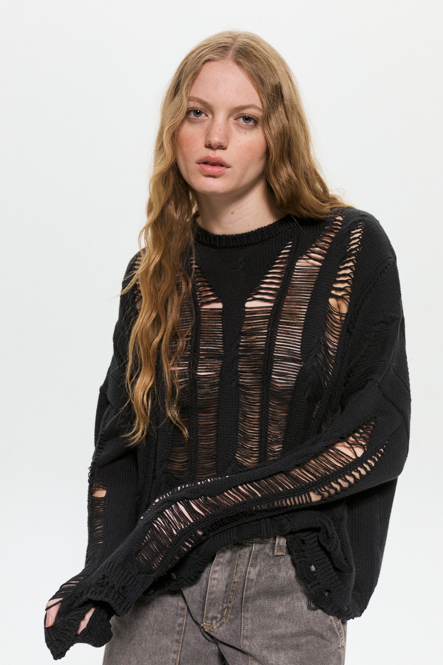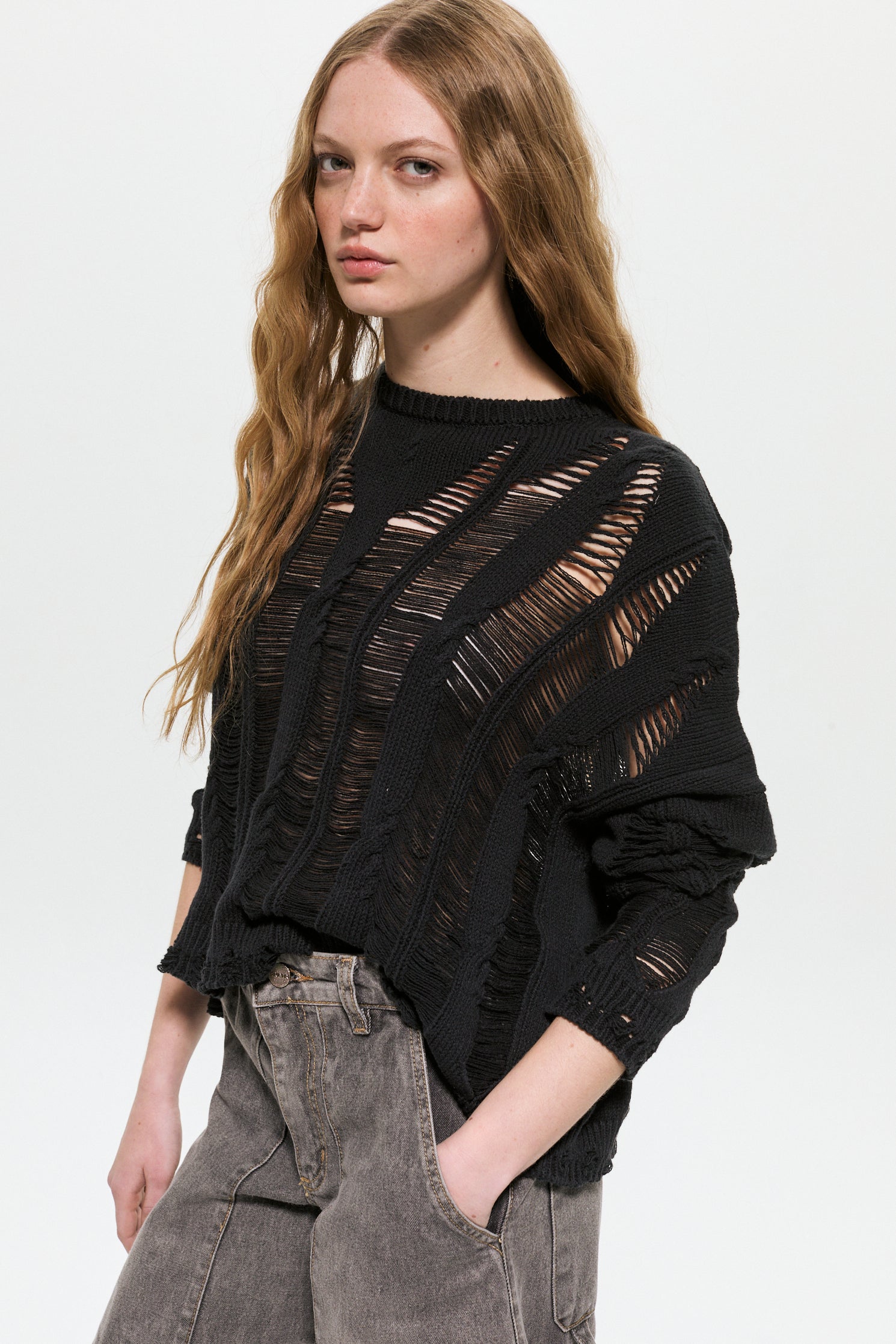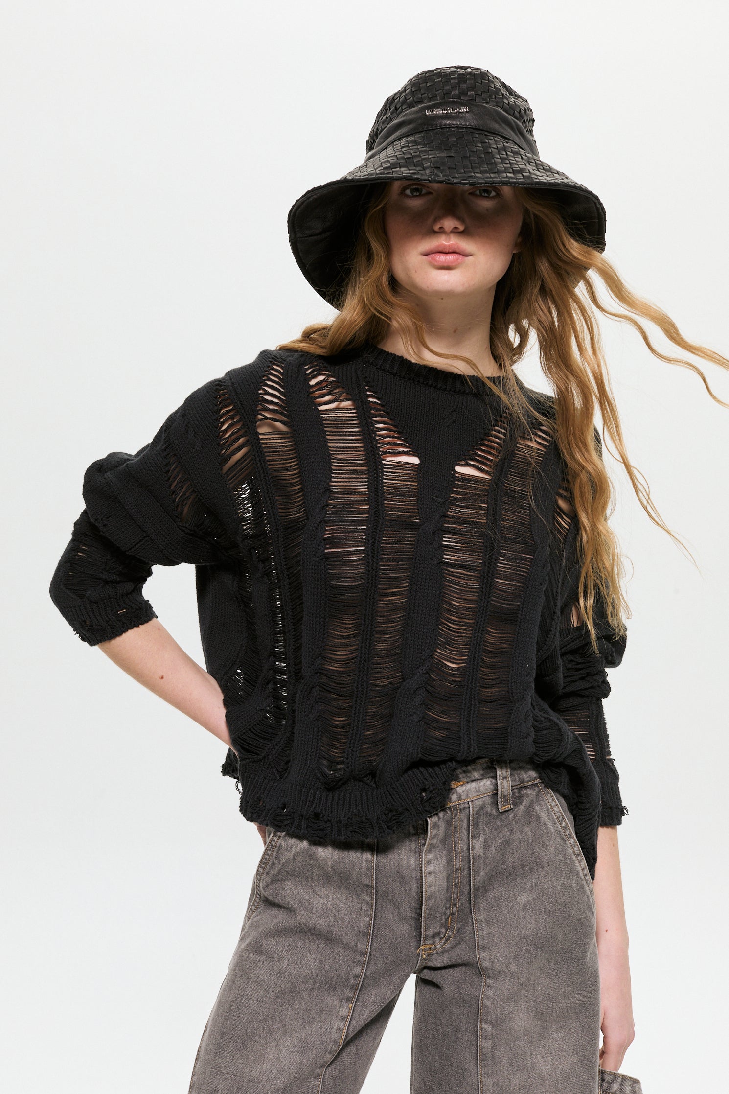 Sweater tejido en algodón 100% escote redondo con ochos en vertical y desagujados para generar espacios abiertos. Tiene terminación en cuerpo y mangas con desagujado simulando roturas.
