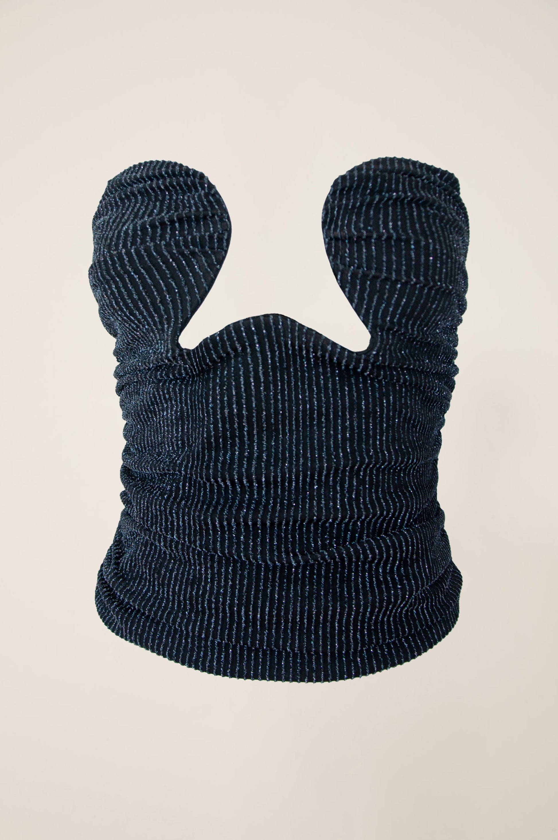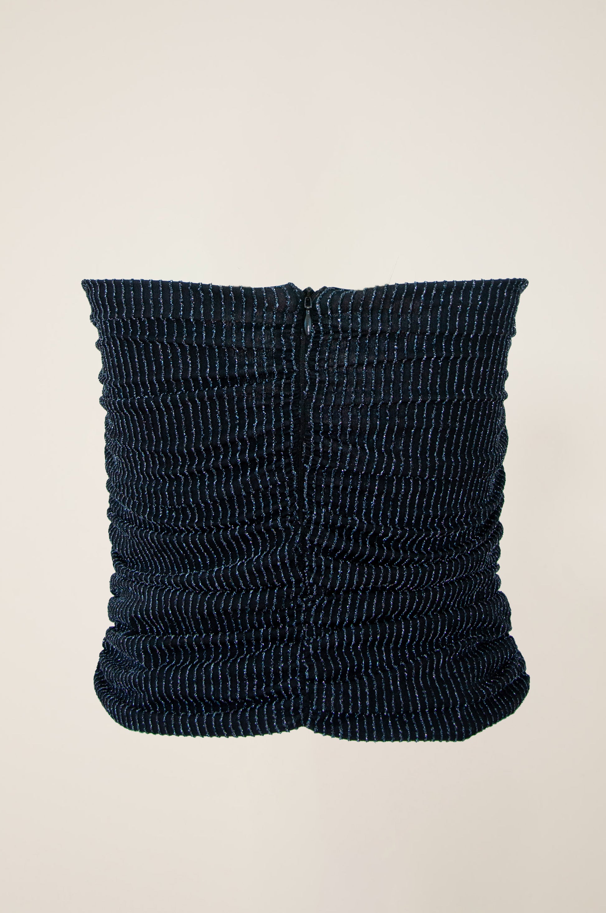 Top strapless en textil con lurex, tiene armazón redondeada en el busto para darle forma, frunces en laterales y espalda. Interior forrado.