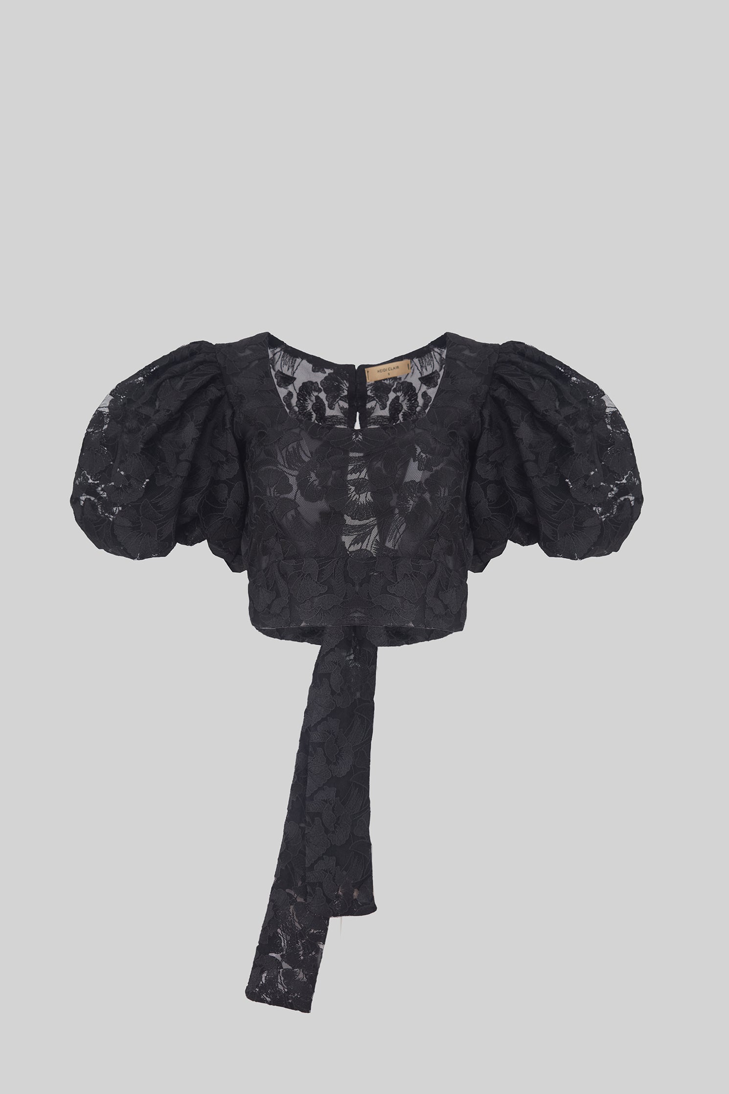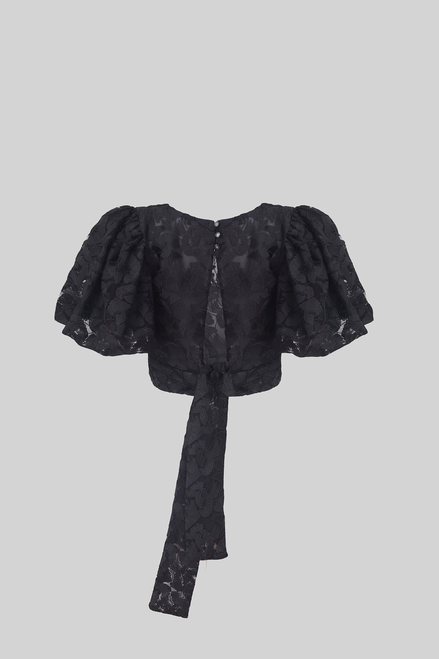 Top en guipiure color negro con mangas cortas con volúmen. Tiene escote redondo, fit al cuerpo y largo regular a la cintura. Espalda descubierta y lazo en cintura para ajustar, también tiene botón en espalda como acceso.