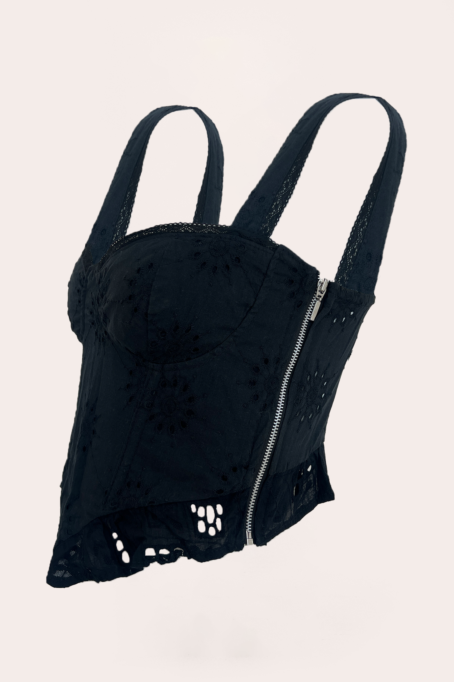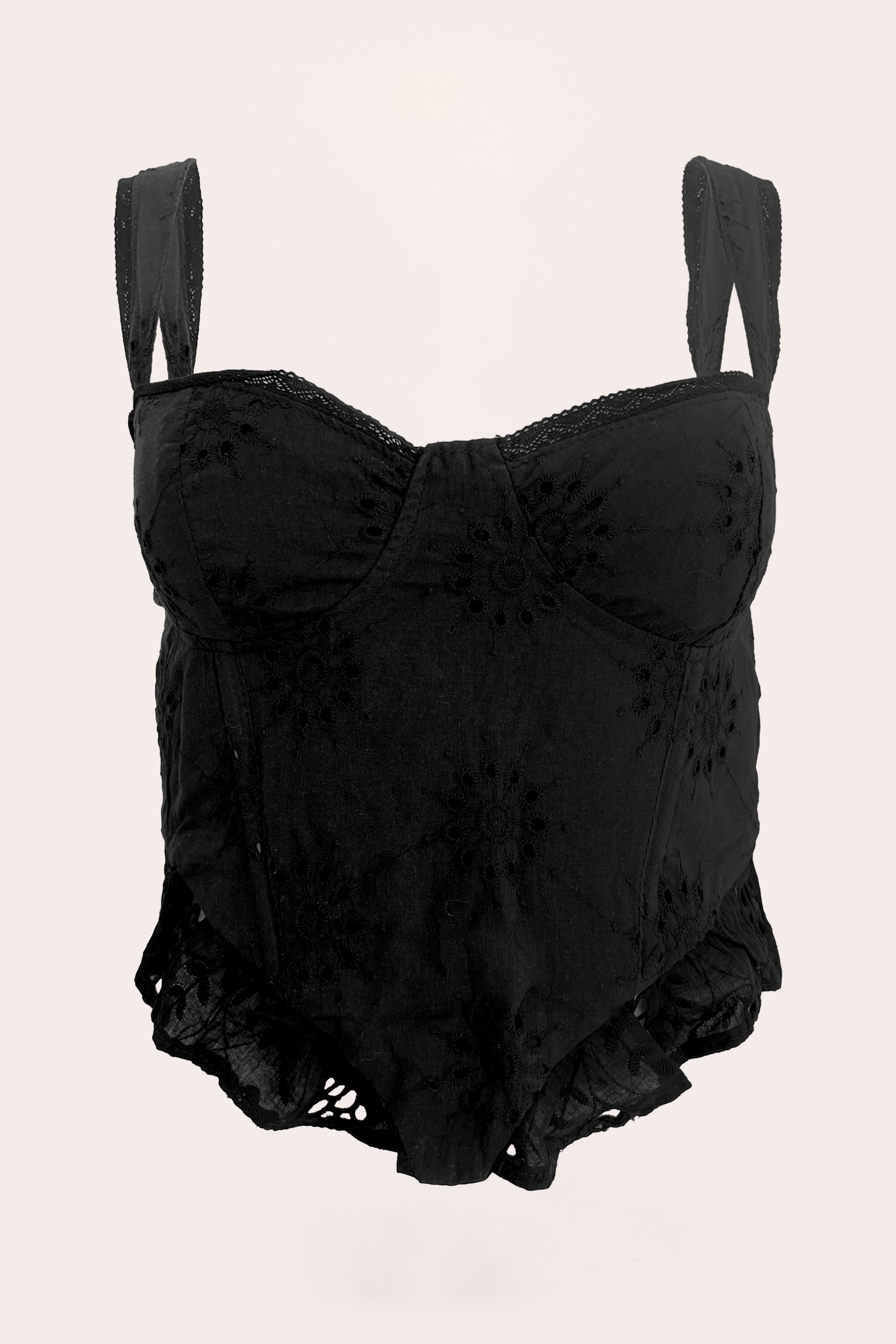 Top tipo corset en broderie de algodón con ballenas para entallar cintura, recorte en busto y breteles con detalle de puntillas en todo su contorno. Tiene detalle de volados en broderie a tono en todo el contorno de cintura. Ruedo irregular , fit al cuerpo y largo a la cintura.