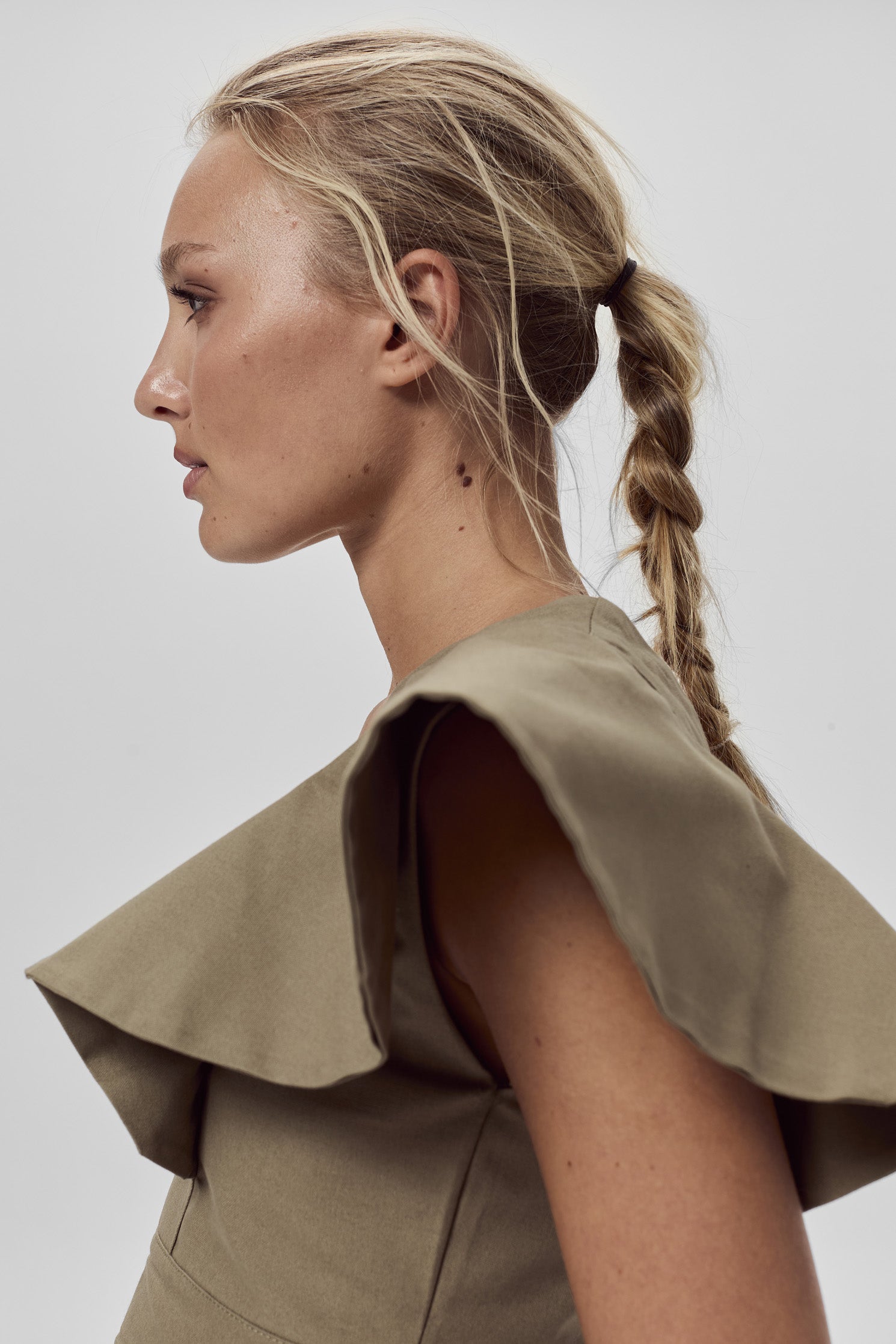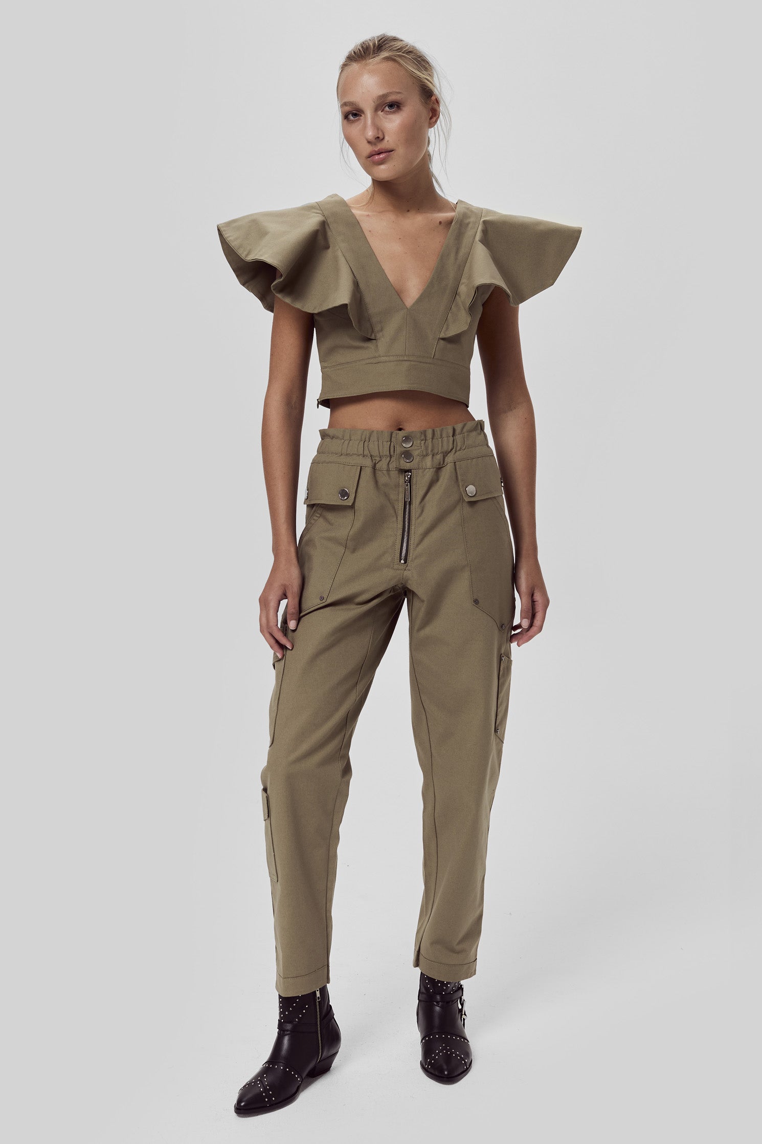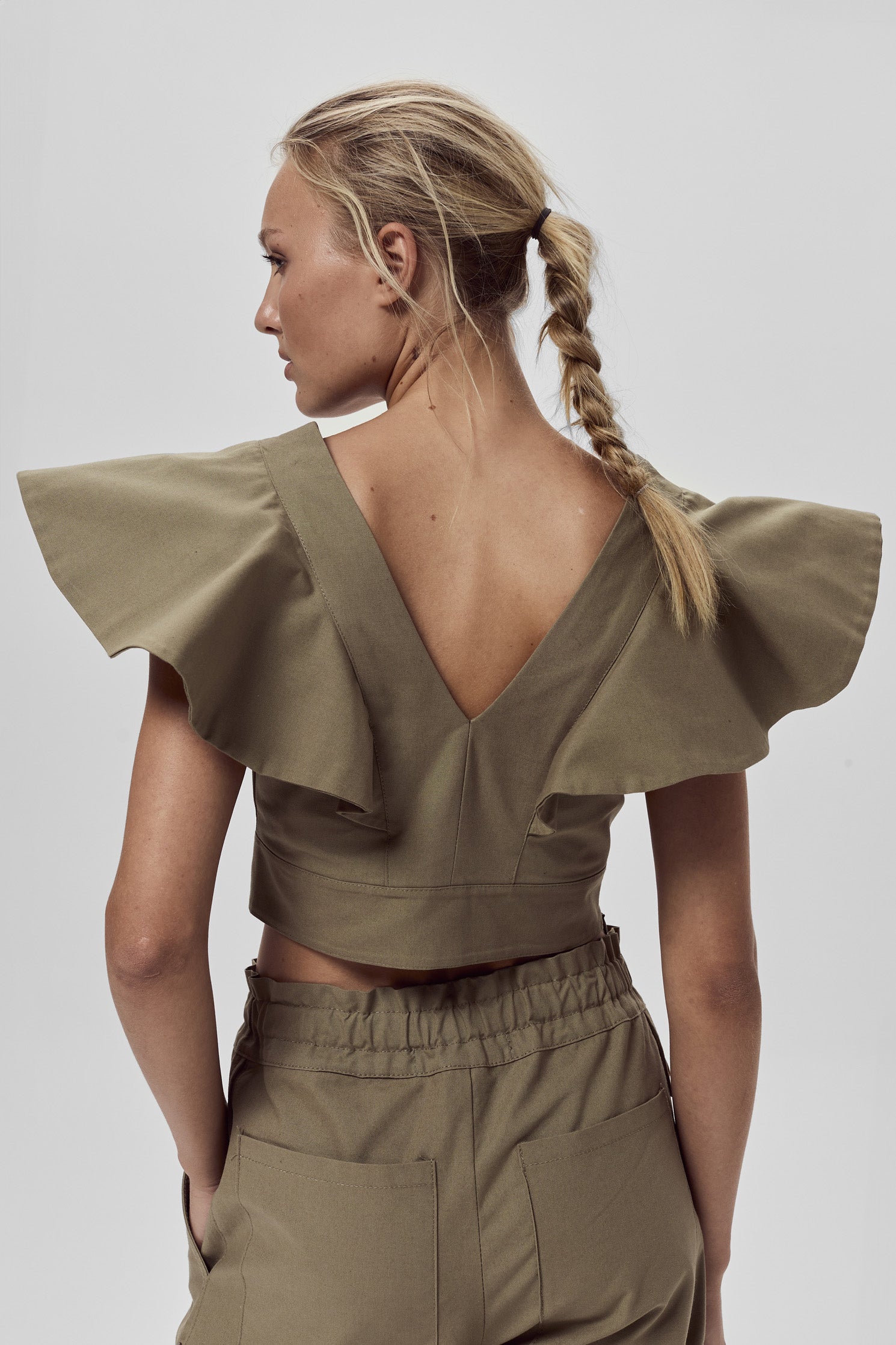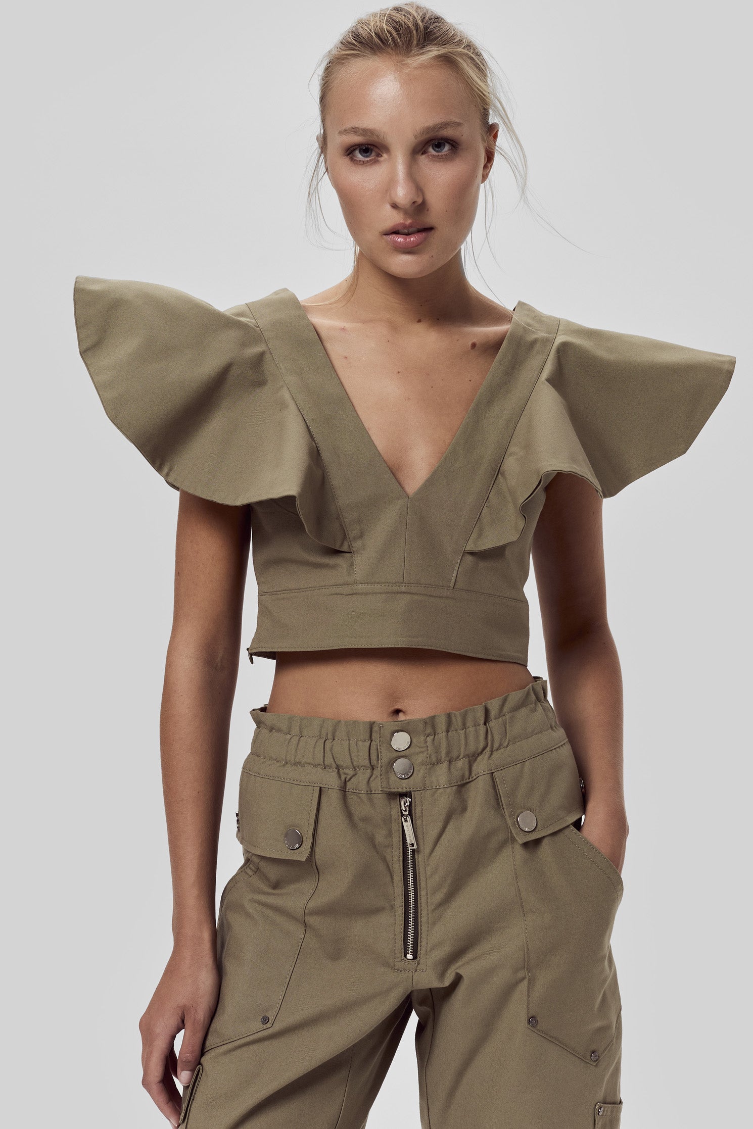 Top corto de fit al cuerpo, confeccionado en gabardina liviana de algodón, escote V con volados sobre los hombros. Acceso a la prenda mediante un cierre lateral.