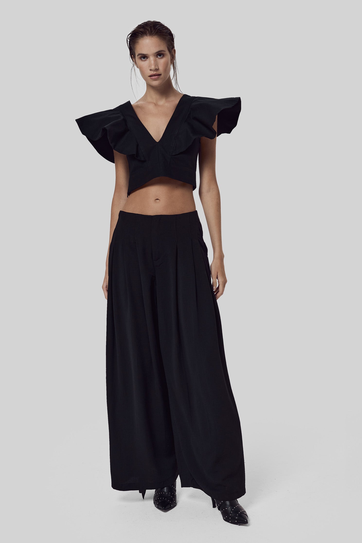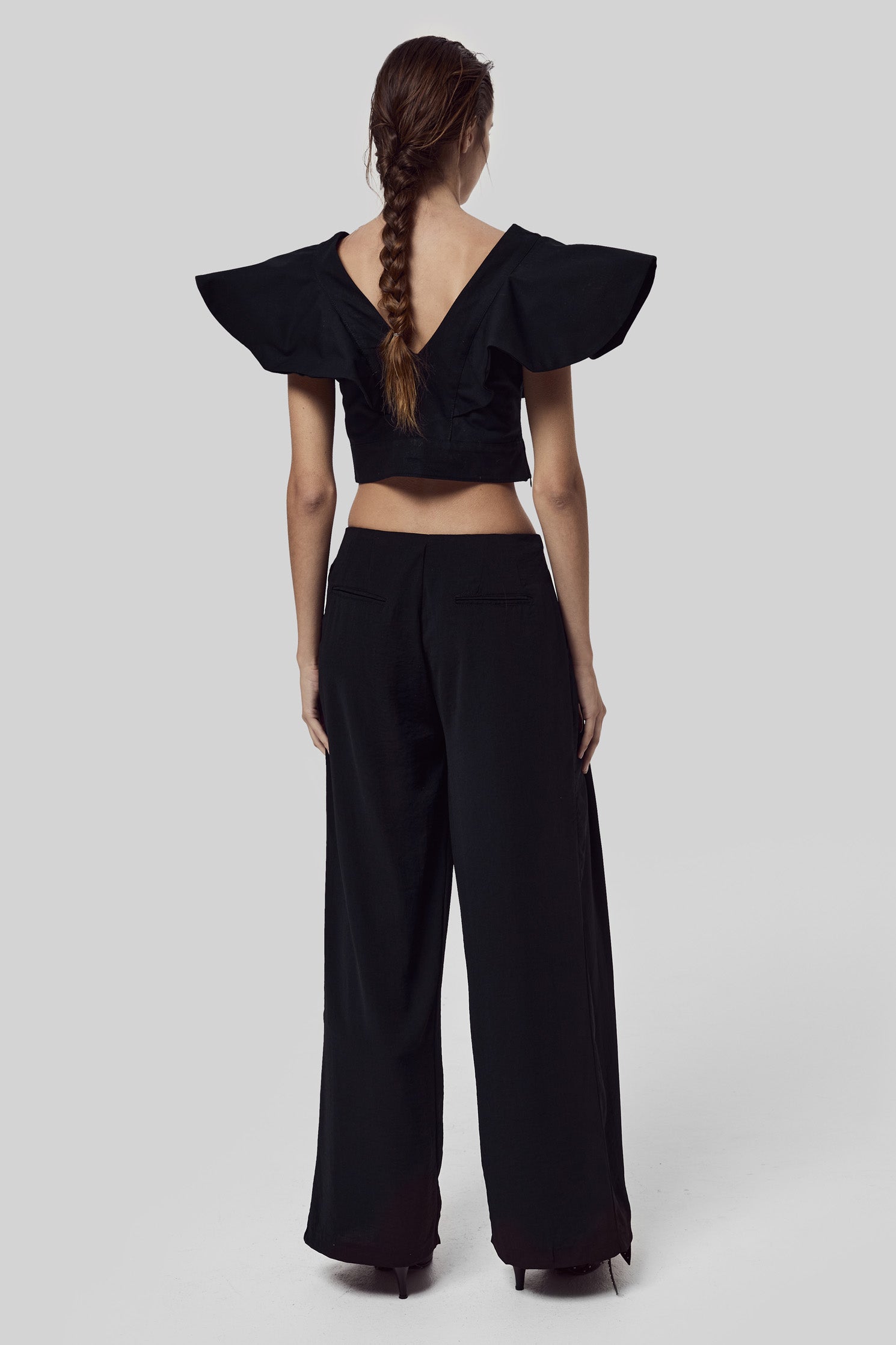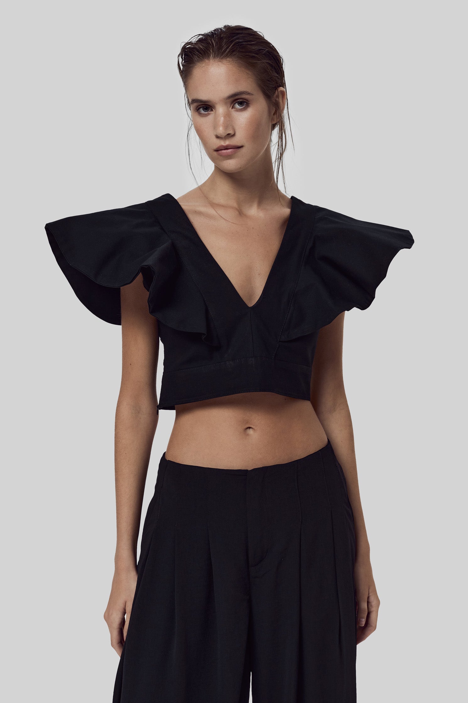 Top corto de fit al cuerpo, confeccionado en gabardina liviana de algodón, escote V con volados sobre los hombros. Acceso a la prenda mediante un cierre lateral.