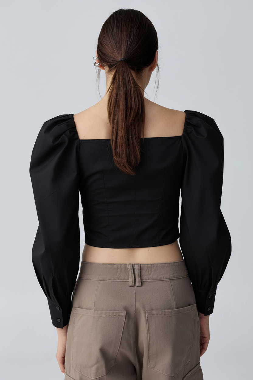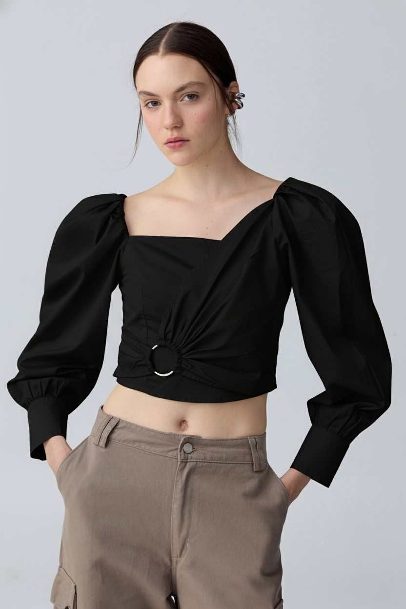 Top en poplin de algodón, con cruce en delantero con argolla metálica y escote cuadrado. Tiene mangas con volúmen y puños con botones. Largo regular a la cintura.