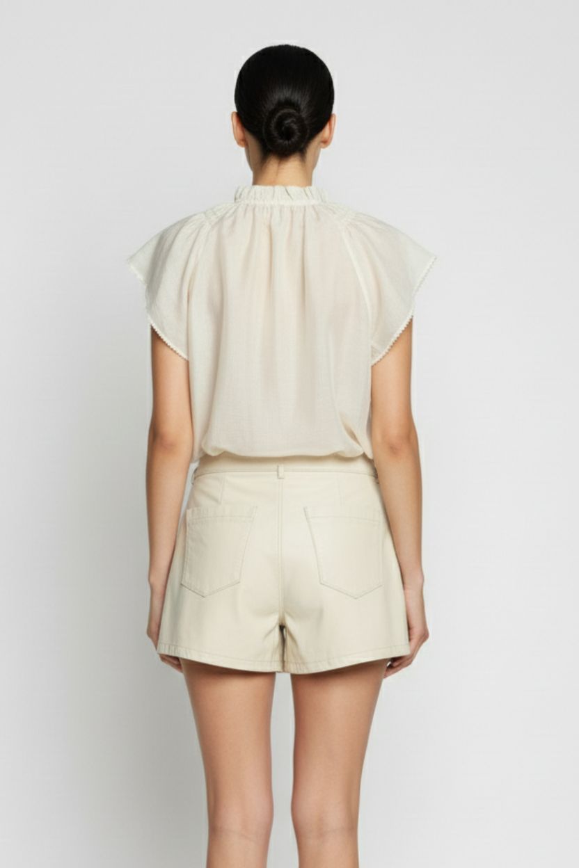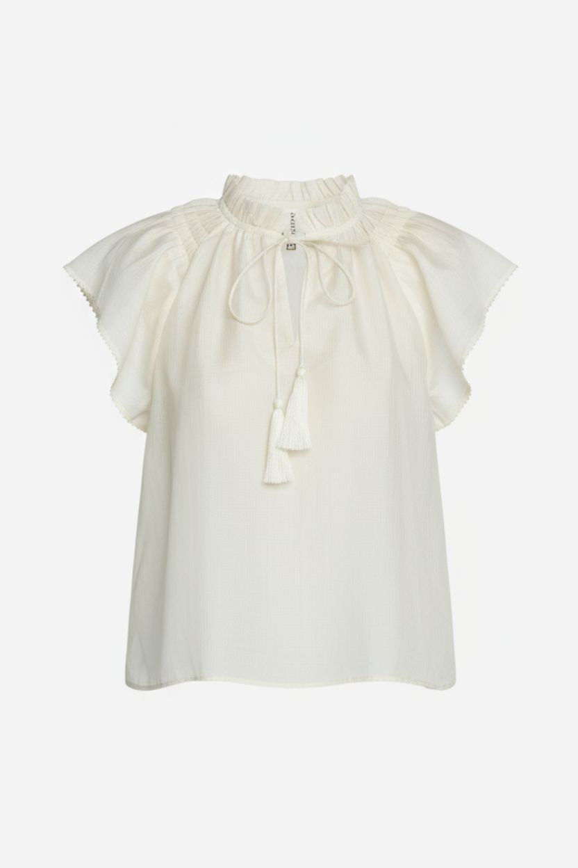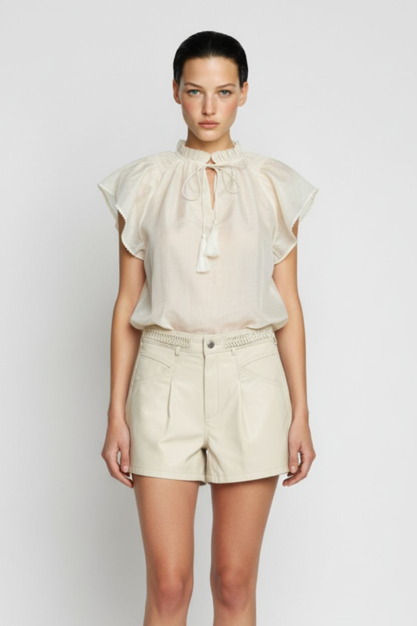 Top realizado en algodón y seda, escote en V con lazo y detalle de punto smock en hombro. Cuello mao con terminación de volado con picot, largo de la prenda sobre la primer cadera.