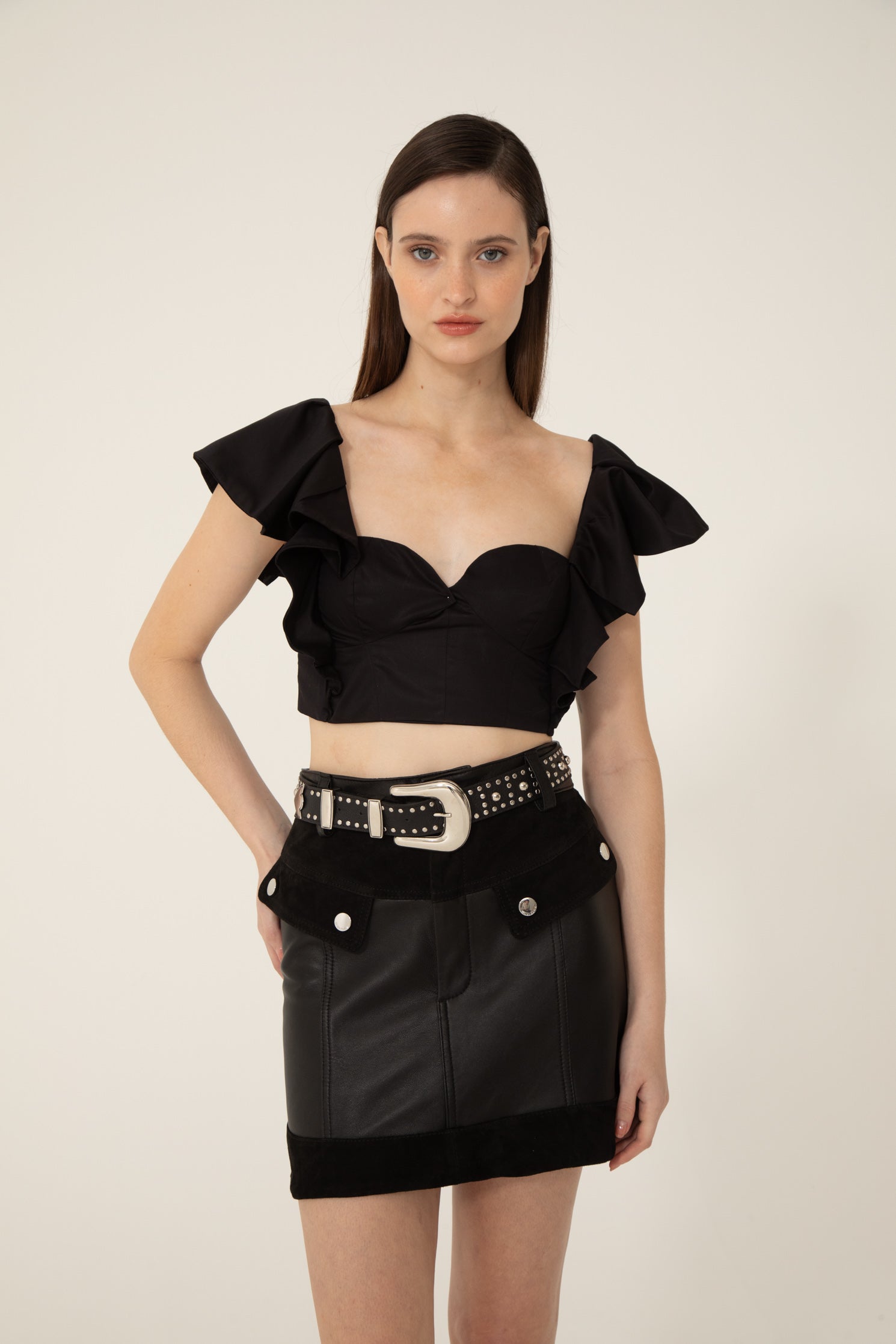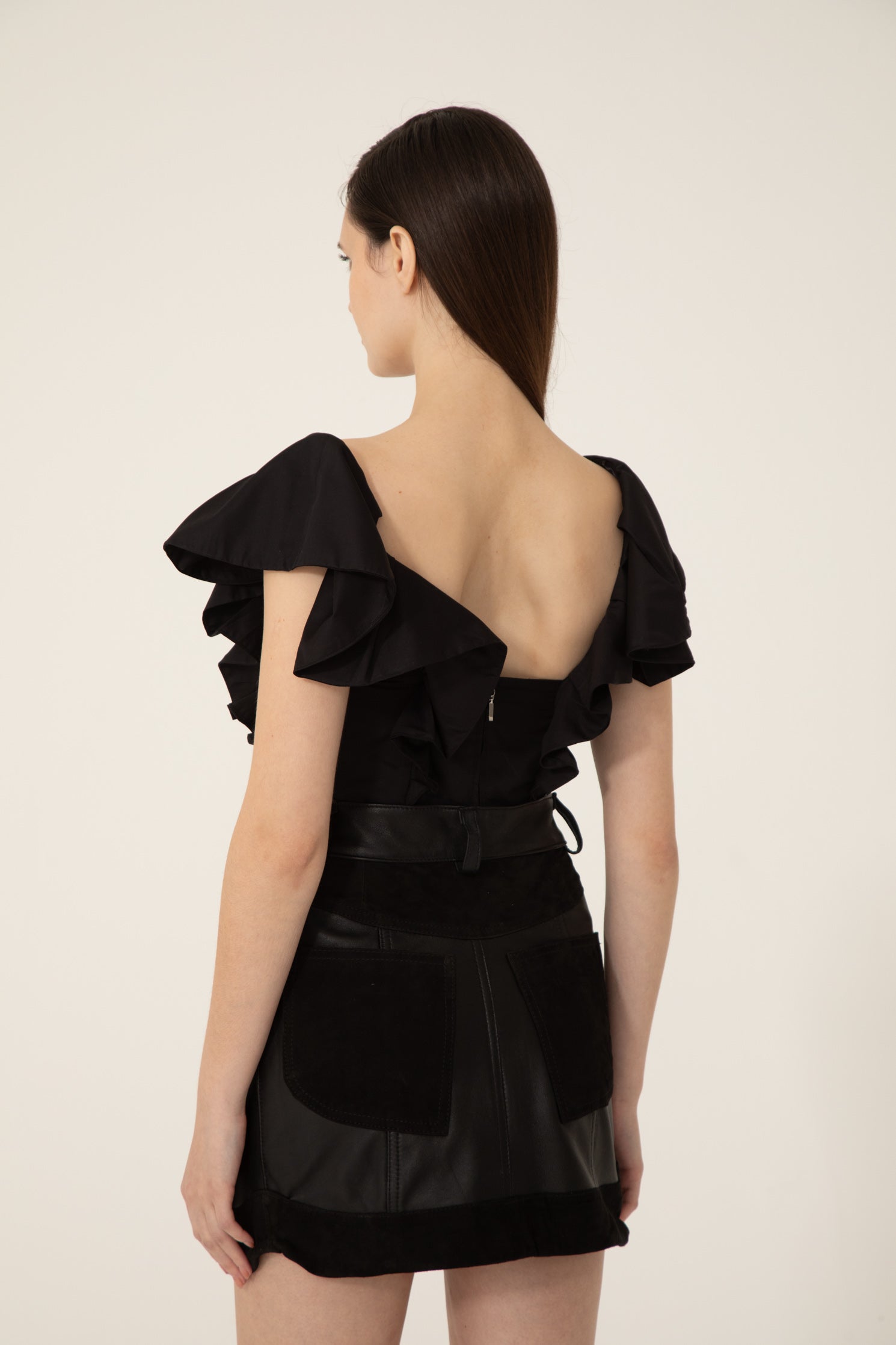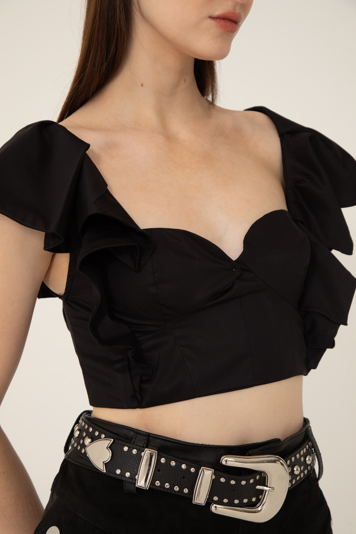 Top en Poplin 100% algodón con volados tipo manga, largo regular debajo del busto y recortes en busto para darle forma. Acceso mediante cierre metálico en espalda.