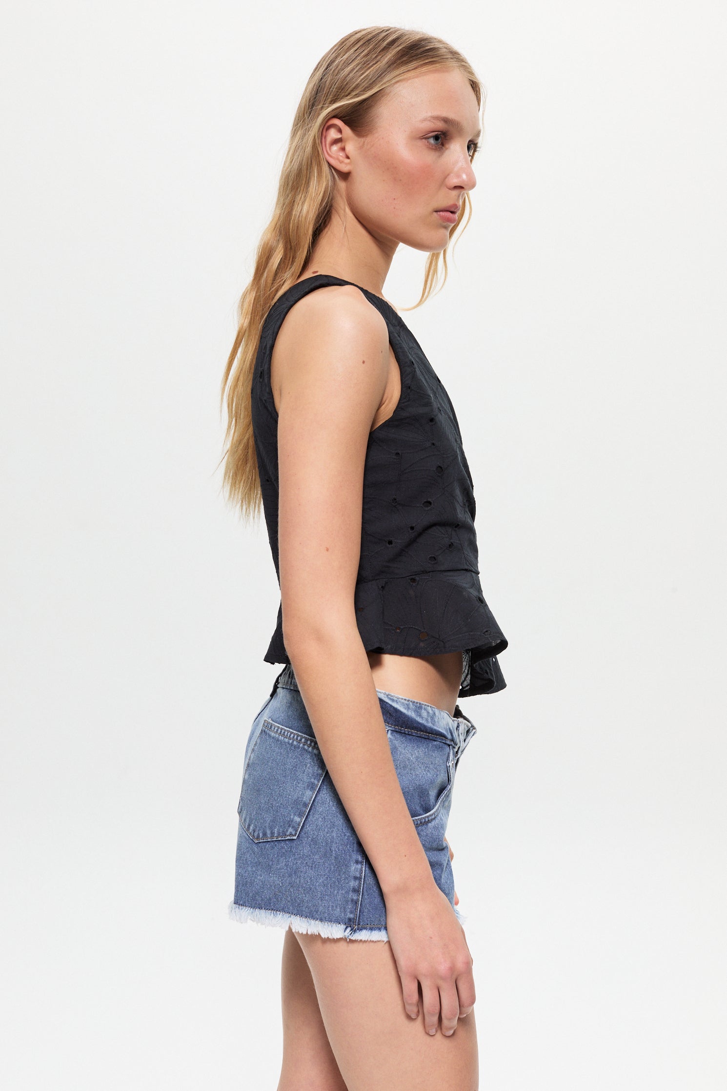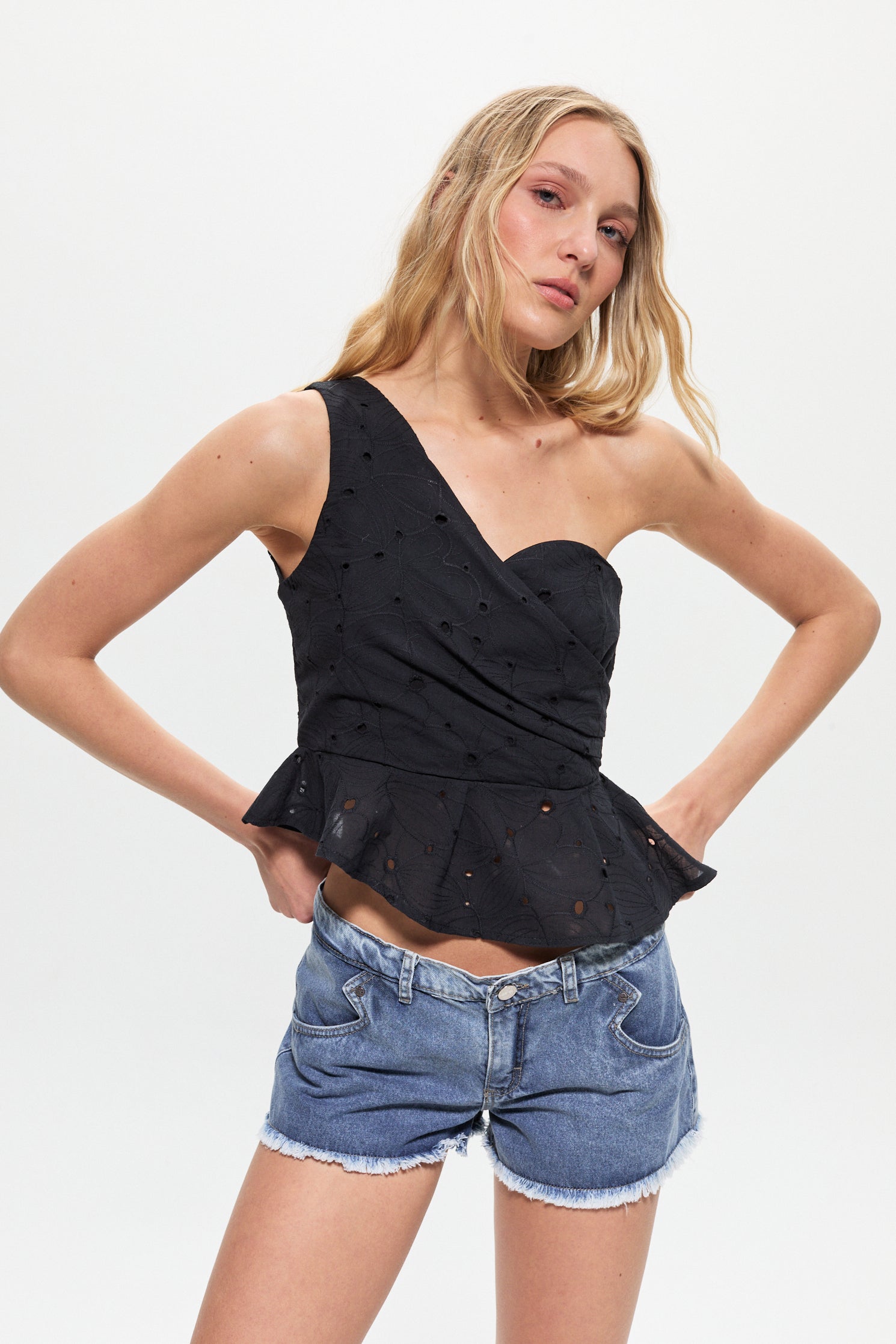 Top en broderie de algodón con un solo hombro, sin mangas y escote irregular. Tiene corte en cintura y hacia abajo volados en todo el contorno. Fit al cuerpo hasta cintura y luego evasé. Largo regular a la primer cadera.