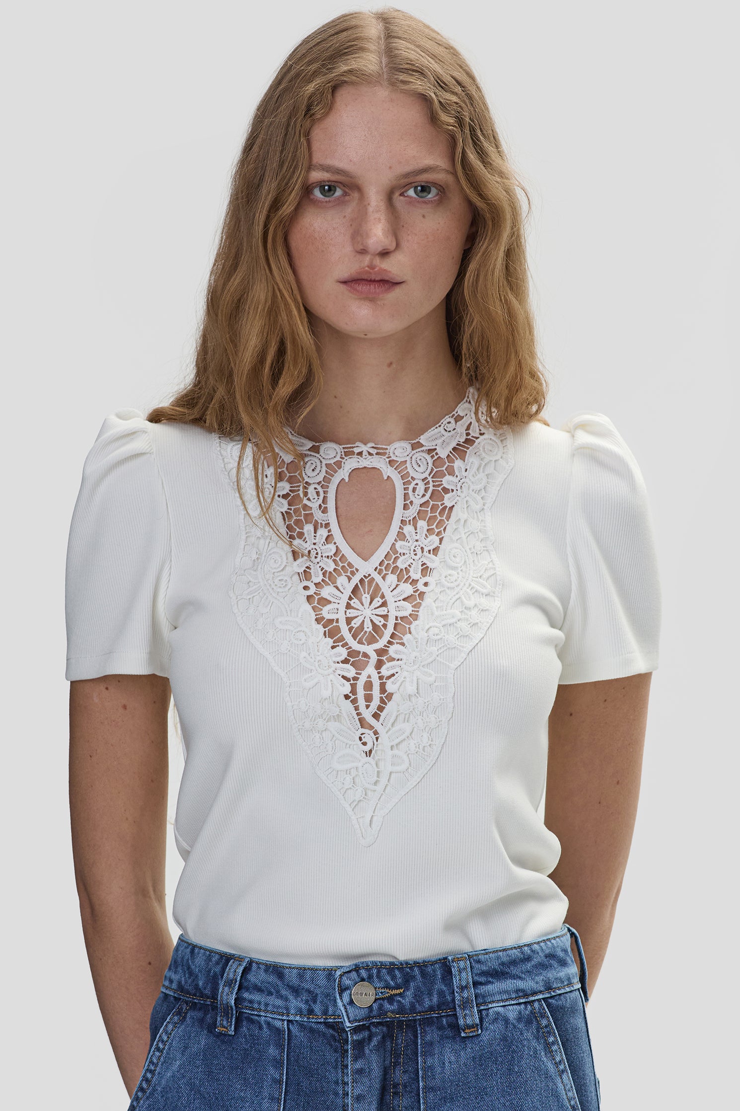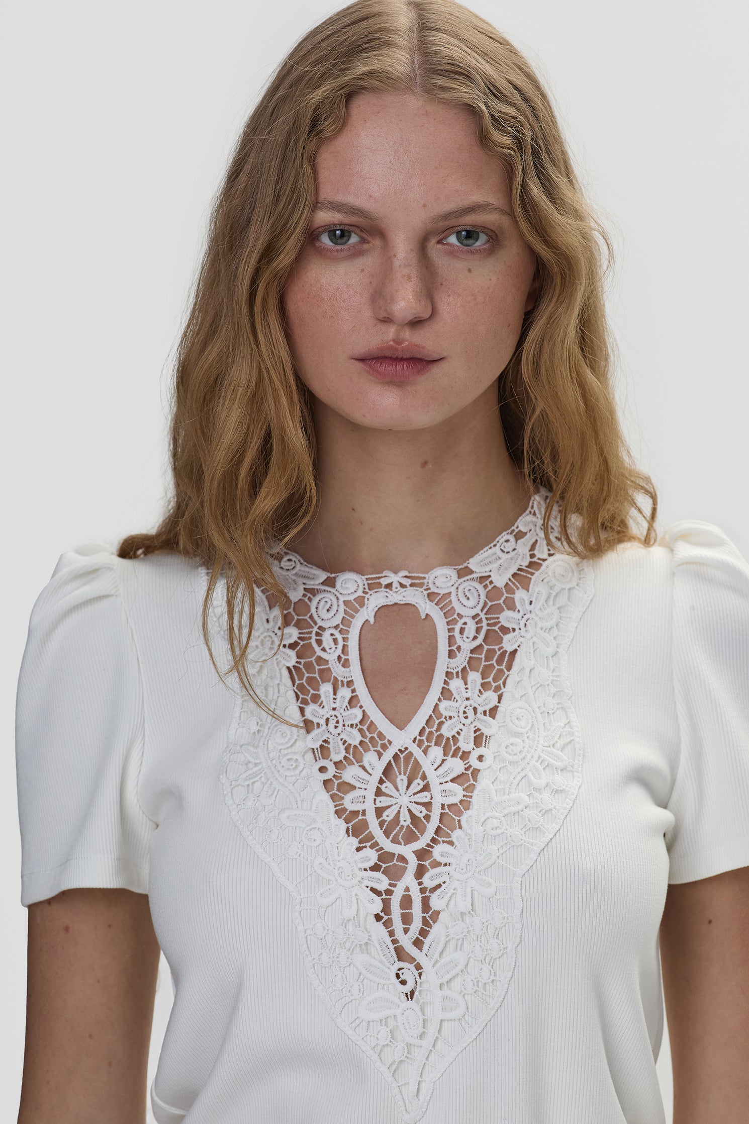 Top al cuerpo con aplique central en escote a tono que llega hasta el busto.
