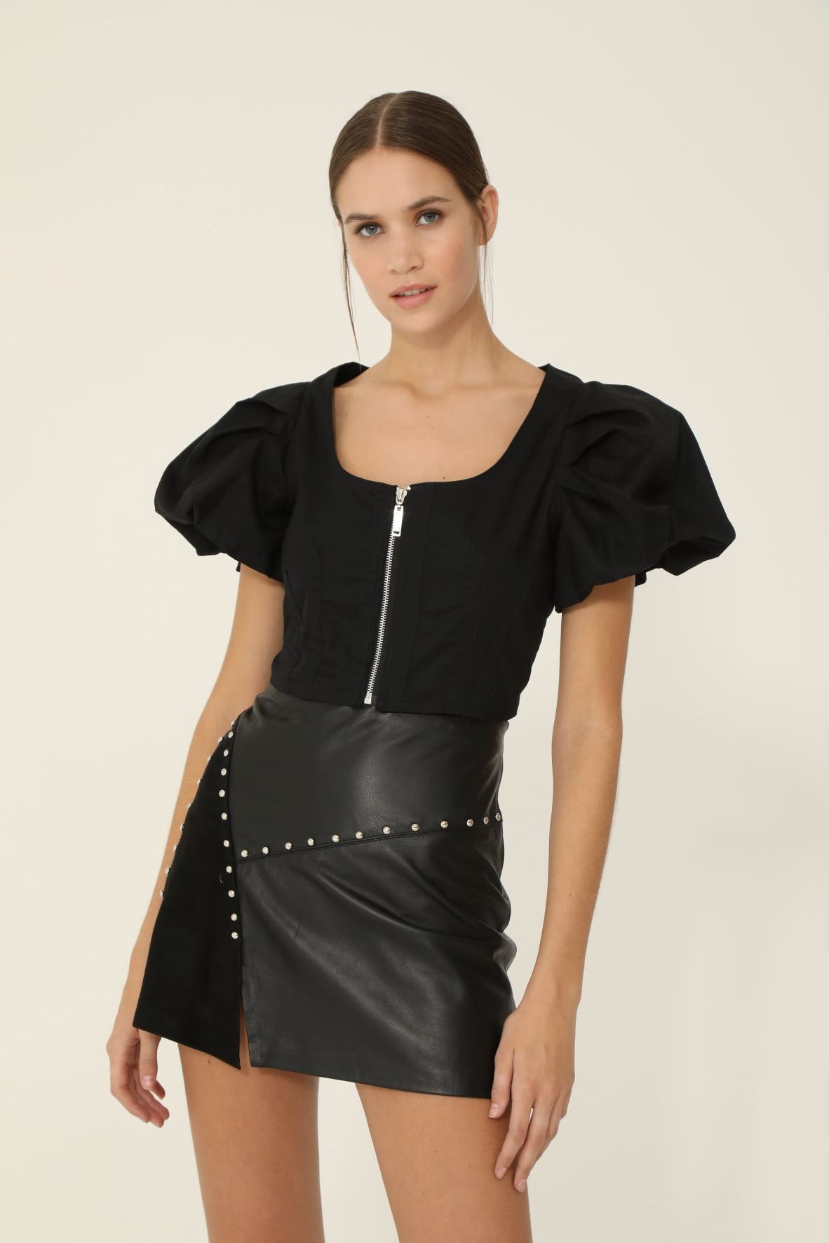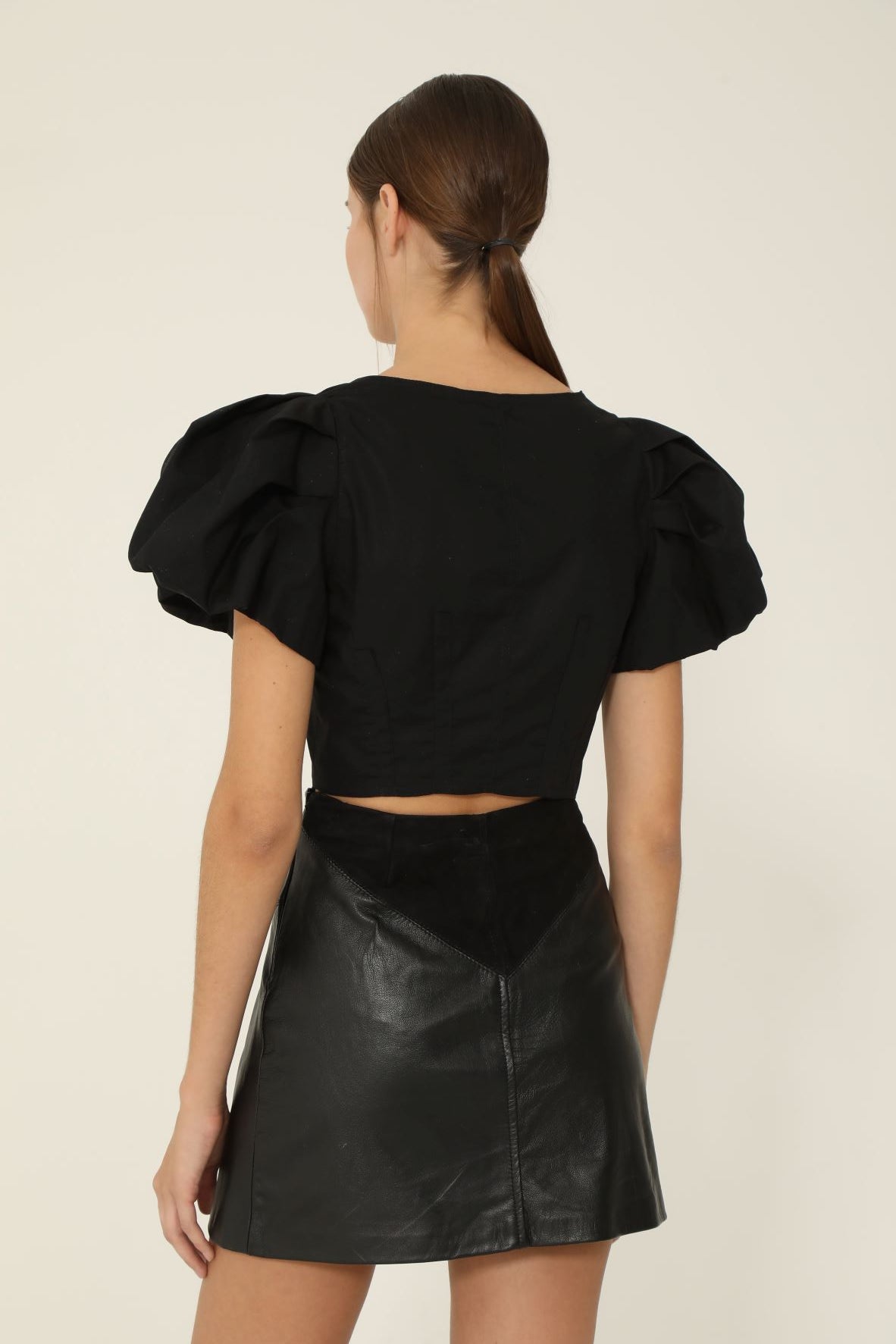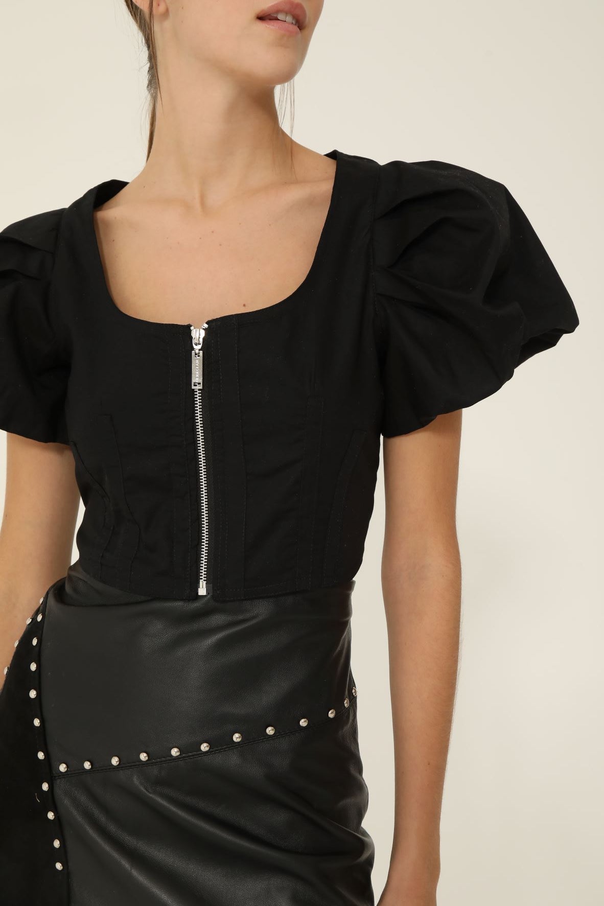 Top en poplin de algodón con mangas cortas con volumen, fit al cuerpo y largo regular a la cintura. Delantero con cierre desmontable como acceso.