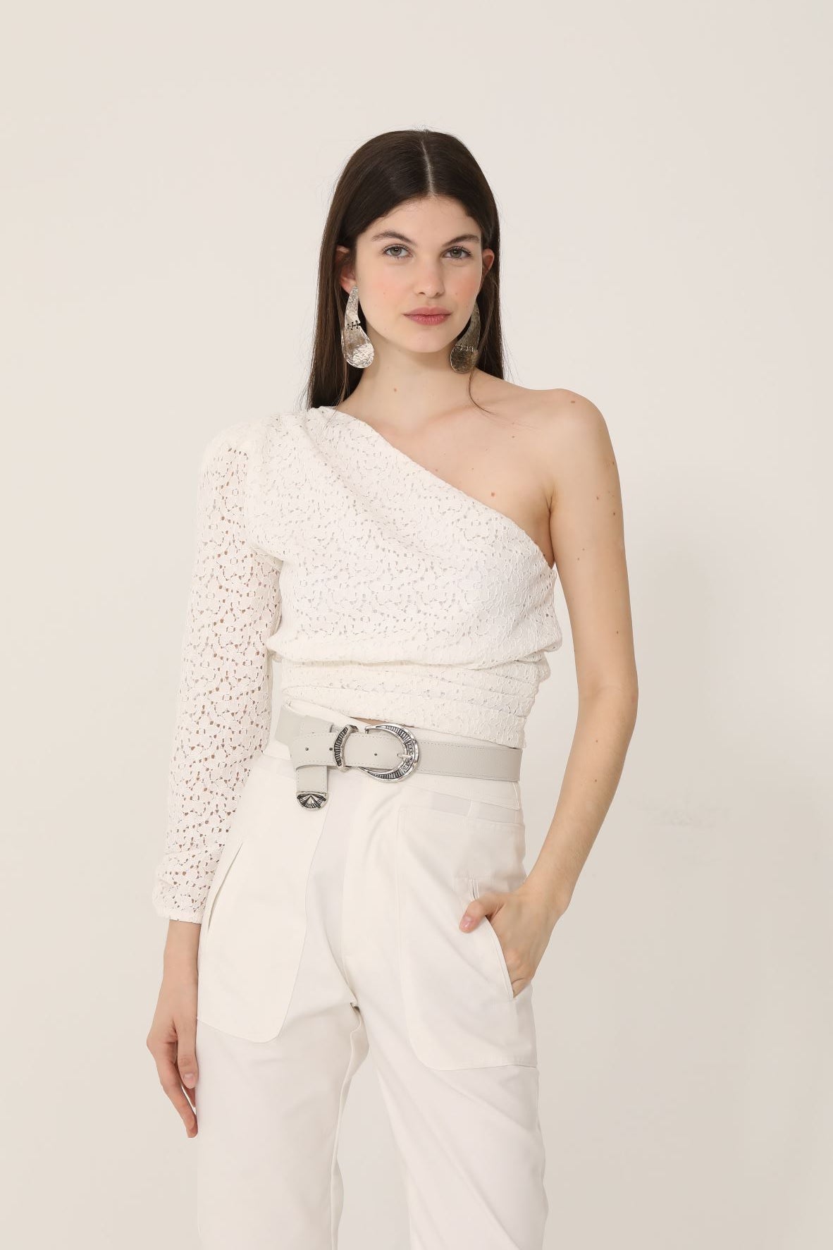Top en broderie con una sola manga princesa, frunce en hombro y en manga, alforzas en cintura y cierre invisible en lateral.