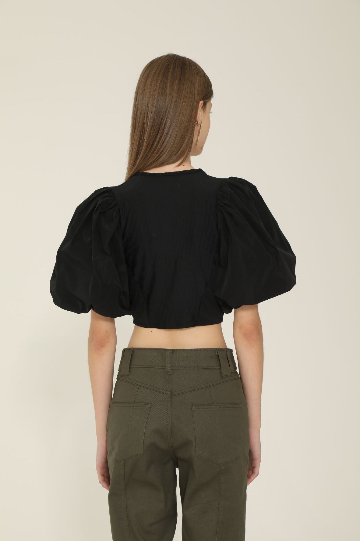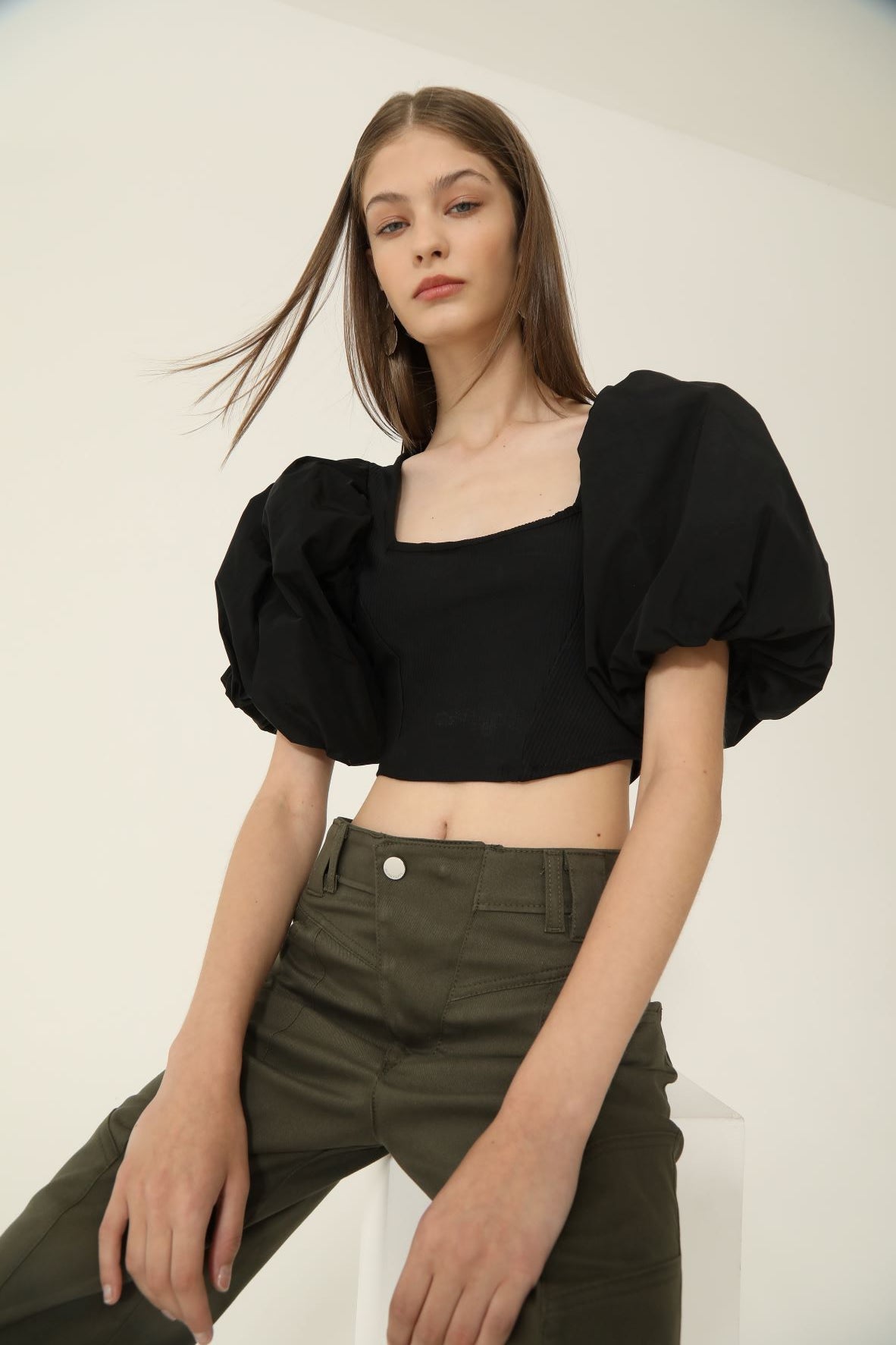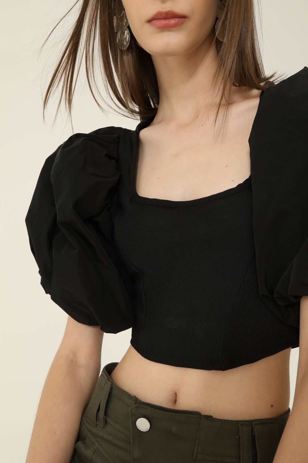 Top en morley con recortes en delantero, escote cuadrado y mangas cortas con volumen en tela combinación a tono. Fit al cuerpo y largo regular a la cintura.