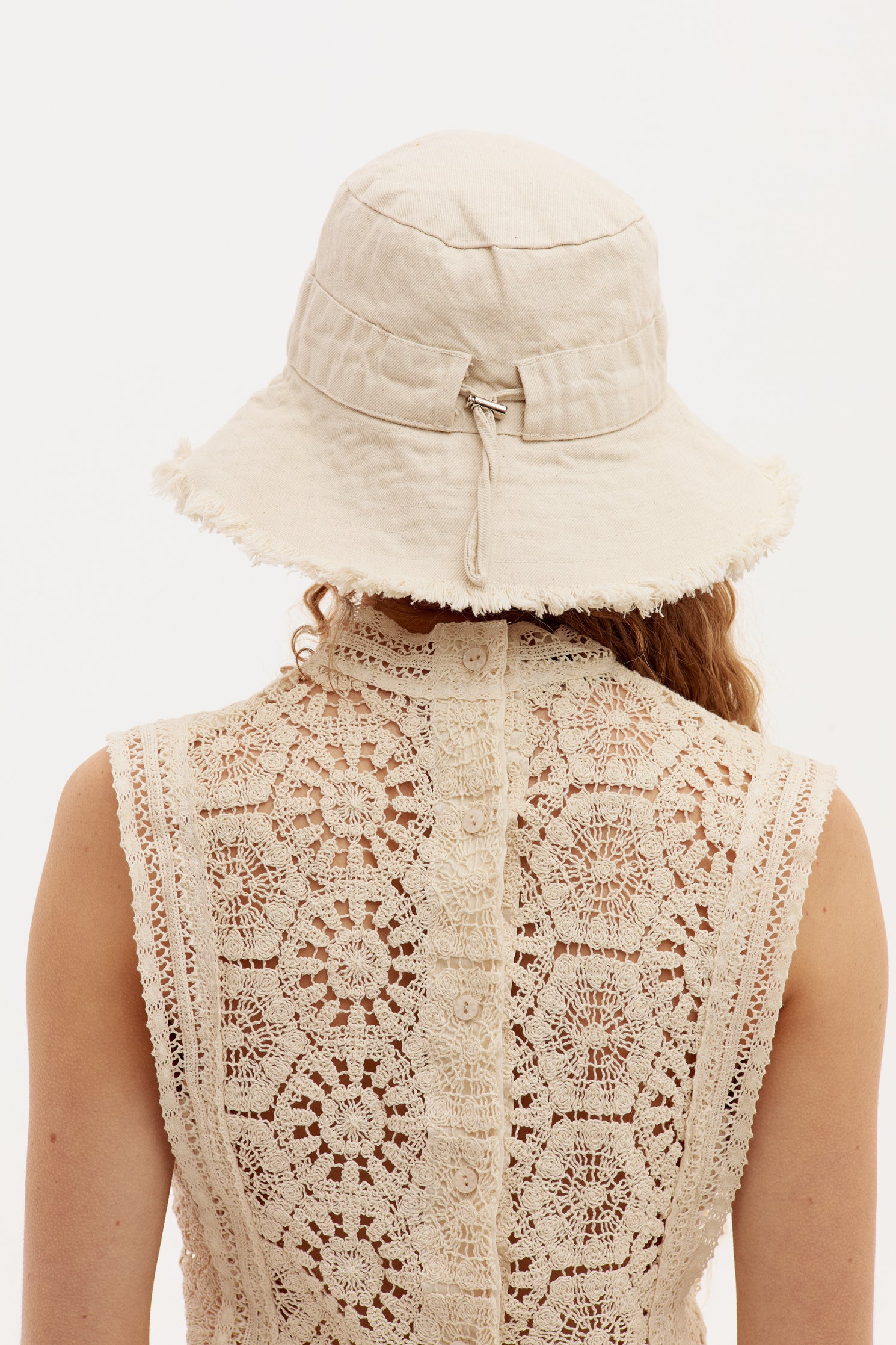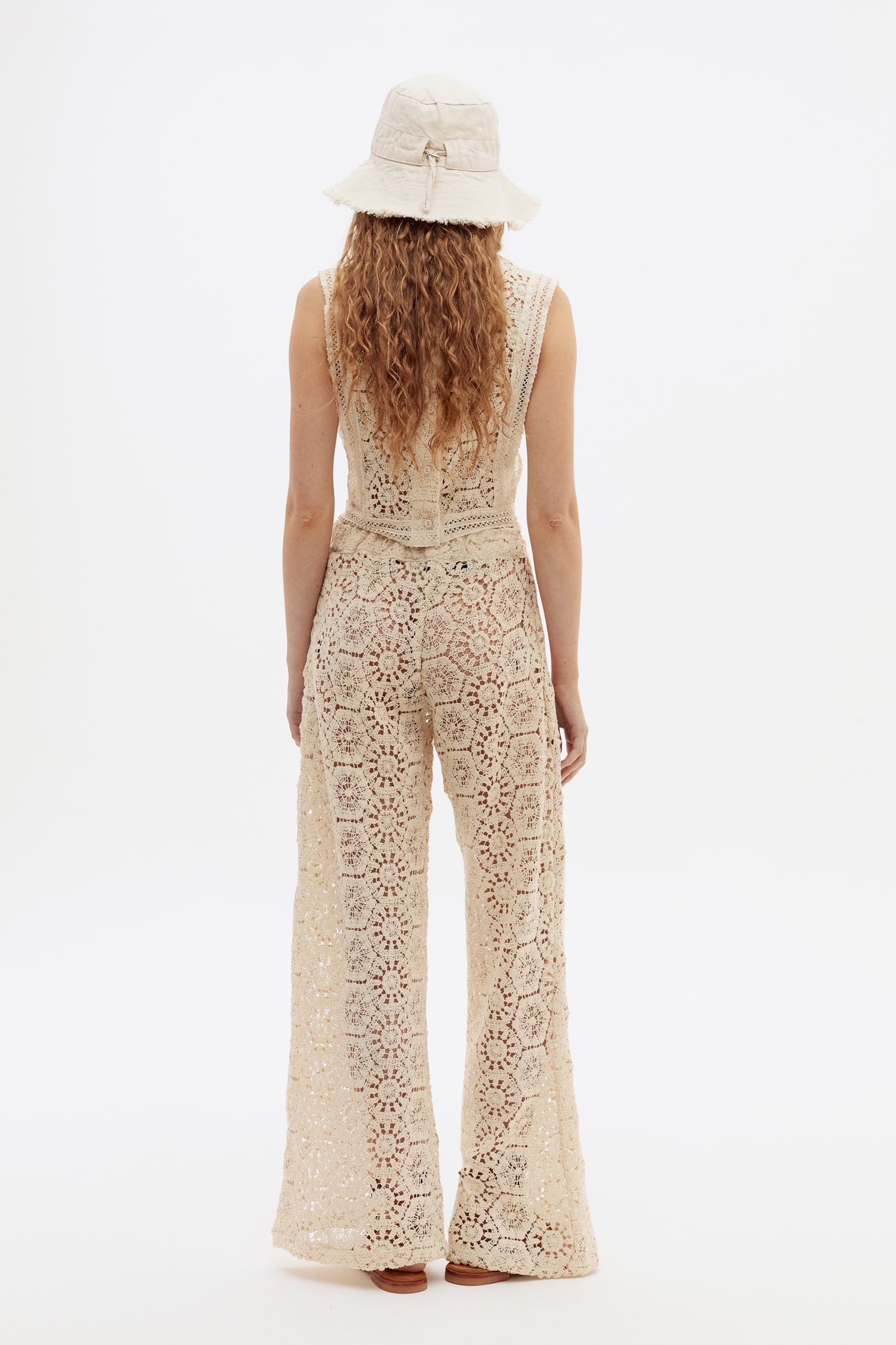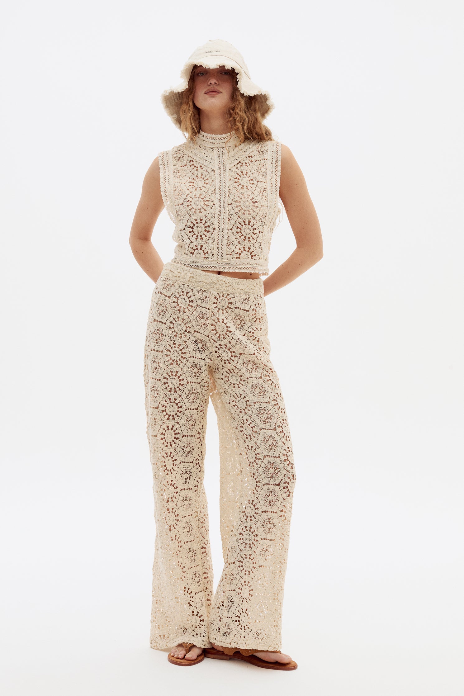 Top en textil tipo tejido crochet con galón a tono ubicado en cuello y en distintas direcciones