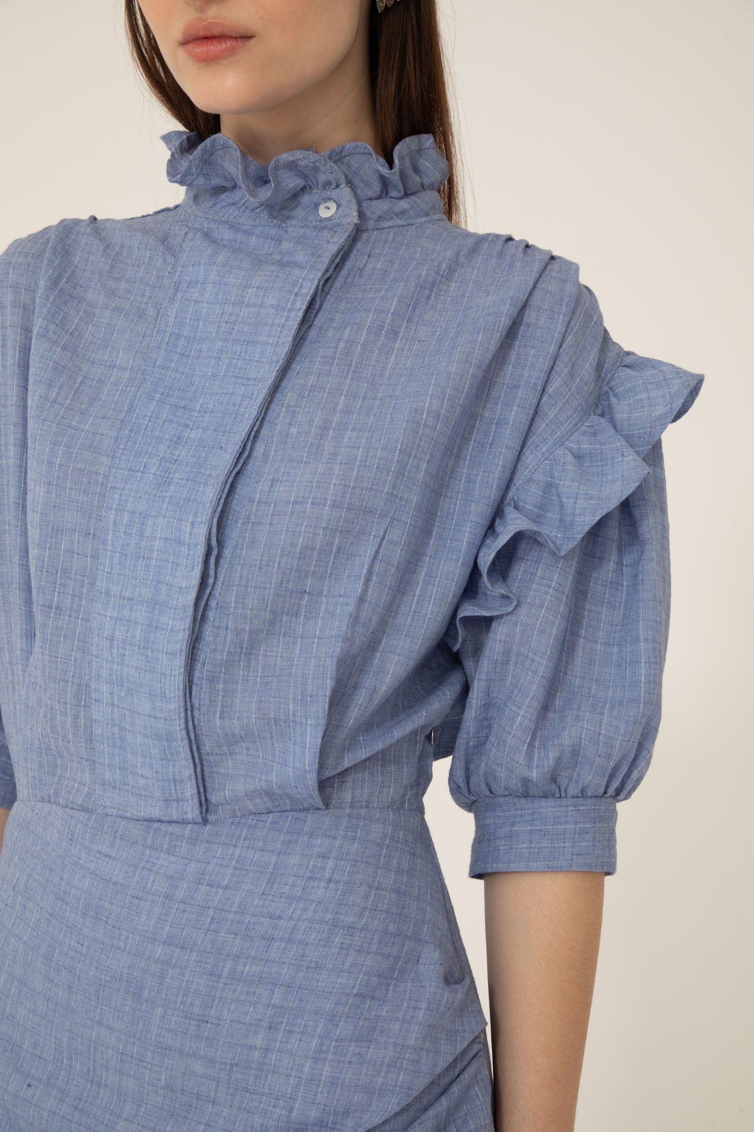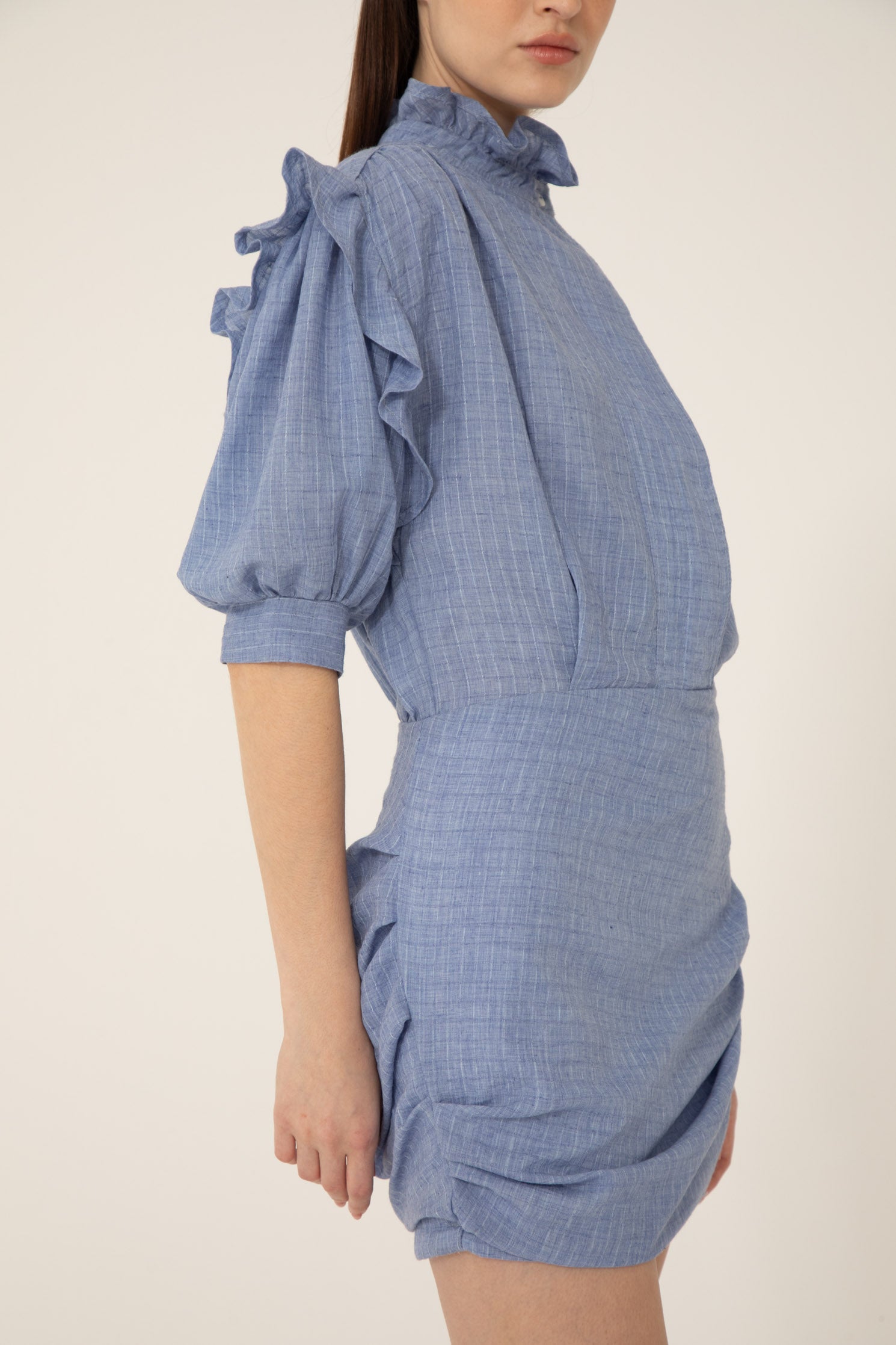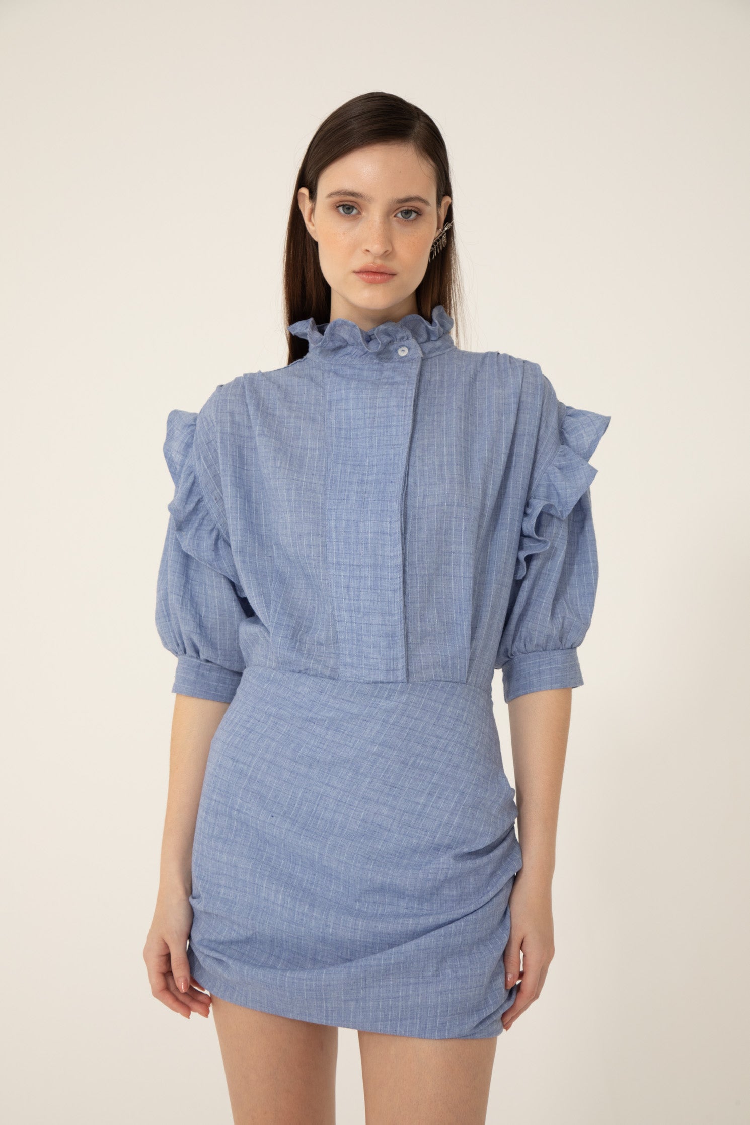 Vestido en algodón fantasía con mangas 3/4 con volados. Tiene cartera oculta con botones en delantero y volados en cuello. La parte de la falda tiene frunces en laterales. Fit recto y largo regular por arriba de la rodilla.